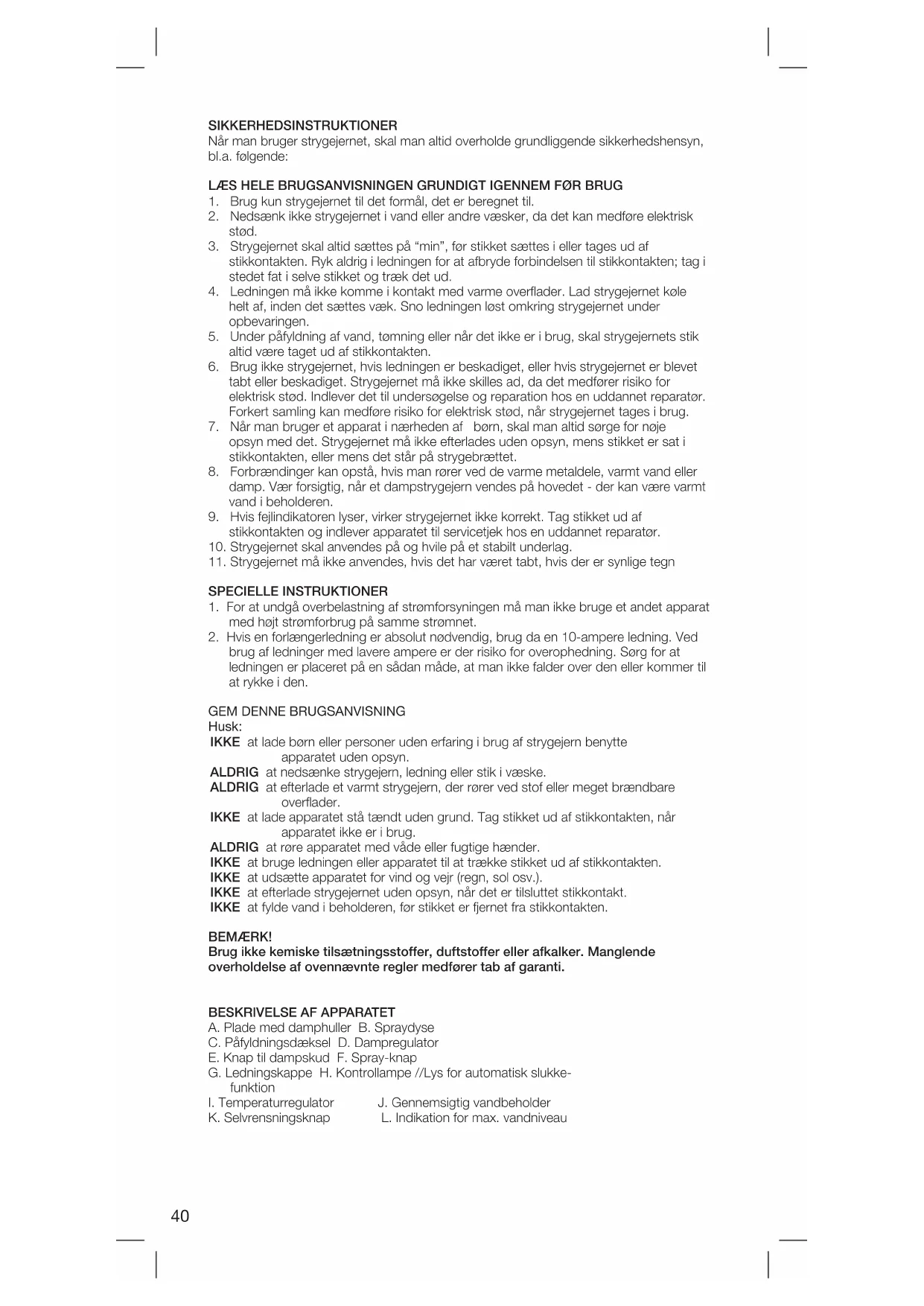 Husk: IKKE at lade børn eller personer uden erfaring i brug af strygejern benytte apparatet uden opsyn. ALDRIG at nedsænke strygejern, ledning eller stik i væske. ALDRIG at efterlade et varmt strygejern, der rører ved stof eller meget brændbare overflader. IKKE at lade apparatet stå tændt uden grund. Tag stikket ud af stikkontakten, når apparatet ikke er i brug. ALDRIG at røre apparatet med våde eller fugtige hænder. IKKE at bruge ledningen eller apparatet til at trække stikket ud af stikkontakten. IKKE at udsætte apparatet for vind og vejr (regn, sol osv.). IKKE at efterlade strygejernet uden opsyn, når det er tilsluttet stikkontakt. IKKE at fylde vand i beholderen, før stikket er fjernet fra stikkontakten. BEMÆRK! Brug ikke kemiske tilsætningsstoffer, duftstoffer eller afkalker. Manglende overholdelse af ovennævnte regler medfører tab af garanti.