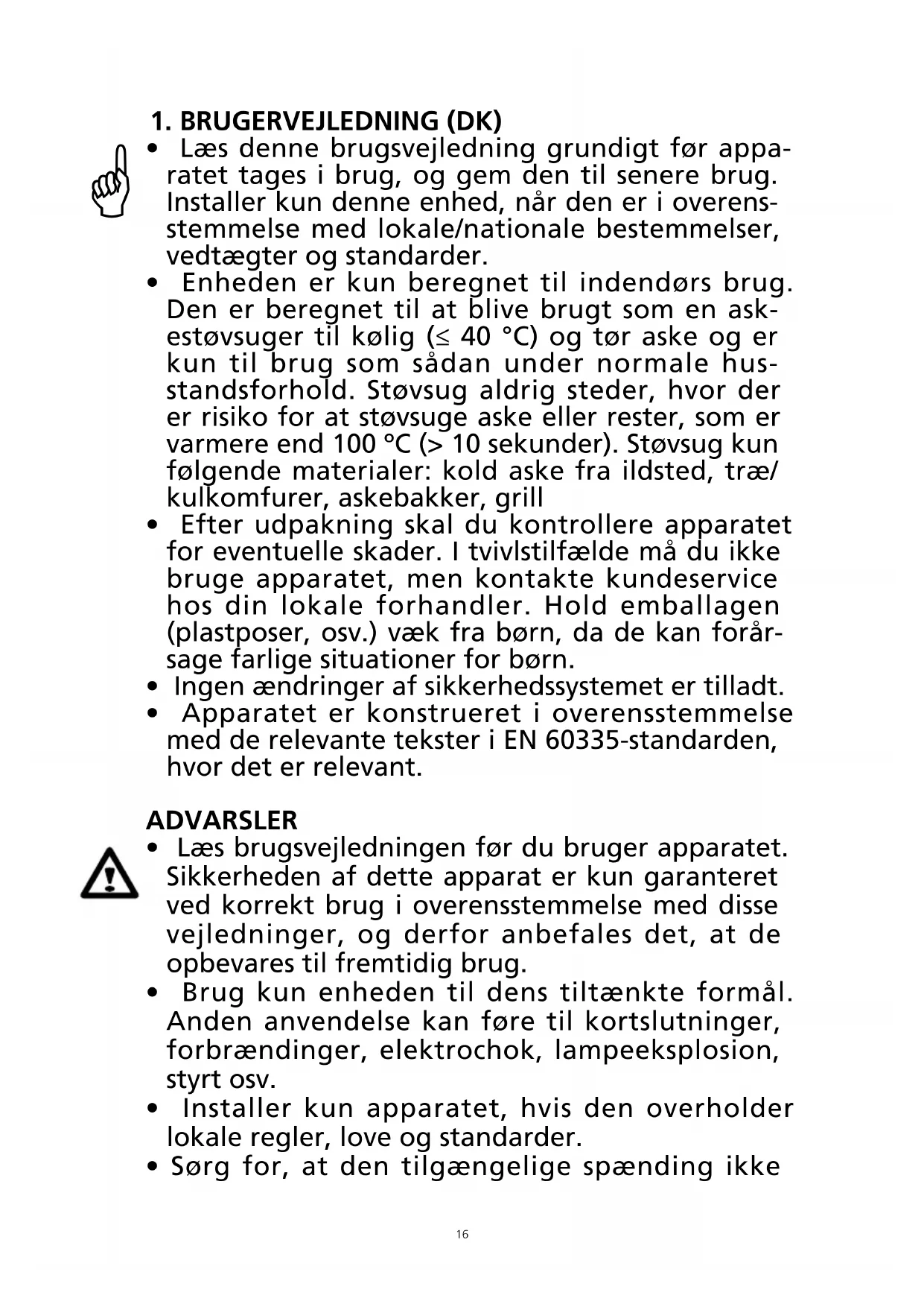 - Enheden er kun beregnet til indendørs brug. Den er beregnet til at blive brugt som en ask- estøvsuger til kølig (≤ 40 °C) og tør aske og er kun til brug som sådan under normale hus- standsforhold. Støvsug aldrig steder, hvor der er risiko for at støvsuge aske eller rester, som er varmere end 100 ºC (> 10 sekunder). Støvsug kun følgende materialer: kold aske fra ildsted, træ/ kulkomfurer, askebakker, grill