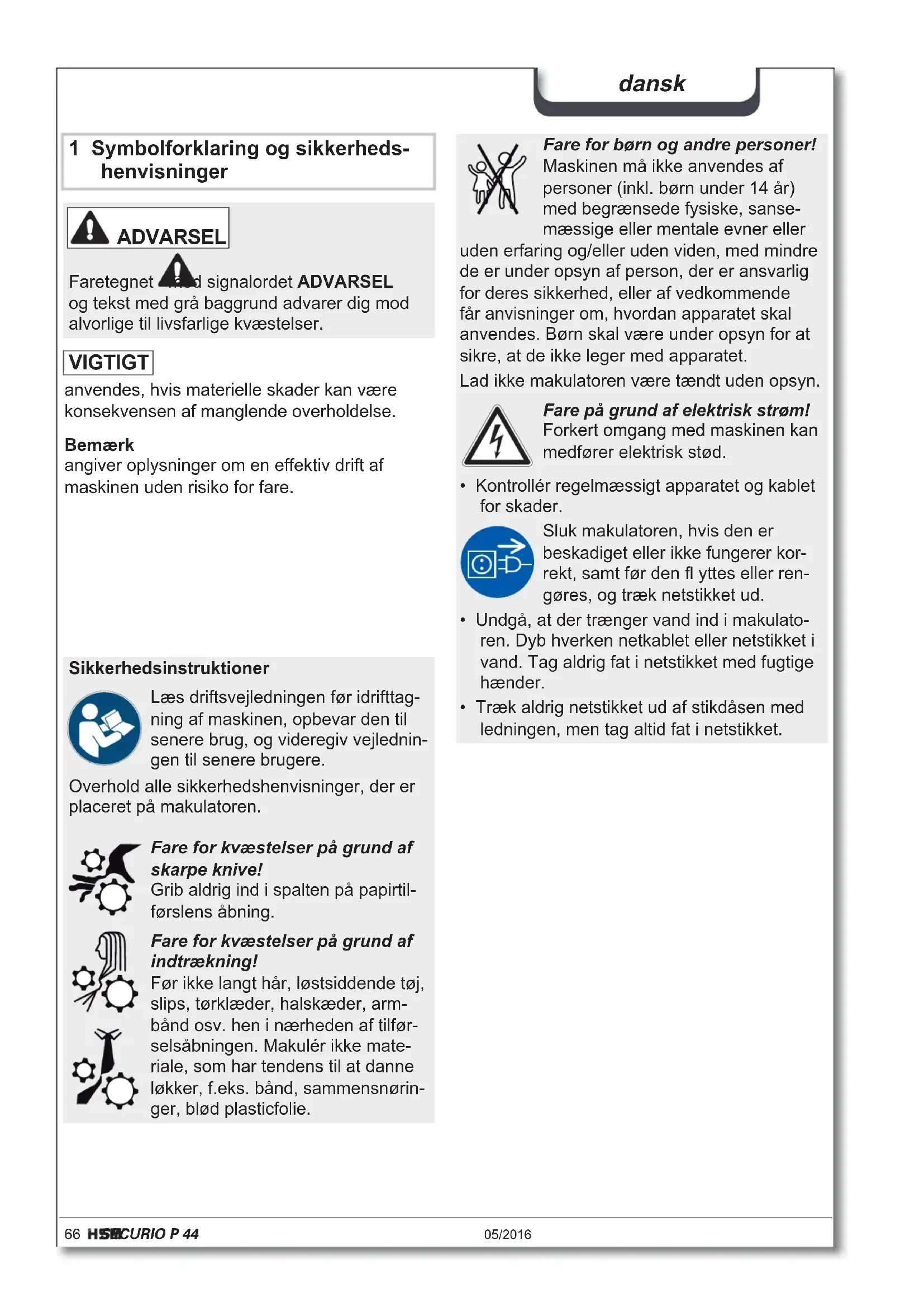 - Het max. aantal bladen (DIN A4, 70 g/m² resp. 80 g/m²), in de lengte aangevoerd, dat in één doorloop gesneden wordt. Het bepalen van de opgegeven capaciteitsgegevens gebeurt met een nieuw, geolied snijwerk en met een koude motor. Een zwakkere netspanning of een andere netfrequentie dan opgegeven, kan tot een geringere capaciteit en tot verhoogde loopgeluiden leiden. Naargelang structuur en eigenschappen van het papier en het soort invoer kan de bladcapaciteit afwijken.66 SECURIO P 44 05/2016 dansk 1 Symbolforklaring og sikkerheds- henvisninger Bemærk angiver oplysninger om en effektiv drift af maskinen uden risiko for fare. ADVARSEL Faretegnet med signalordet ADVARSEL og tekst med grå baggrund advarer dig mod alvorlige til livsfarlige kvæstelser. Sikkerhedsinstruktioner Læs driftsvejledningen før idrifttag- ning af maskinen, opbevar den til senere brug, og videregiv vejlednin- gen til senere brugere. Overhold alle sikkerhedshenvisninger, der er placeret på makulatoren. Fare for kvæstelser på grund af skarpe knive! Grib aldrig ind i spalten på papirtil- førslens åbning. Fare for kvæstelser på grund af indtrækning! Før ikke langt hår, løstsiddende tøj, slips, tørklæder, halskæder, arm- bånd osv. hen i nærheden af tilfør- selsåbningen. Makulér ikke mate- riale, som har tendens til at danne løkker, f.eks. bånd, sammensnørin- ger, blød plasticfolie. Fare for børn og andre personer! Maskinen må ikke anvendes af personer (inkl. børn under 14 år) med begrænsede fysiske, sanse- mæssige eller mentale evner eller uden erfaring og/eller uden viden, med mindre de er under opsyn af person, der er ansvarlig for deres sikkerhed, eller af vedkommende får anvisninger om, hvordan apparatet skal anvendes. Børn skal være under opsyn for at sikre, at de ikke leger med apparatet. Lad ikke makulatoren være tændt uden opsyn. Fare på grund af elektrisk strøm! Forkert omgang med maskinen kan medfører elektrisk stød.