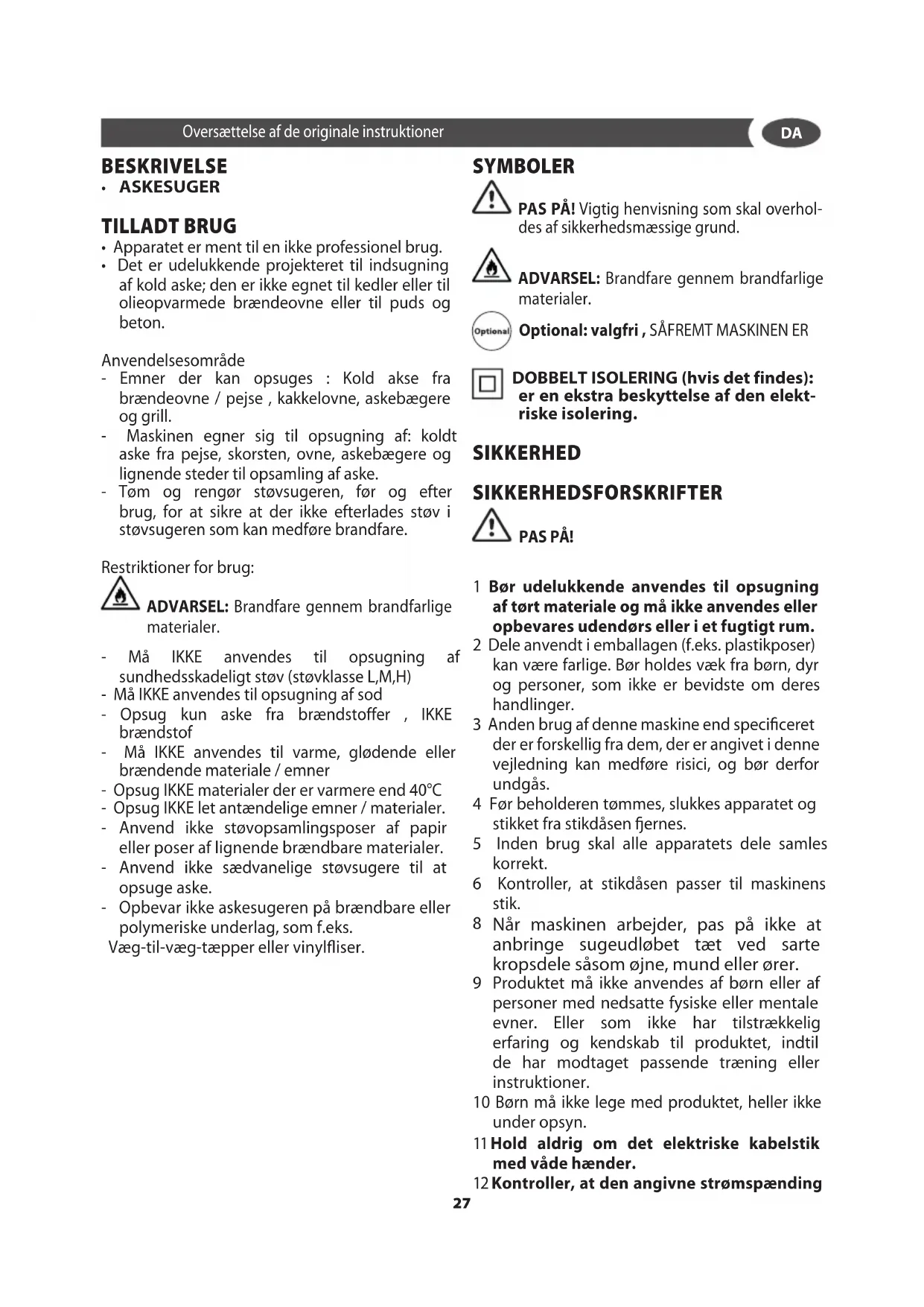 - Det er udelukkende projekteret til indsugning af kold aske; den er ikke egnet til kedler eller til olieopvarmede brændeovne eller til puds og beton. Anvendelsesområde - Emner der kan opsuges : Kold akse fra brændeovne / pejse , kakkelovne, askebægere og grill. - Maskinen egner sig til opsugning af: koldt aske fra pejse, skorsten, ovne, askebægere og lignende steder til opsamling af aske. - Tøm og rengør støvsugeren, før og efter brug, for at sikre at der ikke efterlades støv i støvsugeren som kan medføre brandfare. Restriktioner for brug: ADVARSEL: Brandfare gennem brandfarlige materialer. - Må IKKE anvendes til opsugning af sundhedsskadeligt støv (støvklasse L,M,H) - Må IKKE anvendes til opsugning af sod - Opsug kun aske fra brændstoffer , IKKE brændstof - Må IKKE anvendes til varme, glødende eller brændende materiale / emner - Opsug IKKE materialer der er varmere end 40°C - Opsug IKKE let antændelige emner / materialer.