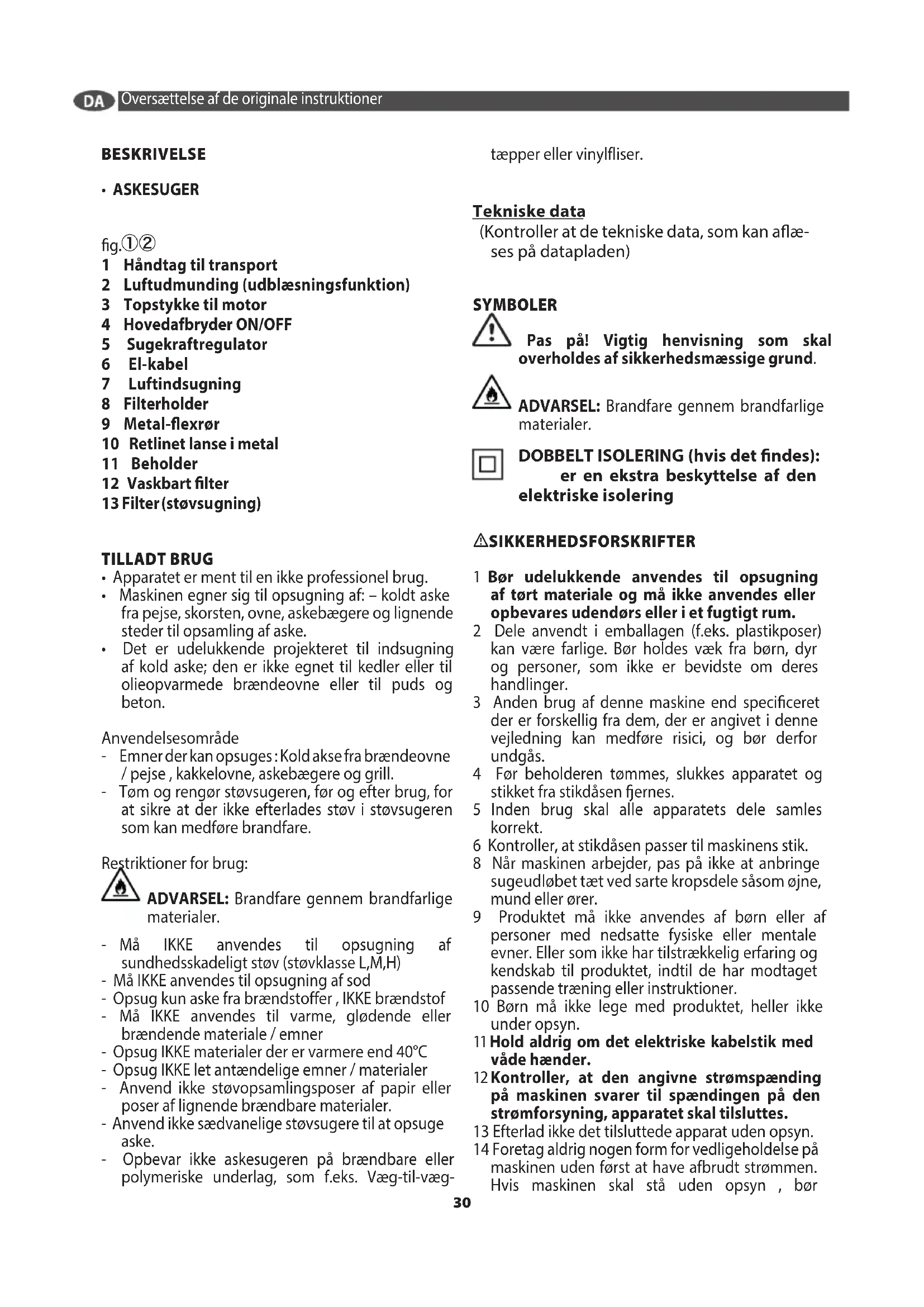 (12) tørre før det monteres tilbage strømmen også være afbrudt. 15 Træk eller løft aldrig apparatet ved hjælp af det elektriske kabel. 16 Sænk ikke apparatet ned i vand for at rengøre det, og brug heller ikke vandspuling på det. 17 Apparatet må ikke anvendes i potentielt fugtige omgivelser (f. eks. i badeværelser). 18 Kontroller omhyggeligt og regelmæssigt at strømkablet, stikket eller andre dele af apparatet ikke er beskadigede. Hvis der ndes skader, kontakt servicecenteret angående reparation. 20 Hvis forlængerkabler anvendes, skal du kontrollere, at de altid hviler på tørre overader og beskyttet mod eventuel vandsprøjt. 21 Brug af forlængerkabler, forbindelseselementer og adaptere, der ikke stemmer overens med de gældende normer, er ikke tilladt. 23 Apparatet skal altid stilles på en plan overade. 24 Undgå at påbegynde arbejdet uden først at montere ltrene, der er bedst egnet til brug. 25 Brug ikke apparatet til at suge vand op fra beholdere, vaske, kar, e.l. 26 Maskinen må ikke anvendes til at opsuge brandfarlige, giftige eller helbredsskadelige materialer. 27 Motorens dæksel må ikke renses med vand, men udelukkende ved brug af en tør klud. 29 Service og reparation må kun udføres af kvalicerede personer. Hvis maskindele går i stykker, må de kun udskiftes med producentens originale reservedele. 30 Producenten kan ikke holdes ansvarlig for skader på personer, dyr eller ting på grund af manglende overholdelse af disse brugsanvisninger eller på grund af utilsigtet brug af apparatet. ADVARSEL: Brandfare gennem brandfarlige materialer.