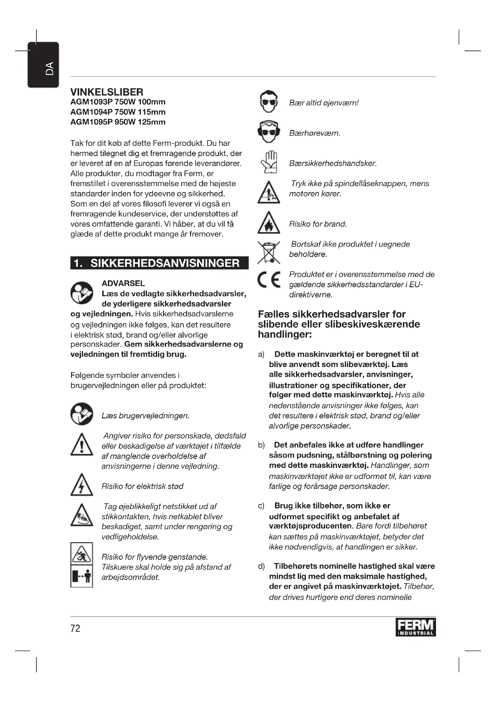 VINKELSLIBER AGM1093P 750W 100mm AGM1094P 750W 115mm AGM1095P 950W 125mm Tak for dit køb af dette Ferm-produkt. Du har hermed tilegnet dig et fremragende produkt, der er leveret af en af Europas førende leverandører. Alle produkter, du modtager fra Ferm, er fremstillet i overensstemmelse med de højeste standarder inden for ydeevne og sikkerhed. Som en del af vores filosofi leverer vi også en fremragende kundeservice, der understøttes af vores omfattende garanti. Vi håber, at du vil få glæde af dette produkt mange år fremover.