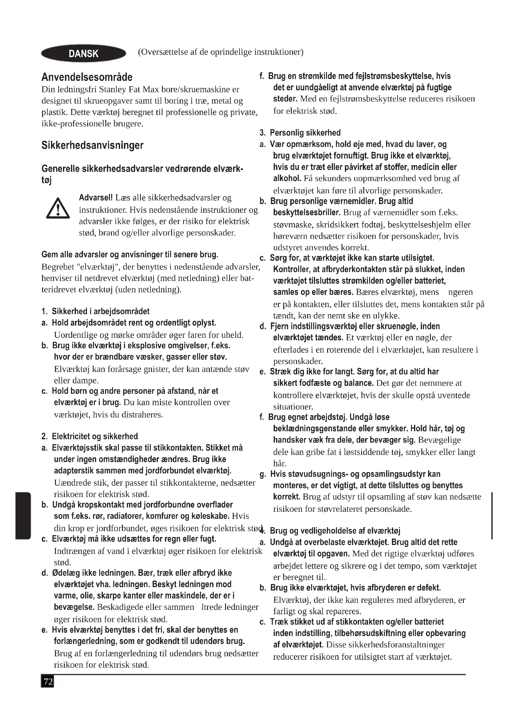 symbolet. u Ved skrueopgaver skal ringen indstilles på den ønskede position. Gå frem på følgende måde, hvis du er usikker på den rigtige indstilling: - Indstil momentjusteringsringen (4) til den laveste momentposition. - Skru den første skrue i. - Hvis det ønskede resultat ikke opnås, skal du øge ringens indstilling og fortsætte med at skrue skruen i. Gentag fremgangsmåden, indtil du nder den rigtige indstilling. Brug samme indstilling til de andre skruer. Hastighedsvælger (g. D) u Ved boring i stål samt ved brug som skruetrækker skal hastighedsvælgeren (8) skubbes hen mod bagenden af værktøjet (1. gear). u Ved boring i andre materialer end stål skal hastigheds- vælgeren (8) skubbes hen mod forenden af værktøjet (2. gear). Boring/iskruning u Vælg forlæns eller baglæns omløb vha. skyderen til skift af retning (2). u Tænd for værktøjet ved at trykke på kontakten (1). Værktøjets hastighed afhænger af, hvor langt du trykker kontakten. u Sluk for værktøjet ved at slippe kontakten. LED-arbejdslys LED-arbejdslyset (7) aktiveres automatisk, når der trykkes på kontakten. LED-arbejdslyset lyser, når kontakten trykkes halvt ned, før apparatet begynder at køre. Gode råd til optimal brug Boring u Udøv altid et let tryk i en lige linje med borebiten. u Reducer trykket på værktøjet, lige før borets spids går gennem den anden side af arbejdsemnet. u Brug en træklods på bagsiden af arbejdsemner, der kan splintre. u Brug spadebor ved boring af huller med stor diameter i træ. u Brug HSS-bor ved boring i metal. u Brug murbor ved boring i bløde mure. u Brug smøremiddel ved boring i andre typer metal end støbejern og messing. u Lav en fordybning med en kørner i midten af det hul, der skal bores, for at forbedre nøjagtigheden. Iskruning u Brug altid den rette type og størrelse skruetrækker. u Prøv at smøre lidt opvaskemiddel eller sæbe på skruen, hvis den er vanskelig at spænde. u Hold altid værktøjet og skruetrækkeren i lige linje med skruen. Vedligeholdelse Dit Stanley Fat Max-værktøj er beregnet til brug gennem lang tid med et minimum af vedligeholdelse. Fortsat tilfredsstillende drift afhænger af korrekt behandling af værktøjet samt regelmæssig rengøring. Laderen kræver ingen vedligeholdelse, men skal rengøres jævnligt. Advarsel! Tag batteriet ud af værktøjet, inden der foretages vedligeholdelse på værktøjet. Træk laderen ud af stikkontak- ten, før den rengøres. u Rens jævnligt værktøjets og laderens ventilationshuller med en blød børste eller en tør klud. u Rens regelmæssigt motorhuset med en fugtig klud. Der må ikke bruges skuremidler eller opløsningsmidler. u Åbn jævnligt patronen, og bank på den for at fjerne støv indvendigt. Miljø