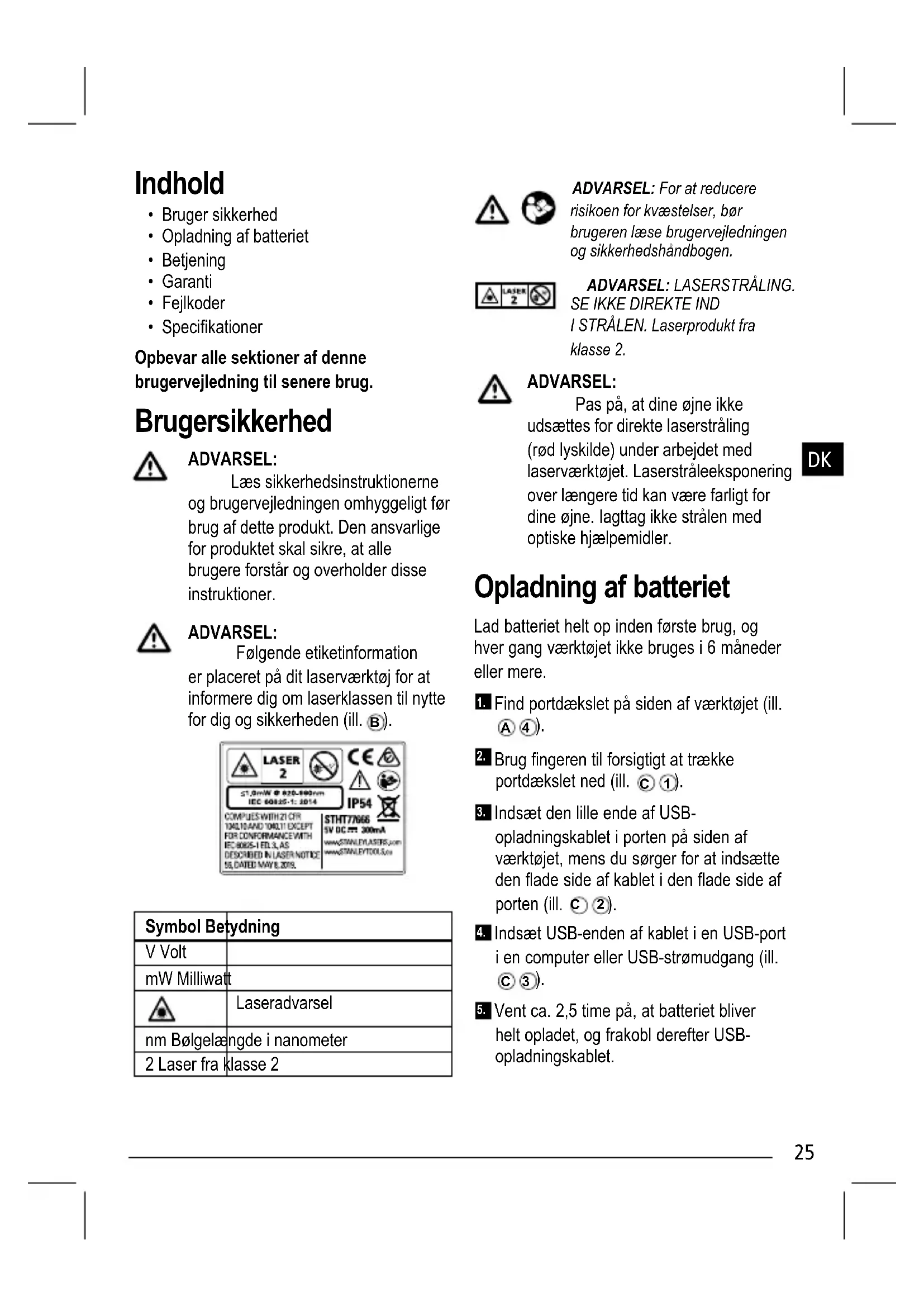 Symbol Betydning V Volt mW Milliwatt Laseradvarsel nm Bølgelængde i nanometer 2 Laser fra klasse 2 ADVARSEL: For at reducere risikoen for kvæstelser, bør brugeren læse brugervejledningen og sikkerhedshåndbogen. ADVARSEL: LASERSTRÅLING.