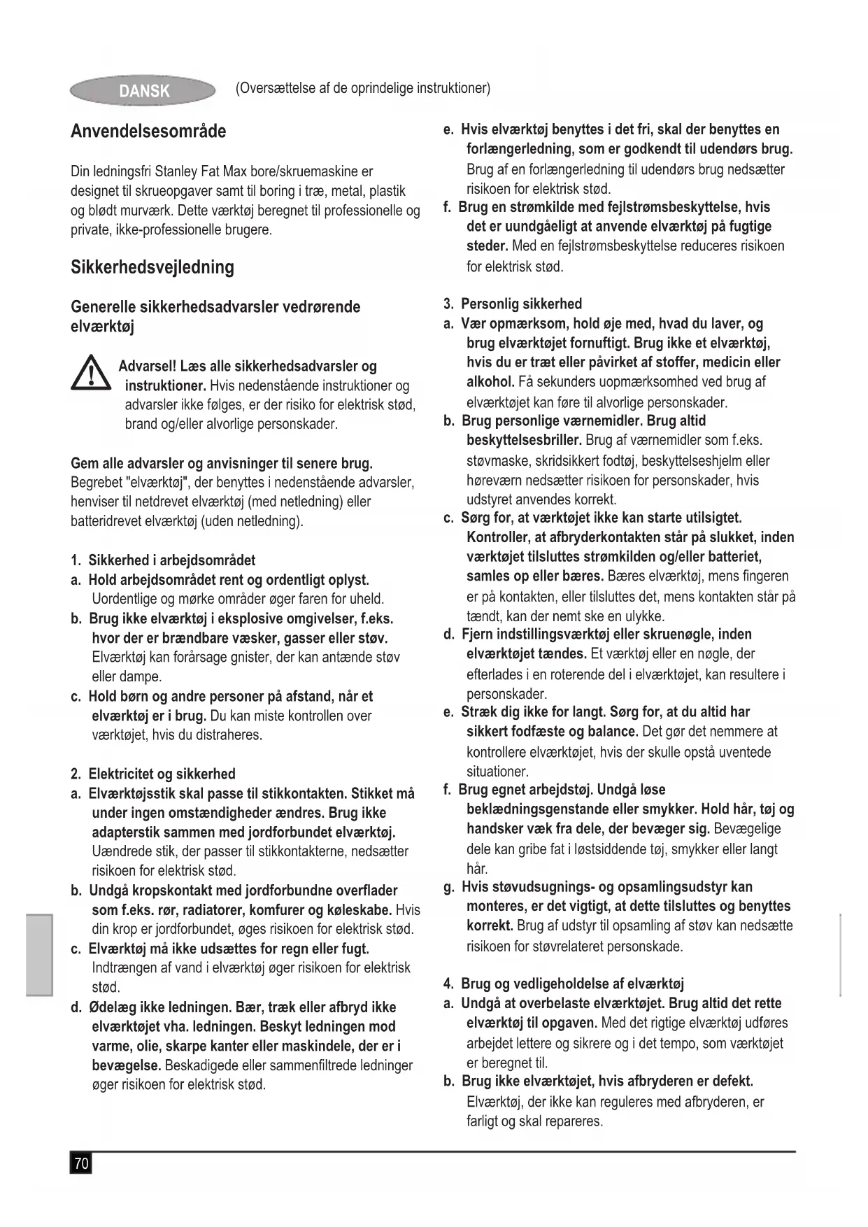 Hvis dit Stanley Fat Max-produkt går i stykker på grund af materiel skade eller fabrikationsfejl inden for 12 måneder fra købsdatoen, påtager Stanley Europe sig gratis at udskifte alle defekte dele eller efter vores skøn gratis at udskifte enheden forudsat at: u Produktet ikke har været anvendt forkert og har været anvendt i overensstemmelse med brugervejledningen. u Produktet ikke har været udsat for andet end almindelig slitage; u Reparationer ikke er udført af uautoriserede personer; u Købsbeviset kan fremvises. u Hele Stanley Fat Max-produktet returneres med alle originale komponenter Hvis du ønsker erstatning for skade, skal du kontakte forhandleren eller det nærmeste autoriserede Stanley Fat Max-værksted i Stanley Fat Max-kataloget eller kontakte dit lokale Stanley-kontor på den adresse, der er opgivet i denne vejledning. Der ndes en liste over alle autoriserede Stanley Fat Max-serviceværksteder samt servicevilkår på følgende internetadresse:www.stanley.eu/377 (Alkuperäisten ohjeiden käännös) SUOMI Käyttötarkoitus Stanley Fat Max -pora/ruuvinväännin on tarkoitettu ruuvien kiinnittämiseen sekä puun, metallin, muovin ja pehmeän betonin poraamiseen. Tämä työkalu on tarkoitettu ammattikäyttöön ja yksityiseen, ei ammattikäyttäjille. Turvallisuusohjeet Sähkötyökalujen yleiset turvavaroitukset