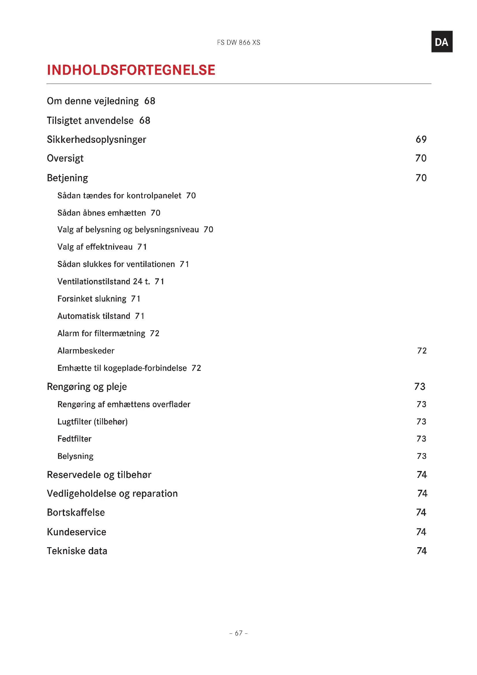 INDHOLDSFORTEGNELSE Om denne vejledning 68 Tilsigtet anvendelse 68 Sikkerhedsoplysninger 69 Oversigt 70 Betjening 70 Sådan tændes for kontrolpanelet 70 Sådan åbnes emhætten 70 Valg af belysning og belysningsniveau 70 Valg af effektniveau 71 Sådan slukkes for ventilationen 71 Ventilationstilstand 24 t. 71 Forsinket slukning 71 Automatisk tilstand 71 Alarm for filtermætning 72 Alarmbeskeder 72 Emhætte til kogeplade-forbindelse 72 Rengøring og pleje 73 Rengøring af emhættens overflader 73 Lugtfilter (tilbehør) 73 Fedtfilter 73 Belysning 73 Reservedele og tilbehør 74 Vedligeholdelse og reparation 74 Bortskaffelse 74 Kundeservice 74 Tekniske data 74FS DW 866 XS – 68 –