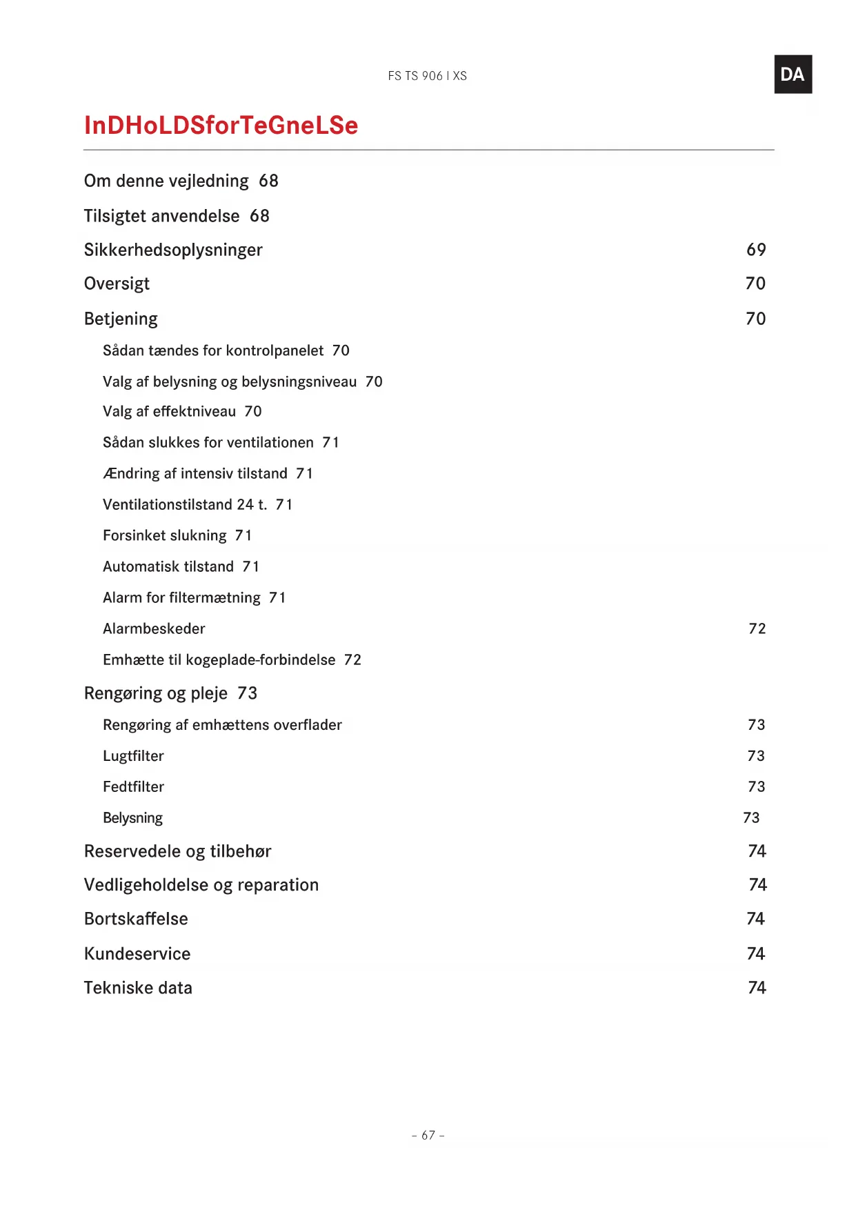 indholdsforTegnelse Om denne vejledning 68 Tilsigtet anvendelse 68 Sikkerhedsoplysninger 69 Oversigt 70 Betjening 70 Sådan tændes for kontrolpanelet 70 Valg af belysning og belysningsniveau 70 Valg af effektniveau 70 Sådan slukkes for ventilationen 71 Ændring af intensiv tilstand 71 Ventilationstilstand 24 t. 71 Forsinket slukning 71 Automatisk tilstand 71 Alarm for filtermætning 71 Alarmbeskeder 72 Emhætte til kogeplade-forbindelse 72 Rengøring og pleje 73 Rengøring af emhættens overflader 73 Lugtfilter 73 Fedtfilter 73 Belysning 73 Reservedele og tilbehør 74 Vedligeholdelse og reparation 74 Bortskaffelse 74 Kundeservice 74 Tekniske data 74FS TS 906 I XS – 68 –