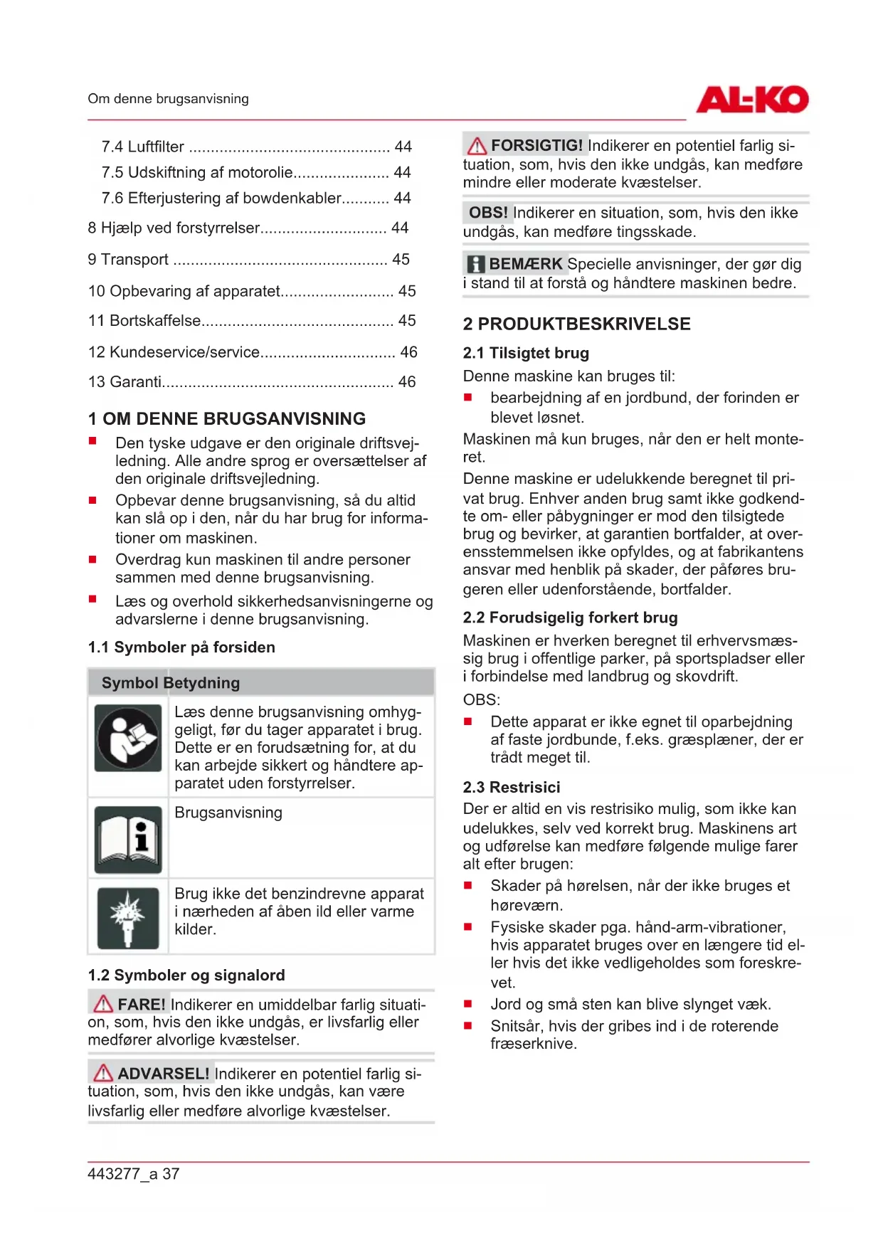 bearbejdning af en jordbund, der forinden er blevet løsnet. Maskinen må kun bruges, når den er helt monte- ret. Denne maskine er udelukkende beregnet til pri- vat brug. Enhver anden brug samt ikke godkend- te om- eller påbygninger er mod den tilsigtede brug og bevirker, at garantien bortfalder, at over- ensstemmelsen ikke opfyldes, og at fabrikantens ansvar med henblik på skader, der påføres bru- geren eller udenforstående, bortfalder.