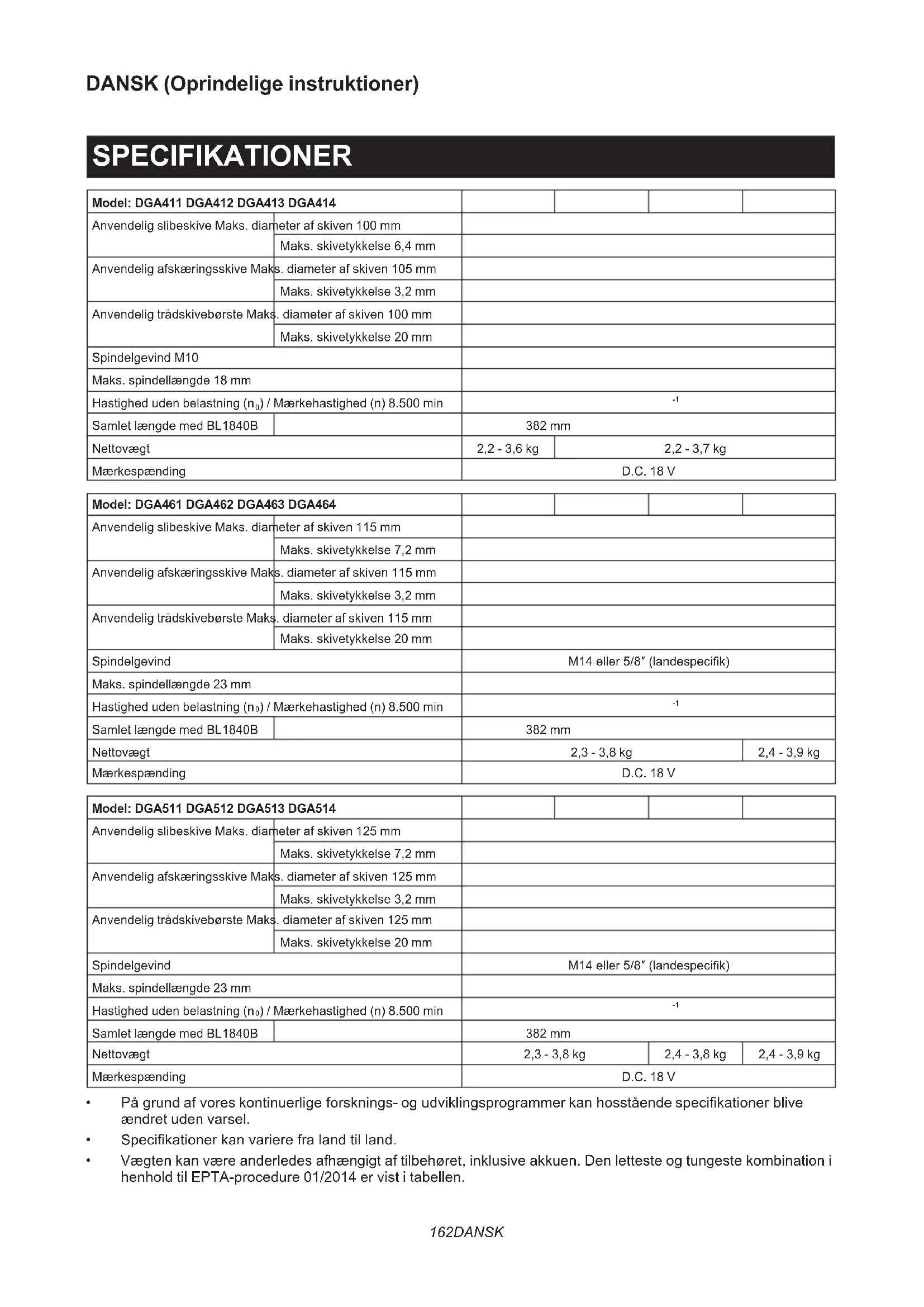 Samlet længde med BL1840B 382 mm Nettovægt 2,2 - 3,6 kg 2,2 - 3,7 kg Mærkespænding D.C. 18 V Model: DGA461 DGA462 DGA463 DGA464 Anvendelig slibeskive Maks. diameter af skiven 115 mm Maks. skivetykkelse 7,2 mm Anvendelig afskæringsskive Maks. diameter af skiven 115 mm Maks. skivetykkelse 3,2 mm Anvendelig trådskivebørste Maks. diameter af skiven 115 mm Maks. skivetykkelse 20 mm Spindelgevind M14 eller 5/8″ (landespecik) Maks. spindellængde 23 mm Hastighed uden belastning (n