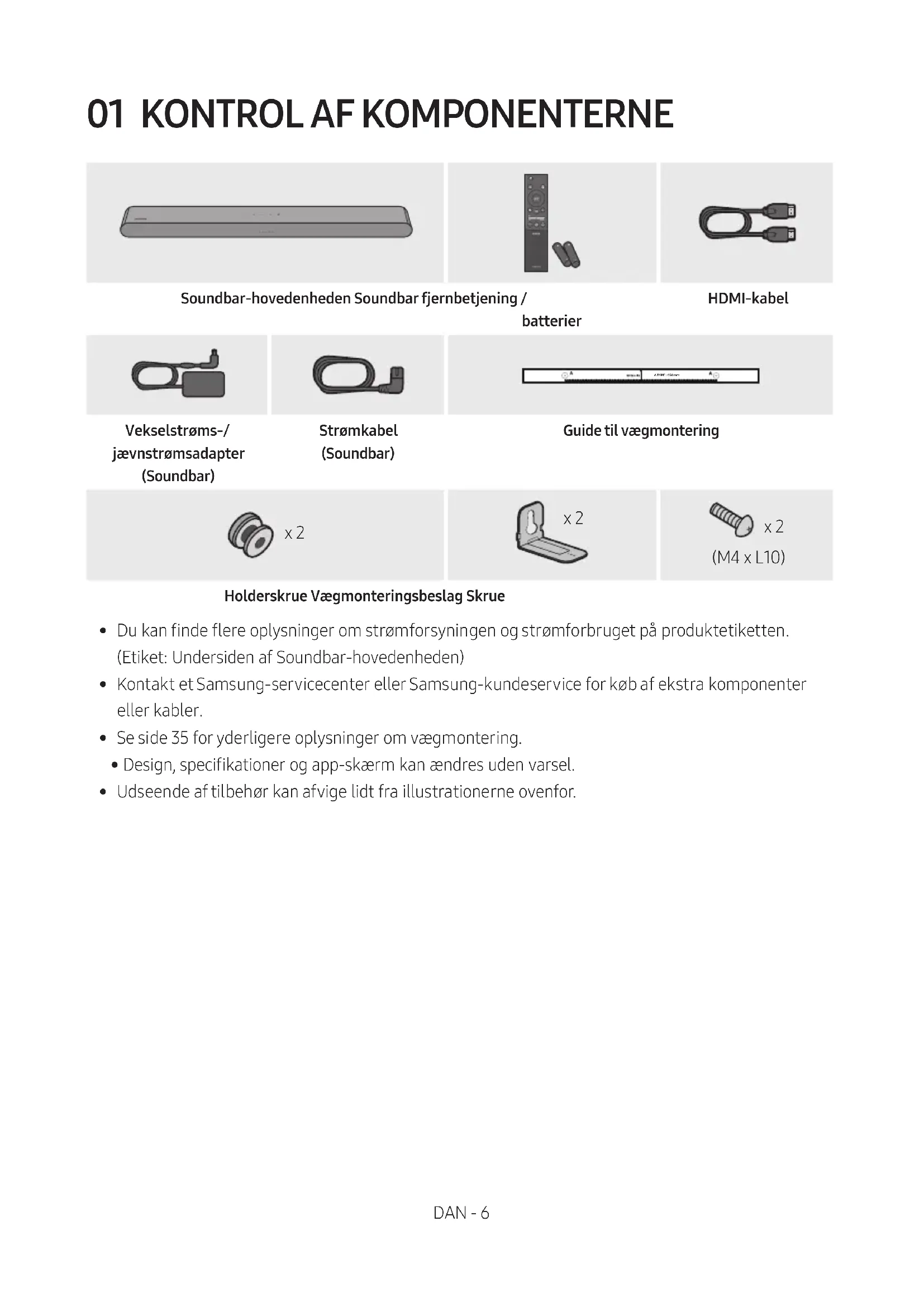 indeholder kemikalier, der er miljøskadelige. Bortskaf ikke batterier sammen med almindeligt husholdningsaffald. Bortskaf ikke batteriet i ild. Batterierne må ikke kortsluttes, adskilles eller overophedes. FORSIGTIG : Der er eksplosionsfare, hvis batterier monteres forkert. Udskift kun med samme eller tilsvarende type.DAN - 4 INDHOLD 01 Kontrol af komponenterne 6 02 Produktoversigt 7 Soundbarens frontpanel/øverste panel ------------------------- 7 Soundbarens bundpanel ------------------------- 9 03 Brug af fjernbetjening 10 Isættelse af batterier før brug af fjernbetjeningen (2 stk. AAA-batterier) ------------------------- 10 Sådan bruger du fjernbetjeningen