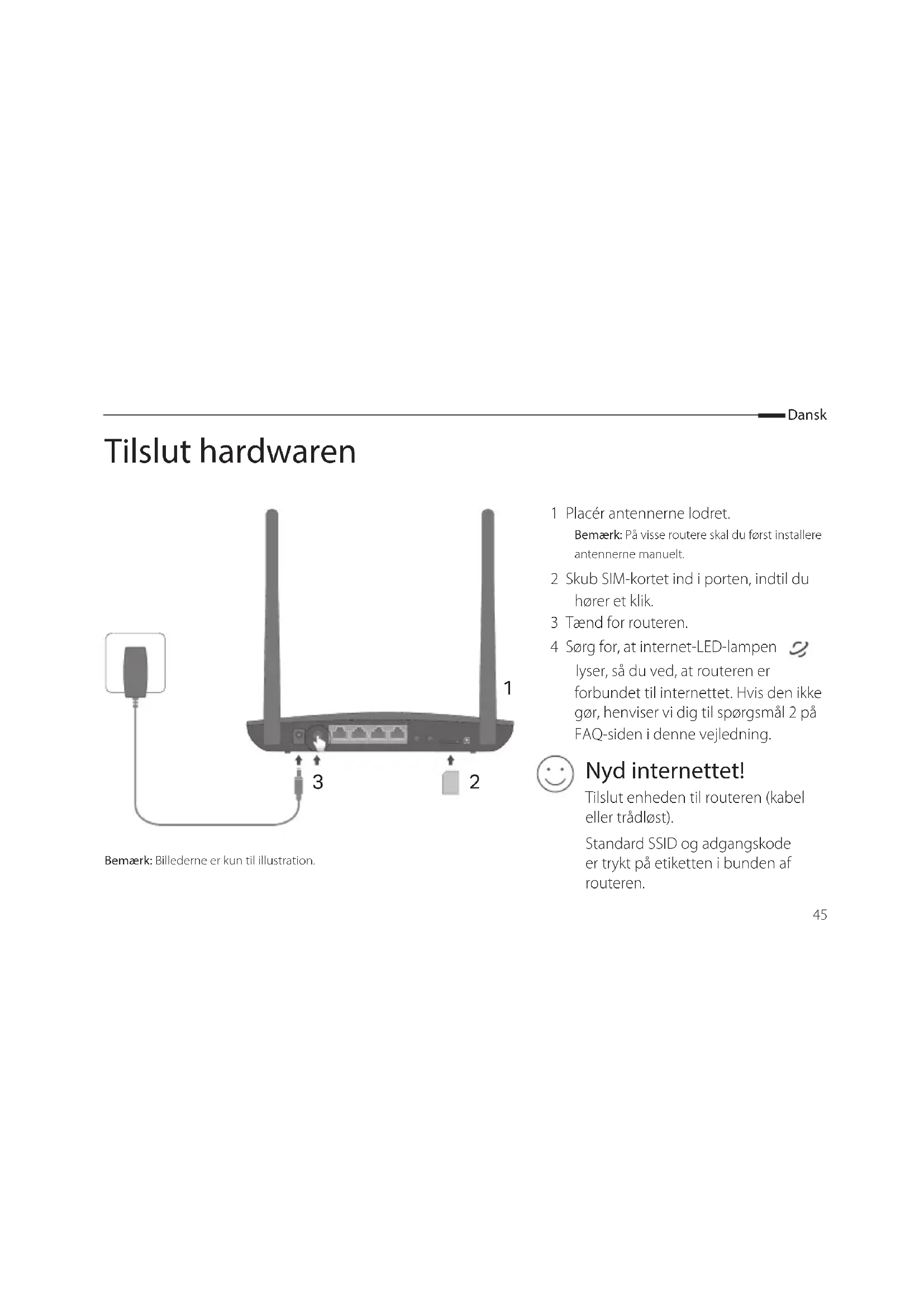 1 Placér antennerne lodret. Bemærk: På visse routere skal du først installere antennerne manuelt. 2 Skub SIM-kortet ind i porten, indtil du hører et klik. 3 Tænd for routeren. 4 Sørg for, at internet-LED-lampen lyser, så du ved, at routeren er forbundet til internettet. Hvis den ikke gør, henviser vi dig til spørgsmål 2 på FAQ-siden i denne vejledning. Tilslut enheden til routeren (kabel eller trådløst). Standard SSID og adgangskode er trykt på etiketten i bunden af routeren. Nyd internettet! Bemærk: Billederne er kun til illustration.46 Dansk Tilpas 4G LTE-routeren 1 Sørg for at computeren er forbundet til routeren (via kabel eller trådløst). 2 Indtast http://tplinkmodem.net eller 192.168.1.1 i adresselinjen i webbrowseren. Baseret på den faktiske loginside for administration: Brug admin til både brugernavn og adgangskode, eller opret en ny adgangskode for at logge ind. 3 Følg trin for trin instruktionerne på siden Quick Setup (hurtig opsætning) for at fuldføre den indledende konfiguration. Bemærk: Routeren kan også bruges (eller konfigureres) som trådløs router til ADSL/kabel-forbindelser. For mere information henvises til brugervejledningen på www.tp-link.com.