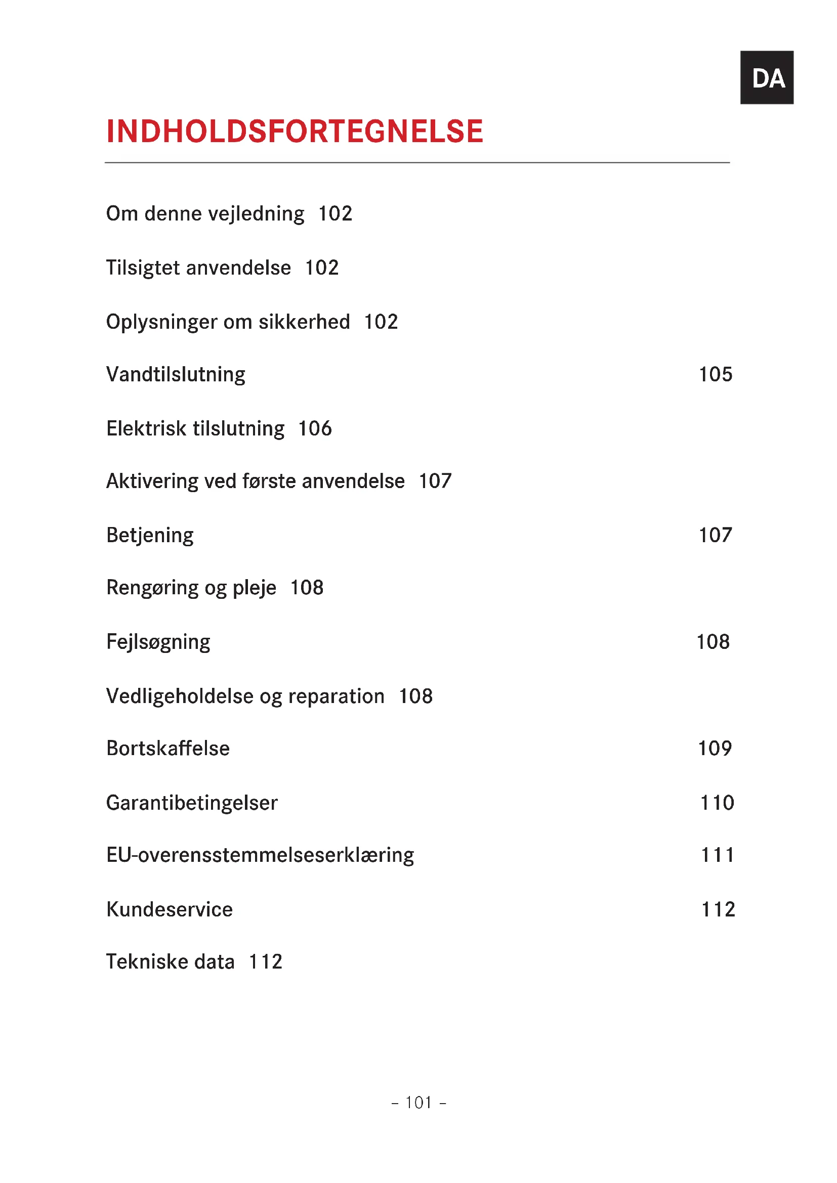 INDHOLDSFORTEGNELSE Om denne vejledning 102 Tilsigtet anvendelse 102 Oplysninger om sikkerhed 102 Vandtilslutning 105 Elektrisk tilslutning 106 Aktivering ved første anvendelse 107 Betjening 107 Rengøring og pleje 108 Fejlsøgning 108 Vedligeholdelse og reparation 108 Bortskaffelse 109 Garantibetingelser 110 EU-overensstemmelseserklæring 111 Kundeservice 112 Tekniske data 112– 102 –