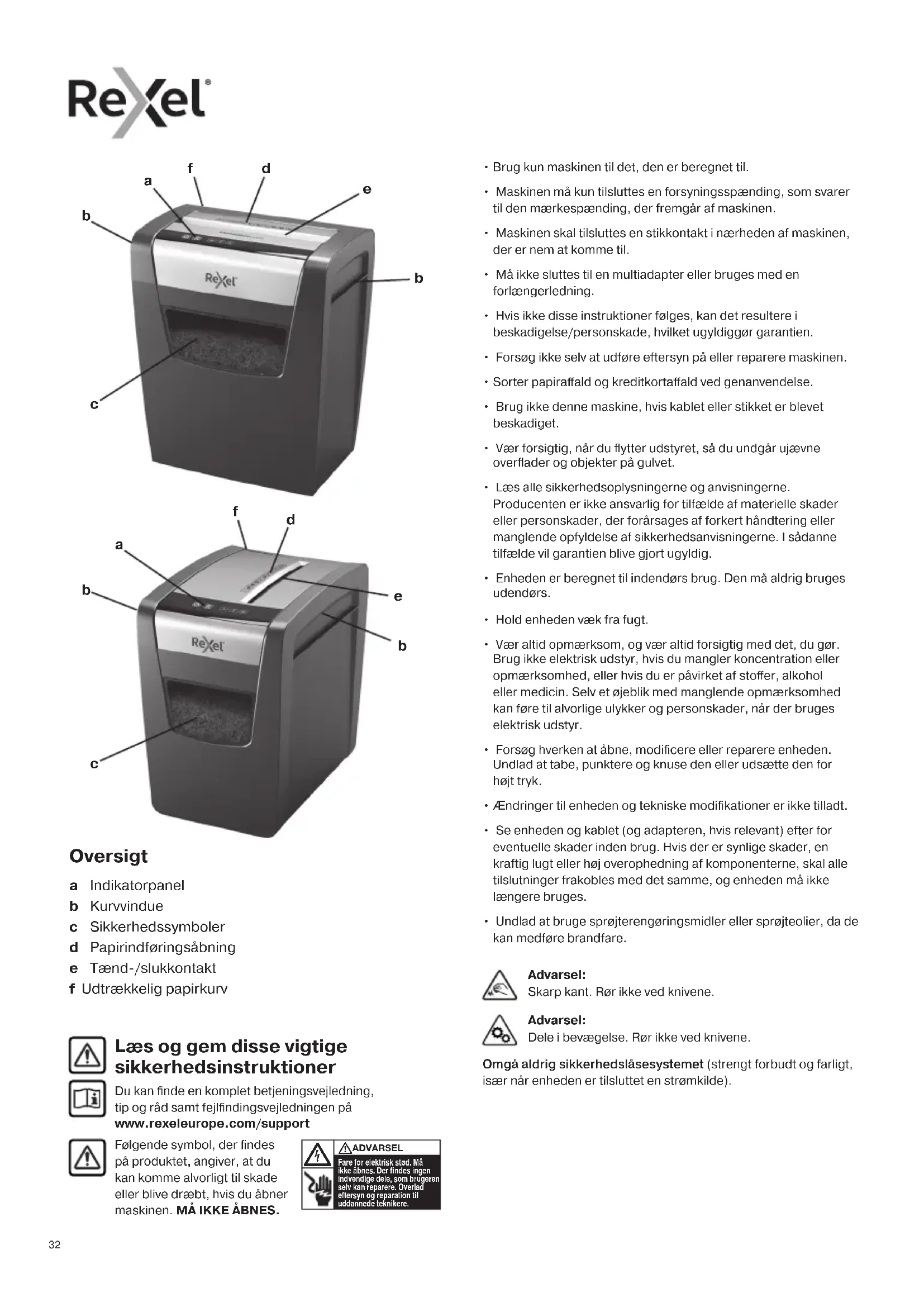 - Papir > 80/100 gsm. Tykt papir eller kort < 200 gsm. Flere sammenfoldede ark (A3-ark, der er foldet på midten). Blankt papir eller et ark med tryk på begge sider. KAN IKKE makulere følgende: Ugeblade eller andre dokumenter, der er indbundet med flere hæfteklammer eller clips. Selvklæbende etiketter Stor clips. Kontroller, at papirclipsen ikke er længere end 32 mm. Store hæfteklammer. Kontroller, at hæfteklammebenlængden ikke er længere end 6 mm. Plastark, laminerede dokumenter, plastomslag. Cd’er og dvd’er Ingen aerosoler Ingen olie Indbundne dokumenter Papirklemmer Kreditkort35 Affald af elektrisk og elektronisk udstyr (WEEE) Når produktet er slidt op, anses det for at være WEEE. I denne forbindelse er det vigtigt at bemærke følgende: WEEE må ikke bortskaes sammen med usorteret husholdningsaald. Det skal indsamles særskilt, så det kan skilles ad med henblik på genanvendelse, genbrug og nyttiggørelse af komponenter og materialer (som brændstof til energiudnyttelse i produktionen af elektricitet). Kommunerne har etableret oentlige indsamlingssteder til indsamling af WEEE gratis for dig. Sørg for at returnere WEEE til det indsamlingsanlæg, der ligger tættest på dit hjem eller din arbejdsplads. Hvis du har problemer med at finde et indsamlingsanlæg, skal den detailforretning, hvor du har købt produktet, tage imod dit WEEE. Hvis du ikke længere har kontakt med detailforretningen, kan du kontakte ACCO for at få vejledning. Genanvendelse af WEEE har til formål at beskytte miljøet, beskytte menneskers sundhed, bevare råstoer, forbedre en bæredygtig udvikling og sikre en bedre råstoorsyning i Den Europæiske Union. Dette skal opnås gennem genvinding af værdifulde sekundære råstoer og reduktion af bortskaelse af aald. Du kan bidrage til et nå disse mål ved at returnere WEEE til et indsamlingsanlæg. Dit produkt er mærket med WEEE-symbolet (skraldespand med et X over). Dette symbol er beregnet til at informere dig om, at WEEE ikke må bortskaes som usorteret husholdningsaald. Garanti Denne maskines drift er garanteret i to år fra købsdatoen, på betingelse af at den anvendes under normale betingelser. Inden for garantiperioden vil ACCO Brands Europe efter eget skøn enten reparere eller erstatte den defekte maskine gratis. Defekter forårsaget af misbrug eller brug til upassende formål er ikke dækket af garantien. Der kræves bevis for købsdatoen. Reparationer eller ændringer foretaget af personer, som ikke er autoriseret af ACCO Brands Europe, vil ugyldiggøre garantien. Det er vores mål at sikre, at vores produkters ydeevne lever op til de angivne specifikationer. Denne garanti påvirker ikke juridiske rettigheder, som forbrugere har under gældende national lovgivning vedrørende salg af varer.36 Oversikt a Indikatorpanel b Visningsvindu på papirkurv c Sikkerhetssymboler d Innmatingsåpning e På/av-bryter f Uttrekkbar papirkurv