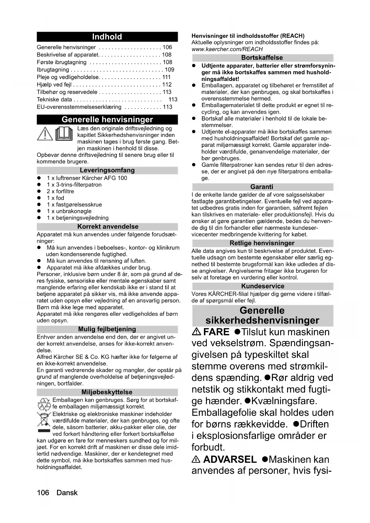 - dB(A) 37 - 65 Vekt kg 13 Høyde mm 1120 Diameter fotstykke mm 320 Omgivelsestemperatur °C 10 - 30 Relativ luftfuktighet % 20 - 80 Chairman of the Board of ManagementDirector Regulatory Affairs & Certification H. Jenner S. Reiser106 Dansk Indhold Generelle henvisninger Læs den originale driftsvejledning og kapitlet Sikkerhedshenvisninger inden maskinen tages i brug første gang. Bet- jen maskinen i henhold til disse. Opbevar denne driftsvejledning til senere brug eller til kommende brugere. Leveringsomfang 1 x luftrenser Kärcher AFG 100 1 x 3-trins-filterpatron 2 x forfiltre 1 x fod 1 x fastgørelsesskrue 1 x unbrakonøgle 1 x betjeningsvejledning Korrekt anvendelse Apparatet må kun anvendes under følgende forudsæt- ninger: Må kun anvendes i beboelses-, kontor- og klinikrum uden kondenserende fugtighed. Må kun anvendes til rensning af luften. Apparatet må ikke afdækkes under brug. Personer, inklusive børn under 8 år, som på grund af de- res fysiske, sensoriske eller mentale egenskaber samt manglende erfaring eller kendskab ikke er i stand til at betjene apparatet på sikker vis, må ikke anvende appa- ratet uden opsyn eller vejledning af en ansvarlig person. Børn må ikke lege med apparatet. Apparatet må ikke rengøres eller vedligeholdes af børn uden opsyn. Mulig fejlbetjening Enhver anden anvendelse end den, der er angivet un- der korrekt anvendelse, anses for ikke-korrekt anven- delse. Alfred Kärcher SE & Co. KG hæfter ikke for følgerne af en ikke-korrekt anvendelse. En garanti vedrørende skader og mangler, der opstår på grund af manglende overholdelse af betjeningsvejled- ningen, bortfalder. Miljøbeskyttelse Emballagen kan genbruges. Sørg for at bortskaf- fe emballagen miljømæssigt korrekt. Elektriske og elektroniske maskiner indeholder værdifulde materialer, der kan genbruges, og ofte dele, såsom batterier, akku-pakker eller olie, der ved forkert håndtering eller forkert bortskaffelse kan udgøre en fare for menneskers sundhed og for mil- jøet. For en korrekt drift af maskinen er disse dele imid- lertid nødvendige. Maskiner, der er kendetegnet med dette symbol, må ikke bortskaffes sammen med hus- holdningsaffaldet. Henvisninger til indholdsstoffer (REACH) Aktuelle oplysninger om indholdsstoffer findes på: www.kaercher.com/REACH Bortskaffelse Udtjente apparater, batterier eller strømforsynin- ger må ikke bortskaffes sammen med hushold- ningsaffaldet! Emballagen, apparatet og tilbehøret er fremstillet af materialer, der kan genbruges, og skal bortskaffes i overensstemmelse hermed. Emballagematerialet til dette produkt er egnet til re- cycling, og kan anvendes igen. Bortskaf alle materialer i henhold til de lokale be- stemmelser. Udtjente el-apparater må ikke bortskaffes sammen med husholdningsaffaldet! Bortskaf det gamle ap- parat miljømæssigt korrekt. Gamle apparater inde- holder værdifulde, genanvendelige materialer, der bør genbruges. Gamle filterpatroner kan sendes retur til den adres- se, der er angivet på den nye filterpatrons emballa- ge. Garanti I de enkelte lande gælder de af vore salgsselskaber fastlagte garantibetingelser. Eventuelle fejl ved appara- tet udbedres gratis inden for garantien, såfremt fejlen kan tilskrives en materiale- eller produktionsfejl. Hvis du ønsker at gøre garantien gældende, bedes du henven- de dig til din forhandler eller nærmeste kundeser- vicecenter medbringende kvittering for købet. Retlige henvisninger Alle data angives kun til beskrivelse af produktet. Even- tuelle udsagn om bestemte egenskaber eller særlig eg- nethed til bestemte brugsformål kan ikke udledes af dis- se angivelser. Angivelserne fritager ikke brugeren for selv at foretage en vurdering eller kontrol. Kundeservice Vores KÄRCHER-filial hjælper dig gerne videre i tilfæl- de af spørgsmål eller fejl. Generelle sikkerhedshenvisninger FARE Tilslut kun maskinen ved vekselstrøm. Spændingsan- givelsen på typeskiltet skal stemme overens med strømkil- dens spænding. Rør aldrig ved netstik og stikkontakt med fugti- ge hænder. Kvælningsfare. Emballagefolie skal holdes uden for børns rækkevidde. Driften i eksplosionsfarlige områder er forbudt. 몇 ADVARSEL Maskinen kan anvendes af personer, hvis fysi- Generelle henvisninger p. 106