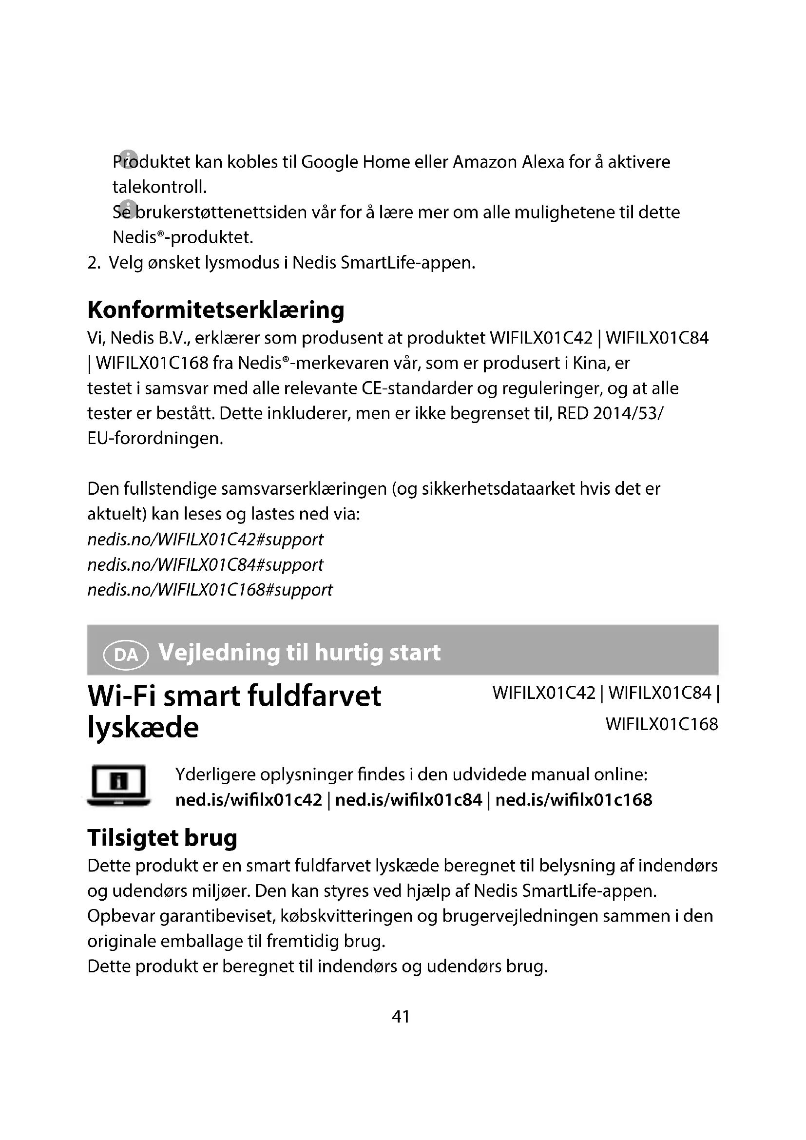 Overensstemmelseserklæring Vi, Nedis B.V. erklærer som producent, at produktet WIFILX01C42 | WIFILX01C84 | WIFILX01C168 fra vores brand Nedis®, produceret i Kina, er blevet testet i overensstemmelse med alle relevante CE-standarder og regler, og at alle test er beståede. Dette indebærer også direktiv 2014/53/EU (radioudstyrsdirektivet).45 Den komplette overensstemmelseserklæring (og sikkerhedsdatabladet, hvis gældende) kan ndes og downloades via: nedis.dk/WIFILX01C42#support nedis.dk/WIFILX01C84#support nedis.dk/WIFILX01C168#support