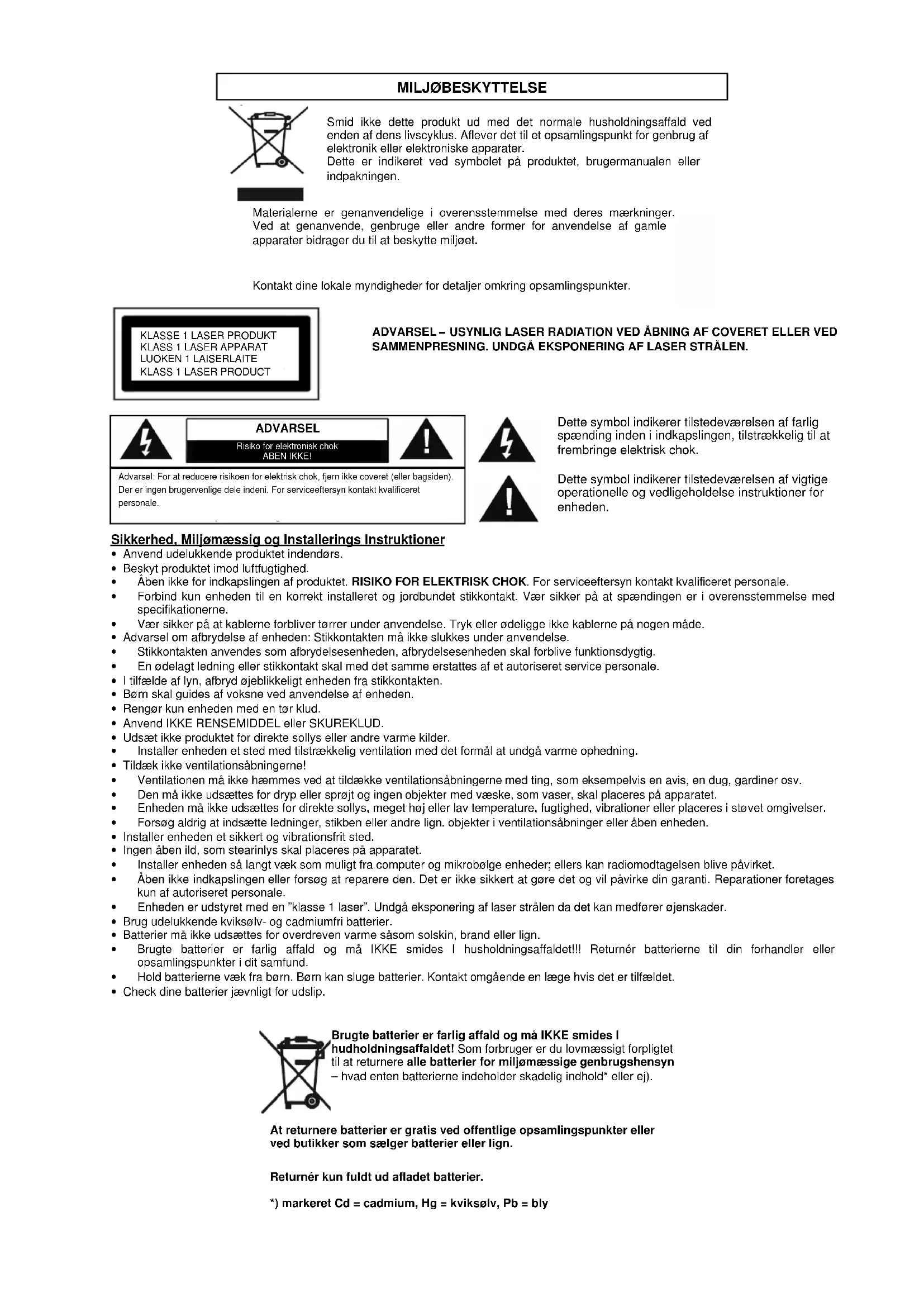 Advarsel: For at reducere risikoen for elektrisk chok, fjern ikke coveret (eller bagsiden). Der er ingen brugervenlige dele indeni. For serviceeftersyn kontakt kvalificeret personale. Brugte batterier er farlig affald og må IKKE smides I hudholdningsaffaldet! Som forbruger er du lovmæssigt forpligtet til at returnere alle batterier for miljømæssige genbrugshensyn – hvad enten batterierne indeholder skadelig indhold* eller ej).