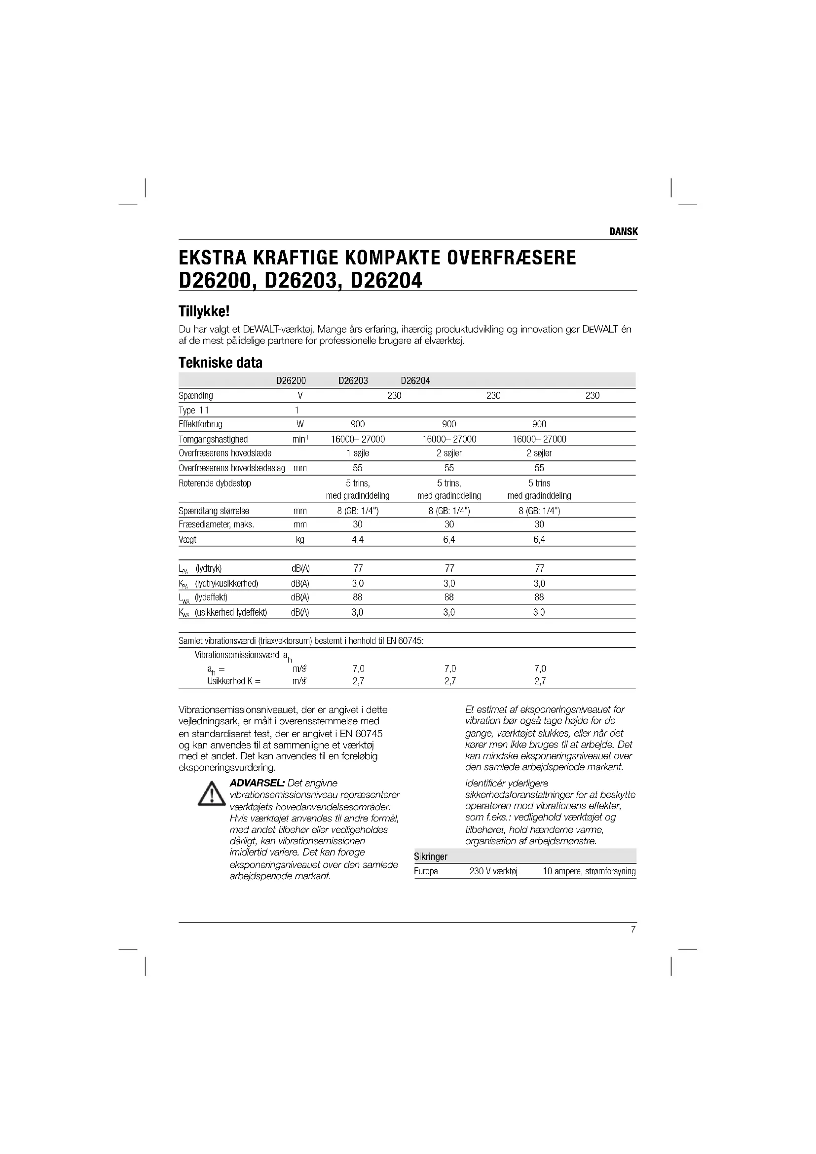 D26200, D26203, D26204 Vibrationsemissionsniveauet, der er angivet i dette vejledningsark, er målt i overensstemmelse med en standardiseret test, der er angivet i EN 60745 og kan anvendes til at sammenligne et værktøj med et andet. Det kan anvendes til en foreløbig eksponeringsvurdering. ADVARSEL: Det angivne vibrationsemissionsniveau repræsenterer værktøjets hovedanvendelsesområder. Hvis værktøjet anvendes til andre formål, med andet tilbehør eller vedligeholdes dårligt, kan vibrationsemissionen imidlertid variere. Det kan forøge eksponeringsniveauet over den samlede arbejdsperiode markant. Et estimat af eksponeringsniveauet for vibration bør også tage højde for de gange, værktøjet slukkes, eller når det kører men ikke bruges til at arbejde. Det kan mindske eksponeringsniveauet over den samlede arbejdsperiode markant. Identificér yderligere sikkerhedsforanstaltninger for at beskytte operatøren mod vibrationens effekter, som f.eks.: vedligehold værktøjet og tilbehøret, hold hænderne varme, organisation af arbejdsmønstre. Sikringer Europa 230 V værktøj 10 ampere, strømforsyningDANSK