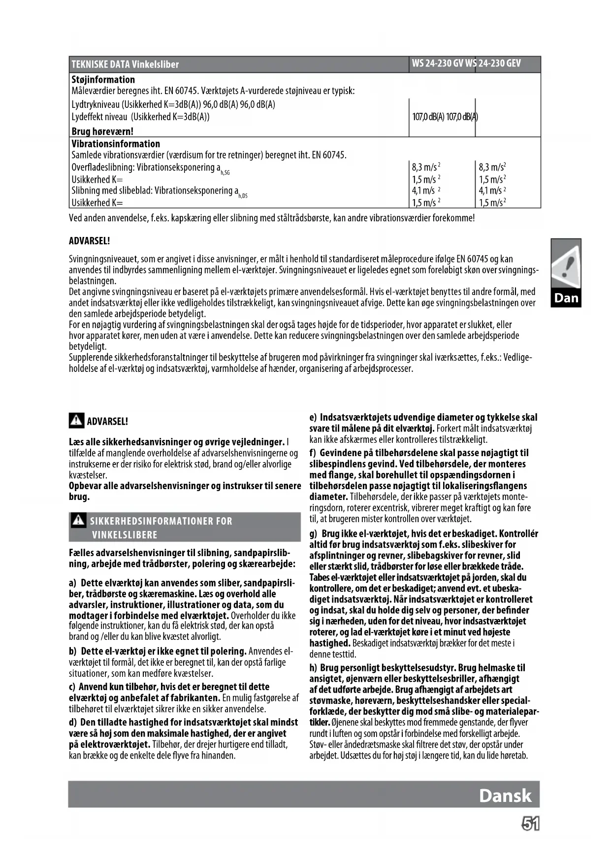 D= Slibeskive-Ø maks. d= borings-ø 230 mm 22,2 mm 230 mm 22,2 mm b= Skæreskive tykkelse min. / maks. 1,9 / 3 mm 1,9 / 3 mm b= Slibeskivetykkelse maks. 8 mm 8 mm D= Slibeadens diameter maks. 230 mm 230 mm D= Kopbørstens diameter maks. 100 mm 100 mm Spindelgevind M 14 M 14 Vægt svarer til EPTA-procedure 01/2003 5,6 kg 5,6 kg Dan51 Dan Dansk ADVARSEL! Læs alle sikkerhedsanvisninger og øvrige vejledninger. I tilfælde af manglende overholdelse af advarselshenvisningerne og instrukserne er der risiko for elektrisk stød, brand og/eller alvorlige kvæstelser. Opbevar alle advarselshenvisninger og instrukser til senere brug. SIKKERHEDSINFORMATIONER FOR VINKELSLIBERE Fælles advarselshenvisninger til slibning, sandpapirslib- ning, arbejde med trådbørster, polering og skærearbejde: a) Dette elværktøj kan anvendes som sliber, sandpapirsli- ber, trådbørste og skæremaskine. Læs og overhold alle advarsler, instruktioner, illustrationer og data, som du modtager i forbindelse med elværktøjet. Overholder du ikke følgende instruktioner, kan du få elektrisk stød, der kan opstå brand og /eller du kan blive kvæstet alvorligt. b) Dette el-værktøj er ikke egnet til polering. Anvendes el- værktøjet til formål, det ikke er beregnet til, kan der opstå farlige situationer, som kan medføre kvæstelser. c) Anvend kun tilbehør, hvis det er beregnet til dette elværktøj og anbefalet af fabrikanten. En mulig fastgørelse af tilbehøret til elværktøjet sikrer ikke en sikker anvendelse. d) Den tilladte hastighed for indsatsværktøjet skal mindst være så høj som den maksimale hastighed, der er angivet på elektroværktøjet. Tilbehør, der drejer hurtigere end tilladt, kan brække og de enkelte dele yve fra hinanden. e) Indsatsværktøjets udvendige diameter og tykkelse skal svare til målene på dit elværktøj. Forkert målt indsatsværktøj kan ikke afskærmes eller kontrolleres tilstrækkeligt. f) Gevindene på tilbehørsdelene skal passe nøjagtigt til slibespindlens gevind. Ved tilbehørsdele, der monteres med ange, skal borehullet til opspændingsdornen i tilbehørsdelen passe nøjagtigt til lokaliseringsangens diameter. Tilbehørsdele, der ikke passer på værktøjets monte- ringsdorn, roterer excentrisk, vibrerer meget kraftigt og kan føre til, at brugeren mister kontrollen over værktøjet. g) Brug ikke el-værktøjet, hvis det er beskadiget. Kontrollér altid før brug indsatsværktøj som f.eks. slibeskiver for afsplintninger og revner, slibebagskiver for revner, slid eller stærkt slid, trådbørster for løse eller brækkede tråde. Tabes el-værktøjet eller indsatsværktøjet på jorden, skal du kontrollere, om det er beskadiget; anvend evt. et ubeska- diget indsatsværktøj. Når indsatsværktøjet er kontrolleret og indsat, skal du holde dig selv og personer, der bender sig i nærheden, uden for det niveau, hvor indsastværktøjet roterer, og lad el-værktøjet køre i et minut ved højeste hastighed. Beskadiget indsatsværktøj brækker for det meste i denne testtid. h) Brug personligt beskyttelsesudstyr. Brug helmaske til ansigtet, øjenværn eller beskyttelsesbriller, afhængigt af det udførte arbejde. Brug afhængigt af arbejdets art støvmaske, høreværn, beskyttelseshandsker eller special- forklæde, der beskytter dig mod små slibe- og materialepar- tikler. Øjenene skal beskyttes mod fremmede genstande, der yver rundt i luften og som opstår i forbindelse med forskelligt arbejde. Støv- eller åndedrætsmaske skal ltrere det støv, der opstår under arbejdet. Udsættes du for høj støj i længere tid, kan du lide høretab. TEKNISKE DATA Vinkelsliber