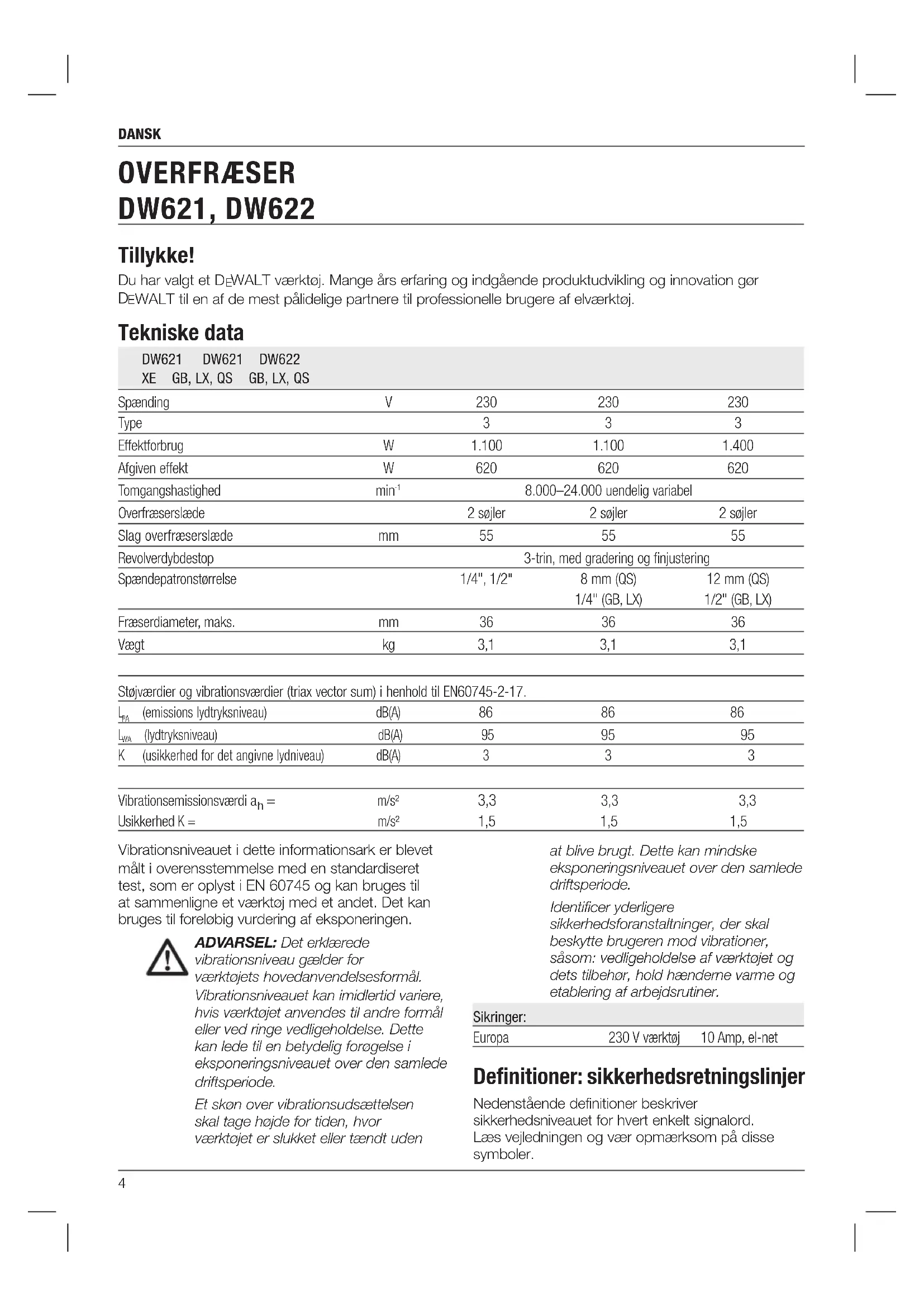 m/s² 3,3 3,3 3,3 Usikkerhed K = m/s² 1,5 1,5 1,5 OVERFRÆSER DW621, DW622 Dansk (oversat fra original brugsvejledning) Vibrationsniveauet i dette informationsark er blevet målt i overensstemmelse med en standardiseret test, som er oplyst i EN 60745 og kan bruges til at sammenligne et værktøj med et andet. Det kan bruges til foreløbig vurdering af eksponeringen. ADVARSEL: Det erklærede vibrationsniveau gælder for værktøjets hovedanvendelsesformål. Vibrationsniveauet kan imidlertid variere, hvis værktøjet anvendes til andre formål eller ved ringe vedligeholdelse. Dette kan lede til en betydelig forøgelse i eksponeringsniveauet over den samlede driftsperiode. Et skøn over vibrationsudsættelsen skal tage højde for tiden, hvor værktøjet er slukket eller tændt uden at blive brugt. Dette kan mindske eksponeringsniveauet over den samlede driftsperiode. Identificer yderligere sikkerhedsforanstaltninger, der skal beskytte brugeren mod vibrationer, såsom: vedligeholdelse af værktøjet og dets tilbehør, hold hænderne varme og etablering af arbejdsrutiner. Sikringer: Europa 230 V værktøj 10 Amp, el-net Definitioner: sikkerhedsretningslinjer Nedenstående definitioner beskriver sikkerhedsniveauet for hvert enkelt signalord. Læs vejledningen og vær opmærksom på disse symboler.5 Dansk Generelle sikkerhedsadvarsler for elektrisk værktøj ADVARSEL! Læs alle sikkerhedsadvarsler og instruktioner. Hvis ikke advarsler og instruktioner følges kan det resultere i elektrisk stød, brand og/eller alvorlig personskade.