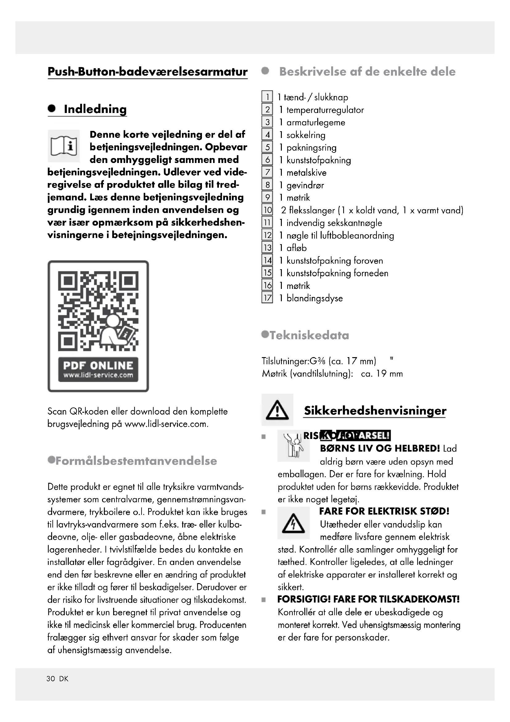 den omhyggeligt sammen med betjeningsvejledningen. Udlever ved vide- regivelse af produktet alle bilag til tred- jemand. Læs denne betjeningsvejledning grundig igennem inden anvendelsen og vær især opmærksom på sikkerhedshen- visningerne i betejningsvejledningen. Scan QR-koden eller download den komplette brugsvejledning på www.lidl-service.com. Formålsbestemt anvendelse Dette produkt er egnet til alle tryksikre varmtvands- systemer som centralvarme, gennemstrømningsvan- dvarmere, trykboilere o.l. Produktet kan ikke bruges til lavtryks-vandvarmere som f.eks. træ- eller kulba- deovne, olje- eller gasbadeovne, åbne elektriske lagerenheder. I tvivlstilfælde bedes du kontakte en installatør eller fagrådgiver. En anden anvendelse end den før beskrevne eller en ændring af produktet er ikke tilladt og fører til beskadigelser. Derudover er der risiko for livstruende situationer og tilskadekomst. Produktet er kun beregnet til privat anvendelse og ikke til medicinsk eller kommerciel brug. Producenten fralægger sig ethvert ansvar for skader som følge af uhensigtsmæssig anvendelse. Beskrivelse af de enkelte dele