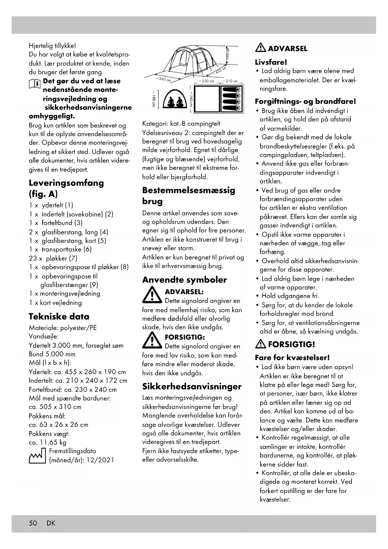under let spænding med pløkker- ne (fig. E). Bemærk: Sørg for, at artiklen ikke er spændt for hårdt. Bemærk: Kontrollér teltspændin- gen afhængigt af vejrforholdene.52 Indertelt (fig. F) Bred inderteltet (2) ud i den bageste del af det opstillede ydertelt. Sørg for, at døren til inderteltet peger mod døren til yderteltet.