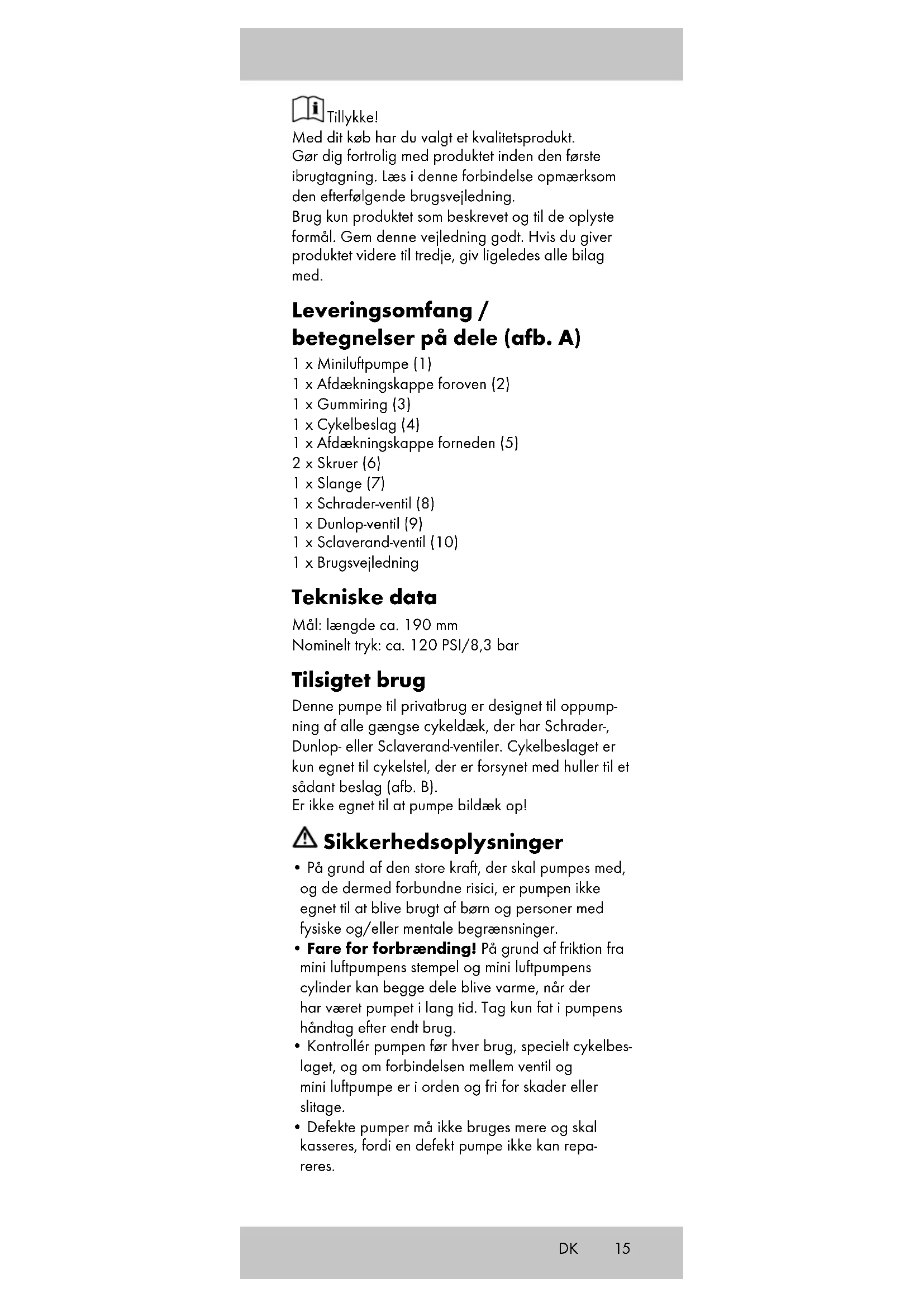 - Fare for forbrænding! På grund af friktion fra mini luftpumpens stempel og mini luftpumpens cylinder kan begge dele blive varme, når der har været pumpet i lang tid. Tag kun fat i pumpens håndtag efter endt brug.