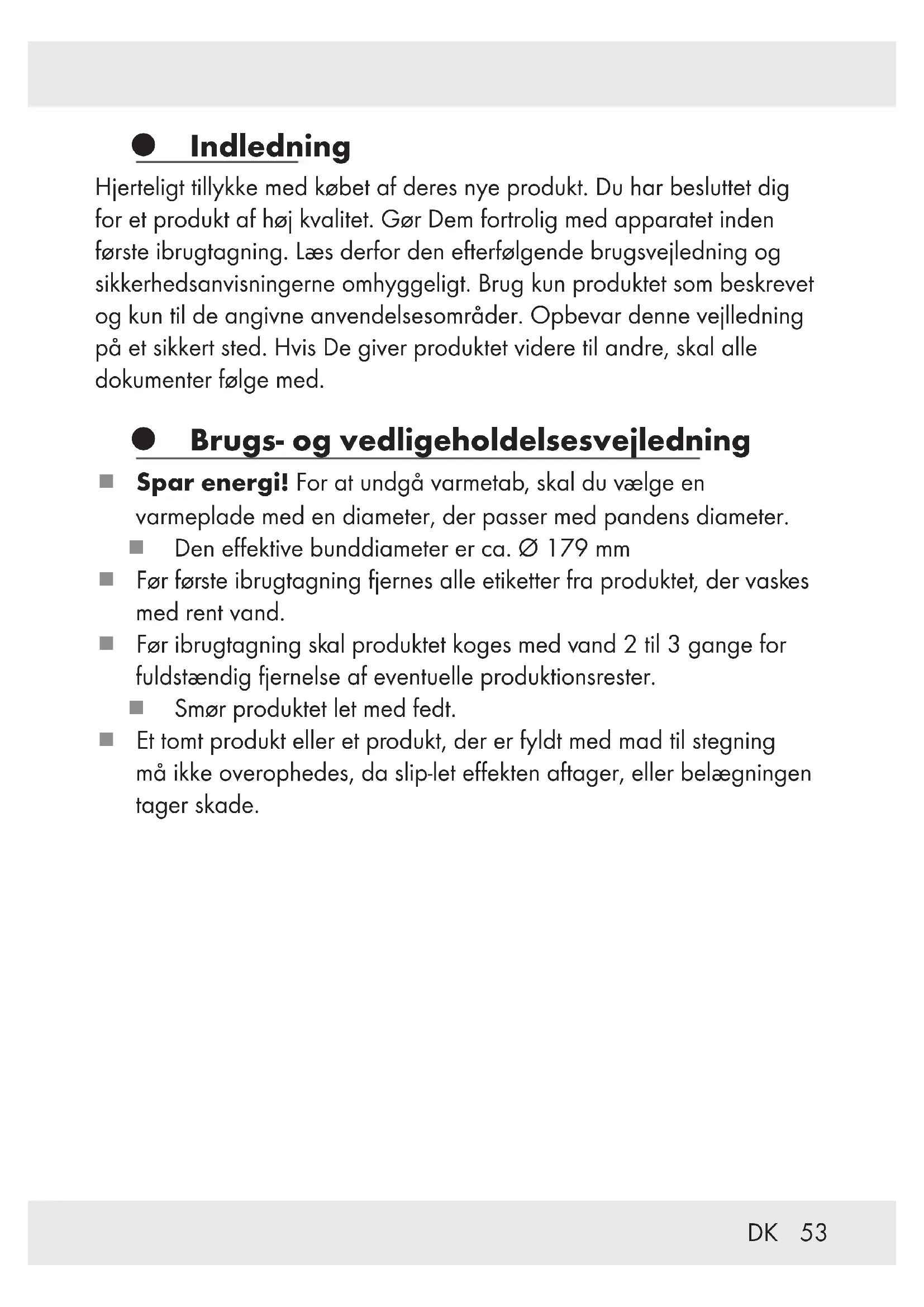 Indledning Hjerteligt tillykke med købet af deres nye produkt. Du har besluttet dig for et produkt af høj kvalitet. Gør Dem fortrolig med apparatet inden første ibrugtagning. Læs derfor den efterfølgende brugsvejledning og sikkerhedsanvisningerne omhyggeligt. Brug kun produktet som beskrevet og kun til de angivne anvendelsesområder. Opbevar denne vejlledning på et sikkert sted. Hvis De giver produktet videre til andre, skal alle dokumenter følge med. Brugs- og vedligeholdelsesvejledning Spar energi! For at undgå varmetab, skal du vælge en varmeplade med en diameter, der passer med pandens diameter. Den effektive bunddiameter er ca. Ø179mm Før første ibrugtagning fjernes alle etiketter fra produktet, der vaskes med rent vand. Før ibrugtagning skal produktet koges med vand 2til3gange for fuldstændig fjernelse af eventuelle produktionsrester. Smør produktet let med fedt. Et tomt produkt eller et produkt, der er fyldt med mad til stegning må ikke overophedes, da slip-let effekten aftager, eller belægningen tager skade.54 DK Overophedningsfare! Hvis produktet ikke er smurt med fedt og er overophedet, kan der ved kontakt med fedtfri mad opstå misfarvninger i slip let-belægningen på grund af forbrændingen af proteiner. Disse misfarvninger skal betragtes som tegn på brug og har ingen indflydelse på belægningens kvalitet og brugsegenskaberne. Opvarm mad, der skal koges, ved høj/middel varme, og lad det koge færdigt på et lavere trin. Produktet skal altid være under opsyn, mens fedtet varmes op: Overophedet fedt kan antænde. Brændende fedt må aldrig slukkes med vand! Ilden slukkes med et låg eller et tykt tæppe. Anvend kun køkkenredskaber af plast eller træ for ikke at beskadige slip let-belægningen. Madvarer må ikke udskæres direkte i produktet. Læg ikke dryppende vådt kød i produktet. Hvis der sprøjter fedt på en varm kogeplade kan der nemt opstå en brand. Ved madlavning kan greb blive varmt. Anvend grydelapper eller grillhandsker som beskyttelse. Produktet er egnet til gas-, el-, glaskeramik-, induktions-, og halogenkogeplader.55DK Vejledning for induktionskogeplader: Under bestemte omstændigheder kan der forekomme en lyd, som skyldes varmekildens og produktets elektromagnetiske egenskaber. Dette er helt normalt og ikke et tegn på defekt induktionskogeplade eller køkkengrej. Produktet skal placeres midt på induktionskogepladen. OBS! Hurtig opvarmningshastighed! Køkkengrej må ikke overopvarmes ved forvarmning. Efter en overopvarmning skal lokalet udluftes grundigt. Dette produkt kombinerer fordelene ved aluminiumskogegrej, som for eksempel den lave vægt og den høje varmeledningsevne, med fordelene ved tilberedning med induktion. For at gøre dette muligt er der indbygget et magnetisk stålelement i aluminiumsbunden. Bunden er ikke magnetisk over hele fladen, og det kan derfor forekomme at induktionsspolen ikke reagerer, hvis induktionskogefeltet er tydeligt større end bunddiameteren. Dette er ikke en kvalitetsmangel og har ingen indflydelse på funktionaliteten. For at produktet virker korrekt, skal du altid stille det på en kogeplade, som svarer til den effektive bunddiameter, der er angivet i denne vejledning. Høje temperaturer kan misfarve produktets yderside. Dette er ikke en materialefejl og har ingen indflydelse på produktets kvalitet eller funktion. Et opvarmet produkt må aldrig holdes under rindende koldt vand. Herved kan produktets underside tage skade eller falde af produktet.56 DK Produktet er egnet til at holde tilberedt mad varm i en ovn (maks.160 °C i1time). Produktet er egnet til opvaskemaskine. Ved opvask i hånden anvendes varmt vand og almindeligt opvaskemiddel. Undgå at anvende skarpe og spidse genstande eller børster for ikke at beskadige materialet. Anvend ikke skrappe skuremidler til rengøring. Hyppig rengøring med skrappe rengøringsmidler kan medføre skader og/eller misfarvning af produktet. Opvask i opvaskemaskine kan medføre misfarvning af aluminiumsdelene. OBS! Glaslåget er skrøbeligt/ikke stødsikkert! OBS! RIDSER! Undgå at skubbe og trække kogegrejet på glaskeramiske kogeplader! Før madlavningen påbegyndes, anbefaler vi, at kogepladens overflade og kogegrejets bund rengøres med en ren, fnugfri klud (fxmikrofiber). Herved kan ridser forebygges. Levnedsmiddelsikker: Dette produkt påvirker ikke de tilberedte madvarers smag og lugt. Anvend aldrig produktet hvis greb eller lågknoppens skruer er løse. Om nødvendigt spændes grebenes og lågknoppens skruer. Bortskaffelse Indpakningen består af miljøvenlige materialer, som De kan bortskaffe over de lokale genbrugssteder. De får oplyst muligheder til bortskaffelse af det udtjente produkt hos deres lokale myndigheder eller bystyre.57DK Garanti Produktet blev produceret omhyggeligt efter de strengeste kvalitetskrav og kontrolleret grundigt inden levering. Hvis der forekommer mangler ved dette produkt, så har de juridiske rettigheder over for sælgeren af dette produkt. Disse juridiske rettigheder indskrænkes ikke af vores garanti, der beskrives i det følgende. De får 3 års garanti fra købsdatoen på dette produkt. Garantifristen begynder med købsdatoen. Opbevar den originale kassebon på et sikkert sted. Denne kassebon behøves som dokumentation for købet. Hvis der inden for 3 år fra købsdatoen af for dette produkt opstår en materiale- eller fabrikationsfejl, bliver produktet repareret eller erstattet – efter vores valg – af os uden omkostninger for dem. Garantien bortfalder, hvis produktet bliver beskadiget eller ikke anvendes eller vedligeholdes korrekt. Garantien gælder for materiale- eller fabrikationsfejl. Denne garanti dækker ikke produktdele, som er udsat for normalt slid og derfor kan betragtes som normale sliddele (f.eks. batterier) eller ved skader på skrøbelige dele; f.eks. kontakter, akkumulatorer som er fremstillet af glas.58 DK Afvikling af garantisager For at kunne garantere en hurtig sagsbehandling af deres foresp