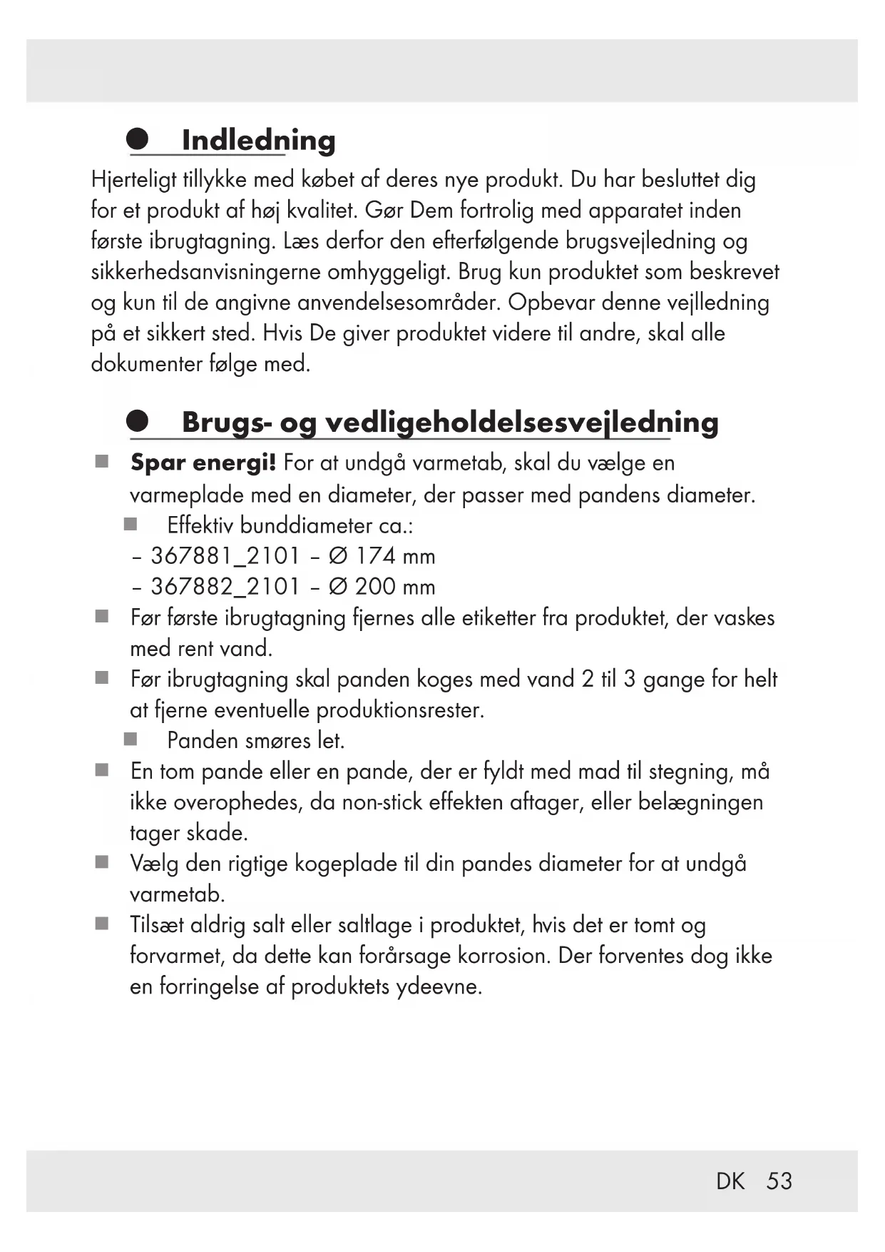 Indledning Hjerteligt tillykke med købet af deres nye produkt. Du har besluttet dig for et produkt af høj kvalitet. Gør Dem fortrolig med apparatet inden første ibrugtagning. Læs derfor den efterfølgende brugsvejledning og sikkerhedsanvisningerne omhyggeligt. Brug kun produktet som beskrevet og kun til de angivne anvendelsesområder. Opbevar denne vejlledning på et sikkert sted. Hvis De giver produktet videre til andre, skal alle dokumenter følge med. Brugs- og vedligeholdelsesvejledning Spar energi! For at undgå varmetab, skal du vælge en varmeplade med en diameter, der passer med pandens diameter. Effektiv bunddiameter ca.: – 367881_2101–Ø174mm – 367882_2101– Ø 200mm Før første ibrugtagning fjernes alle etiketter fra produktet, der vaskes med rent vand. Før ibrugtagning skal panden koges med vand 2til 3gange for helt at fjerne eventuelle produktionsrester. Panden smøres let. En tom pande eller en pande, der er fyldt med mad til stegning, må ikke overophedes, da non-stick effekten aftager, eller belægningen tager skade. Vælg den rigtige kogeplade til din pandes diameter for at undgå varmetab. Tilsæt aldrig salt eller saltlage i produktet, hvis det er tomt og forvarmet, da dette kan forårsage korrosion. Der forventes dog ikke en forringelse af produktets ydeevne.54 DK Overophedningsfare! På pander uden fedtstof, der overophedes, kan der forekomme misfarvninger af non-stick belægningen, når der forbrændes proteiner ved kontakt med fedtfattige madvarer. Disse misfarvninger skal betragtes som tegn på brug og har ingen indflydelse på belægningens kvalitet og brugsegenskaberne. Opvarm mad, der skal koges, ved høj/middel varme, og lad det koge færdigt på et lavere trin. Panden må ikke være uden opsyn ved opvarmning af fedt: Overophedet fedt kan antænde. Brændende fedt må aldrig slukkes med vand! Ilden slukkes med et låg eller et tykt tæppe. Anvend kun køkkenredskaber af plast eller træ for ikke at beskadige non-stick belægningen. Madvarer må ikke udskæres direkte på panden. Læg ikke dryppende vådt kød på panden. Hvis der sprøjter fedt på en varm kogeplade kan der nemt opstå en brand. Ved madlavning kan håndtaget blive varmt. Anvend grydelapper eller grillhandsker som beskyttelse. Panden kan anvendes med gas-, el-, glaskeramiske-, induktions- og halogenkogeplader.55DK Vejledning for induktionskogeplader: Under bestemte omstændigheder kan der forekomme en lyd, som skyldes varmekildens og produktets elektromagnetiske egenskaber. Dette er helt normalt og ikke et tegn på defekt induktionskogeplade eller køkkengrej. Produktet skal placeres midt på induktionskogepladen. OBS! Hurtig opvarmningshastighed! Køkkengrej må ikke overopvarmes ved forvarmning. Efter en overopvarmning skal lokalet udluftes grundigt. For at produktet virker korrekt, skal du altid stille det på en kogeplade, som svarer til den effektive bunddiameter, der er angivet i denne vejledning. Høje temperaturer kan misfarve produktets yderside. Dette er ikke en materialefejl og har ingen indflydelse på produktets kvalitet eller funktion. Et opvarmet produkt må aldrig holdes under rindende koldt vand. Herved kan produktets underside tage skade eller falde af produktet. Artiklen er egnet til at holde madvarer varme i ovnen. Denne pande er egnet til opvaskemaskine. Ved opvask i hånden anvendes varmt vand og almindeligt opvaskemiddel. Undgå at anvende skarpe og spidse genstande eller børster for ikke at beskadige materialet. Anvend ikke skrappe skuremidler til rengøring.56 DK Hyppig rengøring med skrappe rengøringsmidler kan medføre skader og/eller misfarvning af panden. OBS! RIDSER! Undgå at skubbe og trække kogegrejet på glaskeramiske kogeplader! Før madlavningen påbegyndes, anbefaler vi, at kogepladens overflade og kogegrejets bund rengøres med en ren, fnugfri klud (fxmikrofiber). Herved kan ridser forebygges. Levnedsmiddelsikker: Denne pande påvirker ikke de tilberedte madvarers smag og lugt. Panden må ikke anvendes, hvis håndtaget sidder løst. Efterspænd evt. håndtagets skruer. Mineralerne, som er i vandet, kan med tiden forårsage pletter eller misfarvninger på produktet. Du kan fjerne disse ved at gnide med en halv citron på dem. Mere genstridige pletter kan fjernes med en blanding af ni dele vand og en del eddikeessens. Bortskaffelse Indpakningen består af miljøvenlige materialer, som De kan bortskaffe over de lokale genbrugssteder. De får oplyst muligheder til bortskaffelse af det udtjente produkt hos deres lokale myndigheder eller bystyre.57DK Garanti Produktet blev produceret omhyggeligt efter de strengeste kvalitetskrav og kontrolleret grundigt inden levering. Hvis der forekommer mangler ved dette produkt, så har de juridiske rettigheder over for sælgeren af dette produkt. Disse juridiske rettigheder indskrænkes ikke af vores garanti, der beskrives i det følgende. De får 3 års garanti fra købsdatoen på dette produkt. Garantifristen begynder med købsdatoen. Opbevar den originale kassebon på et sikkert sted. Denne kassebon behøves som dokumentation for købet. Hvis der inden for 3 år fra købsdatoen af for dette produkt opstår en materiale- eller fabrikationsfejl, bliver produktet repareret eller erstattet – efter vores valg – af os uden omkostninger for dem. Garantien bortfalder, hvis produktet bliver beskadiget eller ikke anvendes eller vedligeholdes korrekt. Garantien gælder for materiale- eller fabrikationsfejl. Denne garanti dækker ikke produktdele, som er udsat for normalt slid og derfor kan betragtes som normale sliddele (f.eks. batterier) eller ved skader på skrøbelige dele; f.eks. kontakter, akkumulatorer som er fremstillet af glas.58 DK Afvikling af garantisager For at kunne garantere en hurtig sagsbehandling af deres forespørgsel, bedes De følge følgende anvisninger: Opbevar kassebon og artikelnummer (f.eks. IAN 123456_7890) som købsdokumentation, så disse kan fremlægges på forespørgsel. Artikelnumr