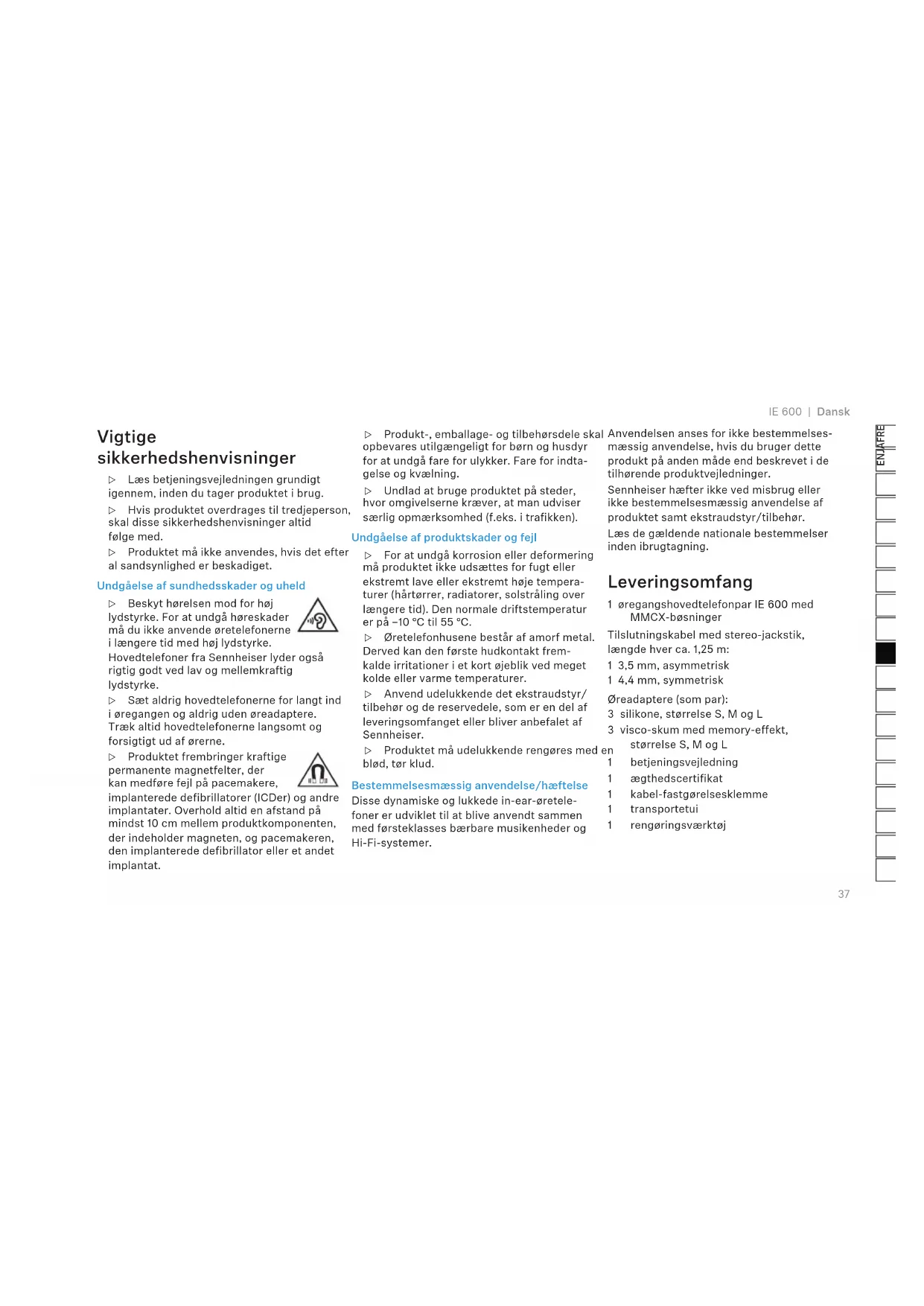 IE 600 | Dansk Vigtige sikkerhedshenvisninger ▷ Læs betjeningsvejledningen grundigt igennem, inden du tager produktet i brug. ▷ Hvis produktet overdrages til tredjeperson, skal disse sikkerhedshenvisninger altid følge med. ▷ Produktet må ikke anvendes, hvis det efter al sandsynlighed er beskadiget. Undgåelse af sundhedsskader og uheld ▷ Beskyt hørelsen mod for høj lydstyrke. For at undgå høreskader må du ikke anvende øretelefonerne i længere tid med høj lydstyrke. Hovedtelefoner fra Sennheiser lyder også rigtig godt ved lav og mellemkraftig lydstyrke. ▷ Sæt aldrig hovedtelefonerne for langt ind i øregangen og aldrig uden øreadaptere. Træk altid hovedtelefonerne langsomt og forsigtigt ud af ørerne. ▷ Produktet frembringer kraftige permanente magnetfelter, der kan medføre fejl på pacemakere, implanterede defibrillatorer (ICDer) og andre implantater. Overhold altid en afstand på mindst 10 cm mellem produktkomponenten, der indeholder magneten, og pacemakeren, den implanterede defibrillator eller et andet implantat. ▷ Produkt-, emballage- og tilbehørsdele skal opbevares utilgængeligt for børn og husdyr for at undgå fare for ulykker. Fare for indta- gelse og kvælning. ▷ Undlad at bruge produktet på steder, hvor omgivelserne kræver, at man udviser særlig opmærksomhed (f.eks. i trafikken). Undgåelse af produktskader og fejl ▷ For at undgå korrosion eller deformering må produktet ikke udsættes for fugt eller ekstremt lave eller ekstremt høje tempera- turer (hårtørrer, radiatorer, solstråling over længere tid). Den normale driftstemperatur er på –10 °C til 55 °C. ▷ Øretelefonhusene består af amorf metal. Derved kan den første hudkontakt frem- kalde irritationer i et kort øjeblik ved meget kolde eller varme temperaturer. ▷ Anvend udelukkende det ekstraudstyr/ tilbehør og de reservedele, som er en del af leveringsomfanget eller bliver anbefalet af Sennheiser. ▷ Produktet må udelukkende rengøres med en blød, tør klud. Bestemmelsesmæssig anvendelse/hæftelse Disse dynamiske og lukkede in-ear-øretele- foner er udviklet til at blive anvendt sammen med førsteklasses bærbare musikenheder og Hi-Fi-systemer. Anvendelsen anses for ikke bestemmelses- mæssig anvendelse, hvis du bruger dette produkt på anden måde end beskrevet i de tilhørende produktvejledninger. Sennheiser hæfter ikke ved misbrug eller ikke bestemmelsesmæssig anvendelse af produktet samt ekstraudstyr/tilbehør. Læs de gældende nationale bestemmelser inden ibrugtagning. Leveringsomfang 1 øregangshovedtelefonpar IE 600 med MMCX-bøsninger Tilslutningskabel med stereo-jackstik, længde hver ca. 1,25 m: 1 3,5 mm, asymmetrisk 1 4,4 mm, symmetrisk Øreadaptere (som par): 3 silikone, størrelse S, M og L 3 visco-skum med memory-effekt, størrelse S, M og L 1 betjeningsvejledning 1 ægthedscertifikat 1 kabel-fastgørelsesklemme 1 transportetui 1 rengøringsværktøj38 Dansk | IE 600 Din Sennheiser IE 600 Gengivelsen af den ideelle klang – uforfalsket og klar. Det står IE 600 for. En øretelefon, der følger i fodsporene af det audiofile in-ear- flagskib Sennheiser IE 900. På grundlag af de berømmede TrueResponse-omformere har IE 600 „Dual 2 Chamber Absorber“-resonator- kamre, der hjælper klangopsætningen til en direkte og fokuseret rum. Stemmer fremhæves og danner en bro mellem dig og musikken, så verden omkring dig forsvinder. En neutral gengivelse af klangen, hvor dybbasområdet alligevel er effektivt, viser, hvad de dynamiske 7 mm-in-ear-omformere er i stand til ved konsekvent anvendelse af årtiers forskning og ekspertise. Den afba- lancerede gengivelse giver renere diskant, der ikke deler musikken analytisk. IE 600 viser Sennheisers lidenskab til at gengive den ideelle klang og at opleve et inderligt, personlig øjeblik med musik. IE 600 fremstilles af et ekspertteam i fabrikken, der er specialiseret i hovedte- lefoner, i Tullamore, Irland. Som for hver audiofil øretelefon gælder de mindste pro- duktionstolerancer. Hver lydomformer testes fuldstændigt – både enkeltvis før og sammen efter parringen af højre og venstre øretelefon- side. Lydomformerne på den højre og venstre side vælges, så de er optimalt tilpasset til hinanden. Lydomformerne omsluttes af et hus, som man aldrig før har set i den form til en audiofil øretelefon. Ved hjælp af selektiv lasersmeltning blev huset lag for lag bygget til et metalhus med amorfe strukturer. Resultatet er et ekstremt hårdt materiale, der er robust mod påvirkninger fra omgivelserne, og som på grund af sine egenskaber og den omfattende produktion primært blev anvendt i rumfarten og medicinteknikken. Desuden er zirconium- kobber-aluminium-niobium-legeringens metallisk rå overflade et rigtigt blikfang. IE 600 giver fremragende konnektivitet med Fidelity+ MMCX-tilslutninger. Disse præcise stikforbindelser blev optimeret til mobil anvendelse af øretelefonerne. På grund af stikforbindelsernes høje afskærmning er de fine kontakter særligt godt beskyttet mod mekanisk belastning. På enhedssiden er der som standard 3,5 mm- og 4,4 mm-jackstik. Kabelføringen over øret med indstillelige bøjler sørger for en let følelse, når du bærer den, og reduceret mekanisk vibration sammenlignet med standardkabler. På den måde nyder du også mange timers lyttesessioner med disse enestående Sennheiser IE 600 øretelefoner. Illustrationer findes på udklapsiden.