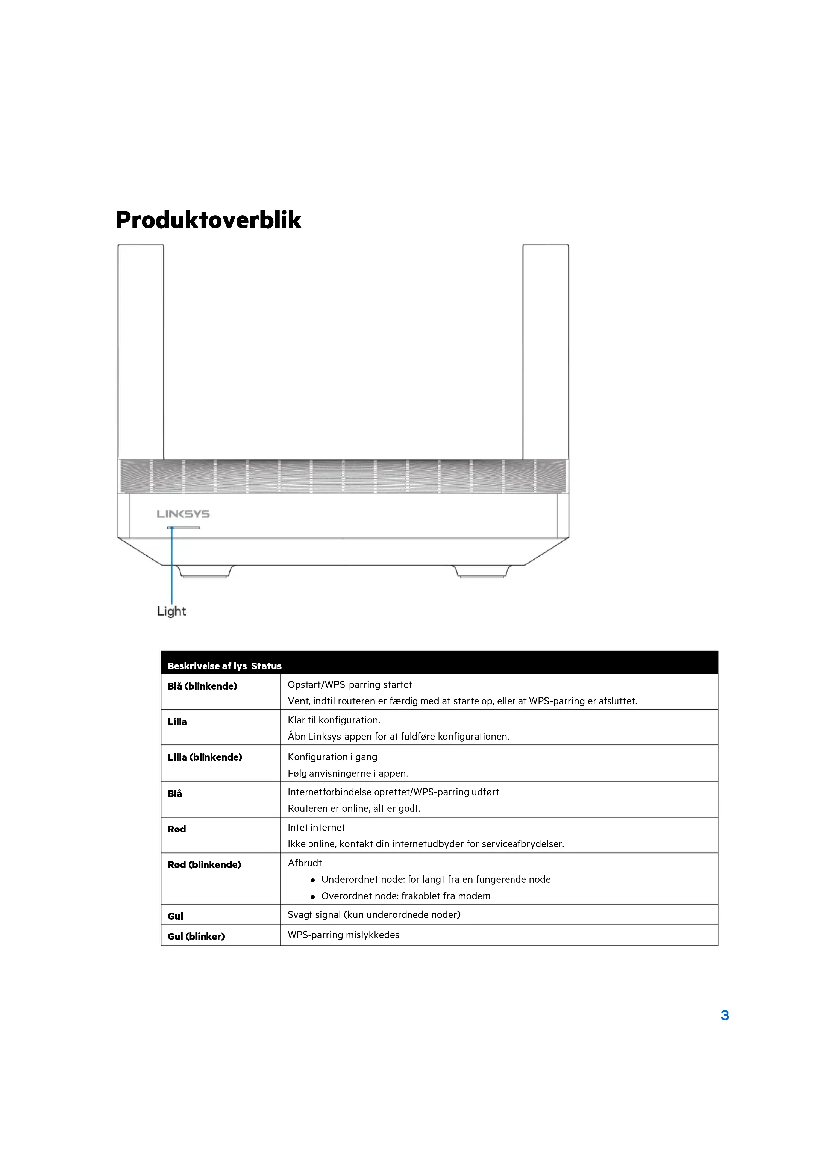 | Lilla | Klar til konfiguration. Åbn Linksys-appen for at fuldføre konfigurationen. |
