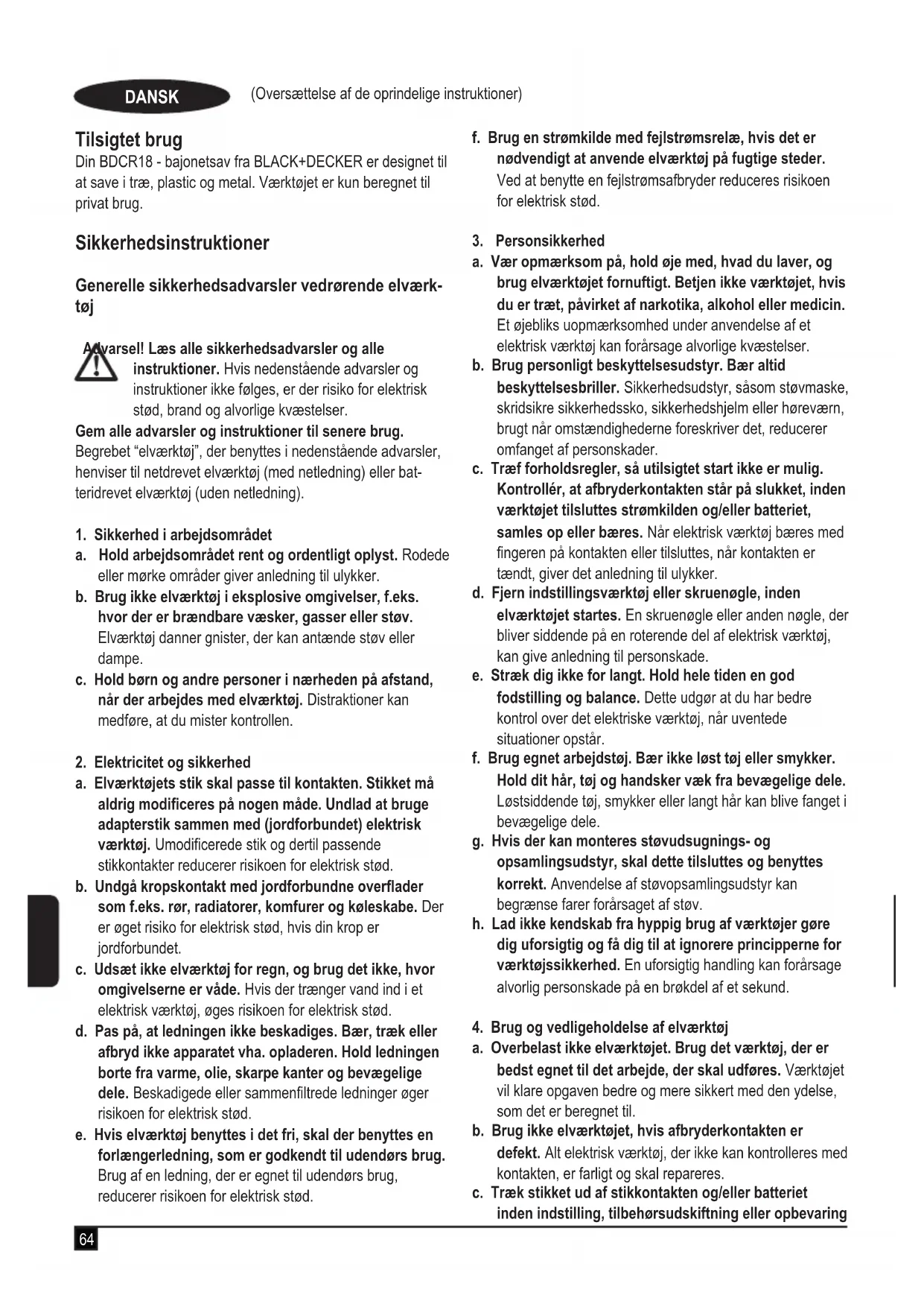 BDCR18 - bajonetsav Black & Decker erklærer, at produkterne beskrevet under "Tekniske data" er i overensstemmelse med: EN60745-1:2009+A11:2010, EN60745-2-11:2010 Disse produkter er endvidere i overensstemmelse med direktiv 2006/42/EF, 2014/30/EU og 2011/65/EU.70 (Oversættelse af de oprindelige instruktioner) DANSK (Alkuperäisten ohjeiden käännös) SUOMI Kontakt Black & Decker på nedenstående adresse eller se vejledningens bagside for at få ere oplysninger. Undertegnede er ansvarlig for udarbejdelsen af de tekniske data og fremsætter denne erklæring på vegne af Black & Decker. Ray Laverick Direktør for konstruktioner Black & Decker Europe, 210 Bath Road, Slough, Berkshire, SL1 3YD Storbritannien 26/10/2018 Garanti Black & Decker er sikker på kvaliteten af sine produkter og tilbyder forbrugerne en garanti på 24 måneder fra købsdatoen. Garantien er et tillæg til forbrugerens lovmæs- sige rettigheder og påvirker ikke disse. Garantien er gyldig inden for medlemsstaterne af Den Europæiske Union og Det Europæiske Frihandelsområde. Når du gør krav på garantien, skal kravet være i overens- stemmelse med Black & Decker vilkår og betingelser, og du skal indsende dokumentation for købet til sælgeren eller til en autoriseret reparatør. Vilkår og betingelser for Black & Decker 2 års garanti og placeringen af dit nærmeste autoriserede serviceværksted kan fås på internettet på www.2helpU.com, eller ved at kontakte dit lokale Black & Decker kontor på den adresse, der er angivet i denne vejledning. Besøg venligst vores websted www.blackanddecker.co.uk for at registrere dit nye Black & Decker produkt og modtage opdateringer om nye produkter og specielle tilbud. Käyttötarkoitus Tämä BLACK+DECKER BDCR18 -pistosaha on tarkoitettu puun, muovin ja metallin sahaamiseen. Tämä työkalu on tarkoitettu vain yksityiskäyttöön. Turvallisuusohjeet Sähkötyökalujen yleiset turvavaroitukset Varoitus! Lue kaikki turvallisuusvaroitukset ja ohjeet. Alla olevien varoitusten ja ohjeiden noudat- tamisen laiminlyönti saattaa johtaa sähköiskuun, tulipaloon ja/tai vakavaan loukkaantumiseen. Säästä kaikki varoitukset ja ohjeet tulevaa käyttöä varten. Ohjeissa käytetty käsite “sähkötyökalu” tarkoittaa verkkokäyt- töisiä sähkötyökaluja (verkkojohdolla varustettuja) ja akkukäyt- töisiä sähkötyökaluja (ilman verkkojohtoa).
