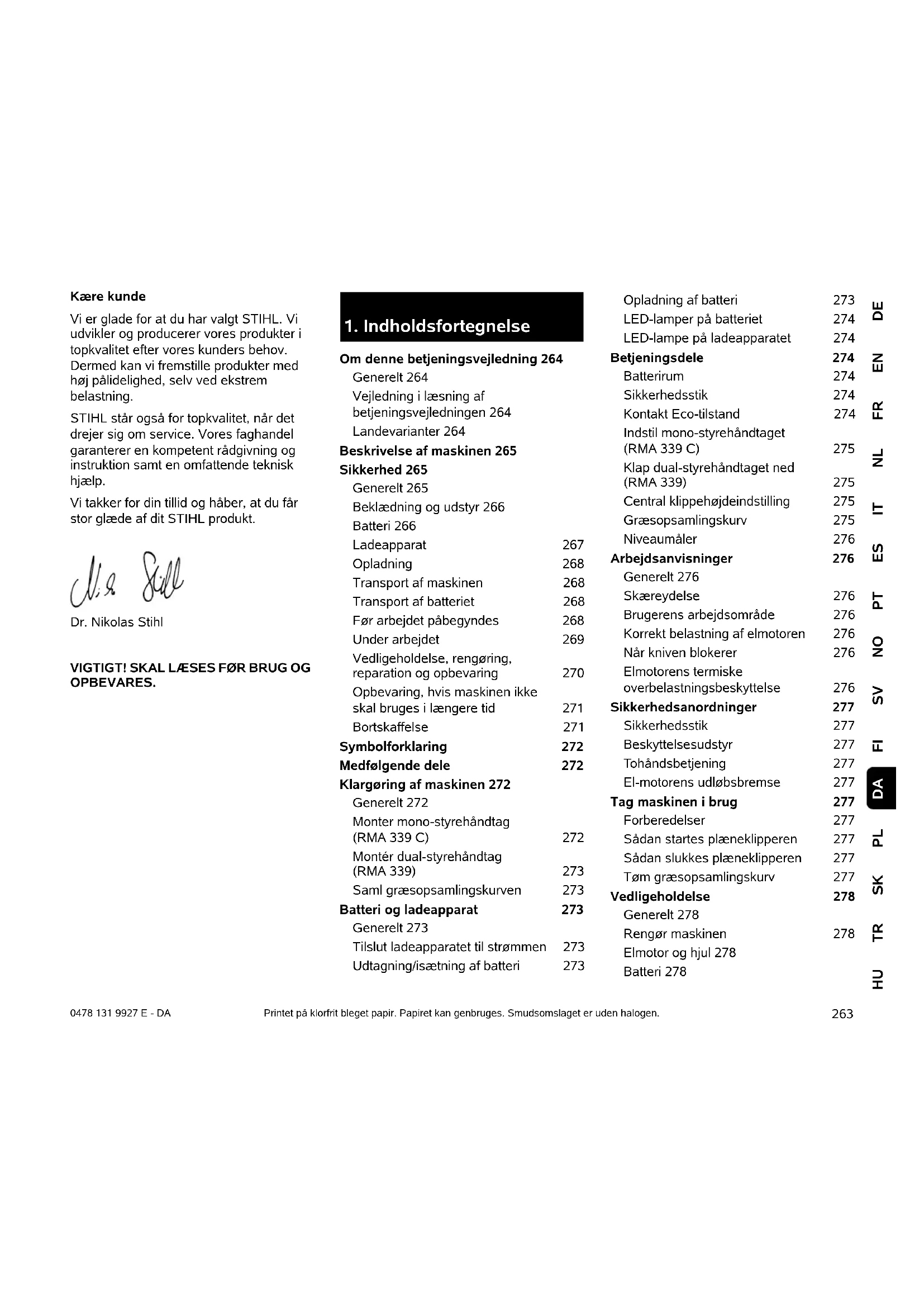 Om denne betjeningsvejledning 264 Generelt 264 Vejledning i læsning af betjeningsvejledningen 264 Landevarianter 264 Beskrivelse af maskinen 265 Sikkerhed 265 Generelt 265 Beklædning og udstyr 266 Batteri 266 Ladeapparat 267 Opladning 268 Transport af maskinen 268 Transport af batteriet 268 Før arbejdet påbegyndes 268 Under arbejdet 269 Vedligeholdelse, rengøring, reparation og opbevaring 270 Opbevaring, hvis maskinen ikke skal bruges i længere tid 271 Bortskaffelse 271 Symbolforklaring 272 Medfølgende dele 272 Klargøring af maskinen 272 Generelt 272 Monter mono-styrehåndtag (RMA 339 C) 272 Montér dual-styrehåndtag (RMA 339) 273 Saml græsopsamlingskurven 273 Batteri og ladeapparat 273 Generelt 273 Tilslut ladeapparatet til strømmen 273 Udtagning/isætning af batteri 273 Opladning af batteri 273 LED-lamper på batteriet 274 LED-lampe på ladeapparatet 274 Betjeningsdele 274 Batterirum 274 Sikkerhedsstik 274 Kontakt Eco-tilstand 274 Indstil mono-styrehåndtaget (RMA 339 C) 275 Klap dual-styrehåndtaget ned (RMA 339) 275 Central klippehøjdeindstilling 275 Græsopsamlingskurv 275 Niveaumåler 276 Arbejdsanvisninger 276 Generelt 276 Skæreydelse 276 Brugerens arbejdsområde 276 Korrekt belastning af elmotoren 276 Når kniven blokerer 276 Elmotorens termiske overbelastningsbeskyttelse 276 Sikkerhedsanordninger 277 Sikkerhedsstik 277 Beskyttelsesudstyr 277 Tohåndsbetjening 277 El-motorens udløbsbremse 277 Tag maskinen i brug 277 Forberedelser 277 Sådan startes plæneklipperen 277 Sådan slukkes plæneklipperen 277 Tøm græsopsamlingskurv 277 Vedligeholdelse 278 Generelt 278 Rengør maskinen 278 Elmotor og hjul 278 Batteri 2780478 131 9927 E - DA