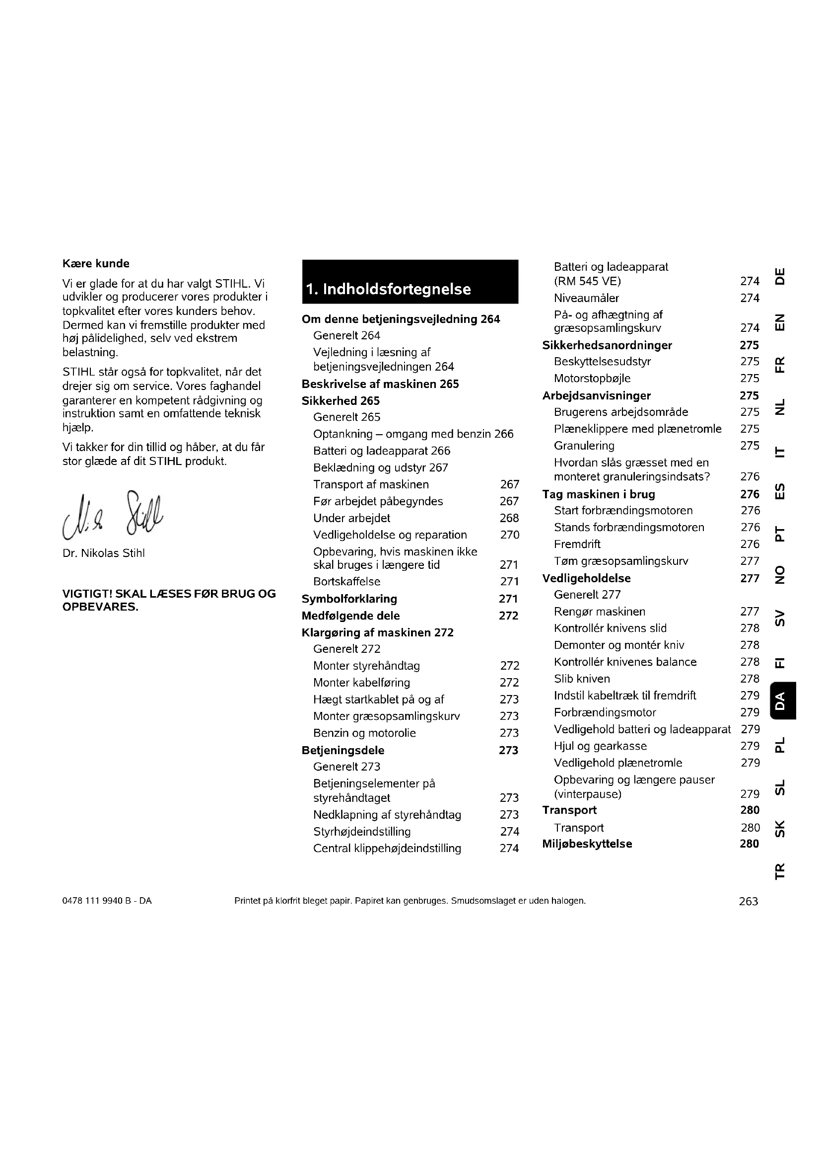 Om denne betjeningsvejledning 264 Generelt 264 Vejledning i læsning af betjeningsvejledningen 264 Beskrivelse af maskinen 265 Sikkerhed 265 Generelt 265 Optankning – omgang med benzin 266 Batteri og ladeapparat 266 Beklædning og udstyr 267 Transport af maskinen 267 Før arbejdet påbegyndes 267 Under arbejdet 268 Vedligeholdelse og reparation 270 Opbevaring, hvis maskinen ikke skal bruges i længere tid 271 Bortskaffelse 271 Symbolforklaring 271 Medfølgende dele 272 Klargøring af maskinen 272 Generelt 272 Monter styrehåndtag 272 Monter kabelføring 272 Hægt startkablet på og af 273 Monter græsopsamlingskurv 273 Benzin og motorolie 273 Betjeningsdele 273 Generelt 273 Betjeningselementer på styrehåndtaget 273 Nedklapning af styrehåndtag 273 Styrhøjdeindstilling 274 Central klippehøjdeindstilling 274 Batteri og ladeapparat (RM 545 VE) 274 Niveaumåler 274 På- og afhægtning af græsopsamlingskurv 274 Sikkerhedsanordninger 275 Beskyttelsesudstyr 275 Motorstopbøjle 275 Arbejdsanvisninger 275 Brugerens arbejdsområde 275 Plæneklippere med plænetromle 275 Granulering 275 Hvordan slås græsset med en monteret granuleringsindsats? 276 Tag maskinen i brug 276 Start forbrændingsmotoren 276 Stands forbrændingsmotoren 276 Fremdrift 276 Tøm græsopsamlingskurv 277 Vedligeholdelse 277 Generelt 277 Rengør maskinen 277 Kontrollér knivens slid 278 Demonter og montér kniv 278 Kontrollér knivenes balance 278 Slib kniven 278 Indstil kabeltræk til fremdrift 279 Forbrændingsmotor 279 Vedligehold batteri og ladeapparat 279 Hjul og gearkasse 279 Vedligehold plænetromle 279 Opbevaring og længere pauser (vinterpause) 279 Transport 280 Transport 280 Miljøbeskyttelse 2800478 111 9940 B - DA