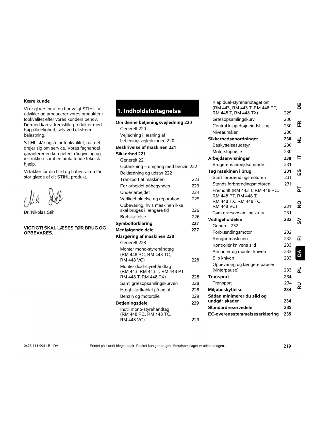 Affaldsprodukter, såsom gammel olie eller benzin, brugt smøremiddel, filtre, batterier og lignende sliddele kan være til skade for mennesker, dyr og miljøet og skal derfor bortskaffes korrekt. Kontakt genbrugsstationen eller forhandleren for at få oplyst, hvordan affaldsprodukterne bortskaffes korrekt. STIHL anbefaler en STIHL-forhandler.227 DEFRNLITESPTNOSVFIPLRU DA 0478 111 9941 B - DA Sørg for korrekt bortskaffelse af den brugte maskine. Sørg for, at maskinen ikke kan anvendes længere før bortskaffelsen. For at forebygge ulykker skal tændkablet tages af, benzintanken tømmes, og motorolien aftappes. Risiko for kvæstelser på kniven. Lad aldrig en brugt plæneklipper være uden opsyn. Sørg for, at maskinen og især kniven opbevares utilgængeligt for børn. RM 443, RM 443 T, RM 448 PT, RM 448 T, RM 448 TX: