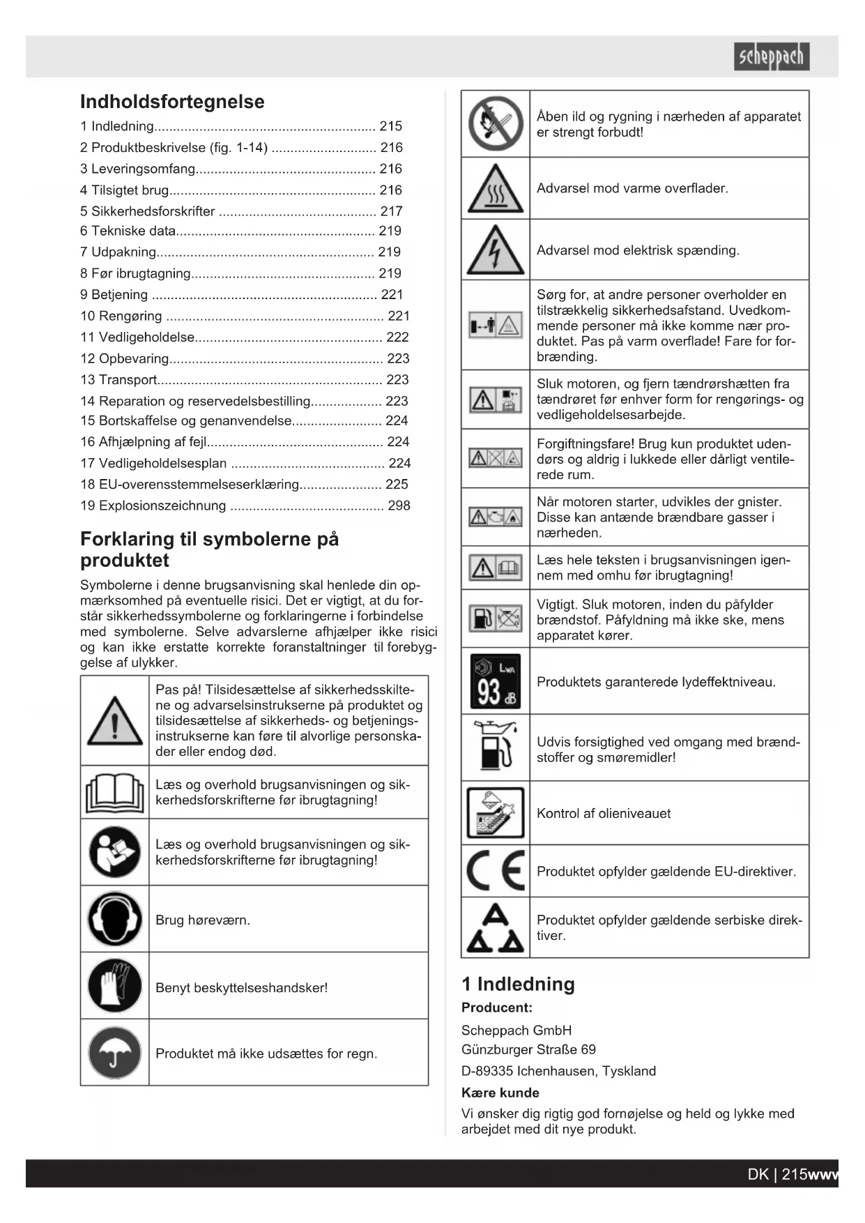 - 19 Explosionszeichnung Forklaring til symbolerne på produktet Symbolerne i denne brugsanvisning skal henlede din op- mærksomhed på eventuelle risici. Det er vigtigt, at du for- står sikkerhedssymbolerne og forklaringerne i forbindelse med symbolerne. Selve advarslerne afhjælper ikke risici og kan ikke erstatte korrekte foranstaltninger til forebyg- gelse af ulykker. Pas på! Tilsidesættelse af sikkerhedsskilte- ne og advarselsinstrukserne på produktet og tilsidesættelse af sikkerheds- og betjenings- instrukserne kan føre til alvorlige personska- der eller endog død. Læs og overhold brugsanvisningen og sik- kerhedsforskrifterne før ibrugtagning! Læs og overhold brugsanvisningen og sik- kerhedsforskrifterne før ibrugtagning! Brug høreværn. Benyt beskyttelseshandsker! Produktet må ikke udsættes for regn. Åben ild og rygning i nærheden af apparatet er strengt forbudt! Advarsel mod varme overflader. Advarsel mod elektrisk spænding. Sørg for, at andre personer overholder en tilstrækkelig sikkerhedsafstand. Uvedkom- mende personer må ikke komme nær pro- duktet. Pas på varm overflade! Fare for for- brænding. Sluk motoren, og fjern tændrørshætten fra tændrøret før enhver form for rengørings- og vedligeholdelsesarbejde. Forgiftningsfare! Brug kun produktet uden- dørs og aldrig i lukkede eller dårligt ventile- rede rum. Når motoren starter, udvikles der gnister. Disse kan antænde brændbare gasser i nærheden. Læs hele teksten i brugsanvisningen igen- nem med omhu før ibrugtagning! Vigtigt. Sluk motoren, inden du påfylder brændstof. Påfyldning må ikke ske, mens apparatet kører. Produktets garanterede lydeffektniveau. Udvis forsigtighed ved omgang med brænd- stoffer og smøremidler! Kontrol af olieniveauet Produktet opfylder gældende EU-direktiver. Produktet opfylder gældende serbiske direk- tiver. 1 Indledning Producent: Scheppach GmbH Günzburger Straße 69 D-89335 Ichenhausen, Tyskland Kære kunde Vi ønsker dig rigtig god fornøjelse og held og lykke med arbejdet med dit nye produkt. DK | 215www.scheppach.comBemærk: Iht. gældende lov om produktansvar hæfter producenten af dette produkt ikke for skader, der måtte opstå på eller i forbindelse med dette produkt som følge af: p. 298