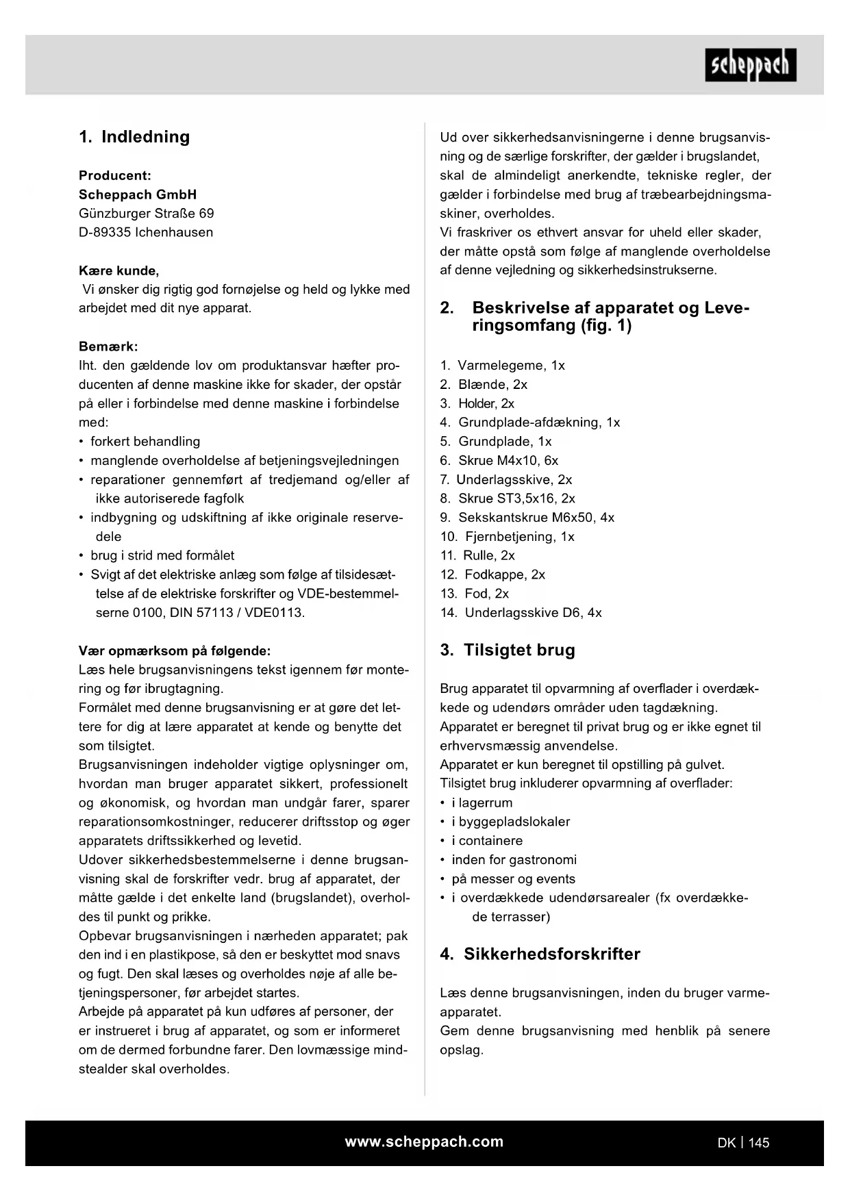 RØRE VED DET, MENS DET ER TÆNDT. 3 Undlad at montere eller opstille apparatet direkte under en stikkontakt. 4 Beskyttelsesgitteret på dette varmeapparat er beregnet til at forhindre direkte kontakt med var- meelementer og skal være påsat, når varmeap- paratet er i drift. Beskyttelsesgitteret yder ikke fuldstændig beskyttelse for små børn eller skrø- belige personer. 5 Undgå at tildække varmeapparatet, da det ellers vil kunne blive overophedet. 6 Dette varmeapparat er ikke udstyret med et ap- parat til styring af rumtemperaturen. 7 Brug ikke dette varmeapparat i mindre rum, hvor der ndes personer, som ikke er i stand til at for- lade rummet ved egen hjælp, medmindre dette sker under konstant opsyn. 8 Børn under 3 år må ikke komme nær produktet, medmindre de er under konstant opsyn. Børn mel- lem 3 og 8 år må kun tænde og slukke for appa- ratet, hvis det er installeret og placeret i overens- stemmelse med de sædvanlige brugsanvisninger, og hvis de er under opsyn og er blevet behørigt instrueret i korrekt og sikker brug og har forstået de potentielle farer. Børn mellem 3 og 8 år må ikke tilslutte, regulere, rengøre eller udføre vedligehol- delsesarbejde på produktet. PAS PÅ: Visse ap- paratdele kan blive meget varme og forårsage forbrænding. Udvis særlig forsigtighed i nær- vær af børn eller sårbare mennesker. 9 Dette apparat kan bruges af børn fra 8 år samt af personer med begrænsede fysiske, sensori- ske eller psykiske evner eller manglende erfaring og/eller viden, hvis de overvåges eller er blevet instrueret i en sikker brug af apparatet og har forstået de farer, der er forbundet med brugen. Børn må ikke lege med produktet. Rengøring og brugervedligeholdelse må ikke udføres af børn uden opsyn. 10 Tag produktet ud af emballagen, og kontrollér, at det er i god stand. 11 TILLAD IKKE, at børn leger med emballage, f.eks. plastposer.www.scheppach.com