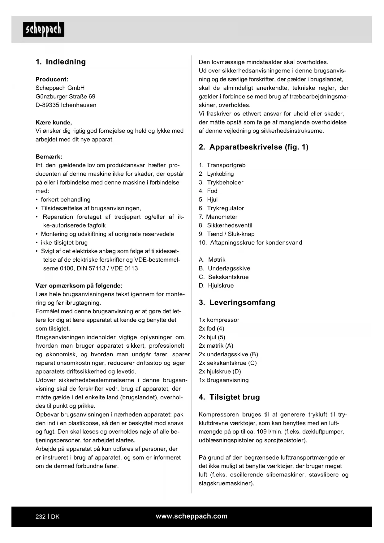 d. Opbevar ubenyttet elværktøj utilgængeligt for børn. Lad ikke personer bruge elværktø- jet, som ikke er fortrolige med det, eller som ikke har læst denne vejledning. Elværktøjer er farlige i hænderne på uerfarne personer. Ubrugt elværktøj bør opbevares et tørt sted, der skal være aåst, eller der bender sig højt oppe; dette sted skal være uden for børns rækkevidde. e. Elværktøjer og indsatsværktøjer skal ple- jes omhyggeligt. Kontrollér med jævne mel- lemrum, om bevægelige dele fungerer, som de skal, og at de ikke sidder fast, om dele er brækket eller beskadiget på en sådan måde, at elværktøjets funktion er forringet. Få beskadi- gede dele repareret eller udskiftet, før elværk- tøjet tages i brug. Mange ulykker skyldes dårligt vedligeholdt elværktøj. f. Hold skæreværktøj skarpt og rent. Omhygge- ligt plejet skæreværktøj med skarpe skærekanter sætter sig mindre hyppigt fast og er lettere at føre. g. Brug elværktøj, tilbehør, indsatsværktøjer osv. i henhold til disse instruktioner. Tag hen- syn til arbejdsvilkårene og den aktivitet, der skal udføres. Brug af elværktøj til andre formål end de tilsigtede kan medføre farlige situationer. h. Hold greb og gribeader tørre, rene og fri for olie og fedt. Glatte greb og gribeader umuliggør sikker betjening af og kontrol med elværktøjet i uforudsete situationer. Service a. Elværktøjet må kun repareres af uddannet fagpersonale, og der må kun bruges origina- le reservedele. Dette sikrer, at elværktøjet også fremover er sikker at bruge. Sikkerhedsforskrifter for kompressorer m Pas på! Når denne kompressor bruges, skal følgende princi- pielle sikkerhedsforanstaltninger overholdes for at be- skytte mod elektrisk stød, kvæstelses- og brandfare. Læs og følg disse anvisninger, før du bruger apparatet. c. Undgå utilsigtet ibrugtagning. Sørg for, at el- værktøjet er slukket, før du tilslutter, opsamler eller bærer det hen til strømforsyningen og/ eller batteriet. Hvis du holder ngeren på kontak- ten, mens du bærer elværktøjet eller tilslutter det til strømforsyningen, kan dette forårsage ulykker. d. Fjern indstillingsværktøj eller skruenøgler, inden du tilslutter elværktøjet. Værktøj eller nøgler, som måtte bende sig i en roterende del af elværktøjet, kan medføre personskader. e. Undgå unormale kropsholdninger. Sørg for at stå sikkert, og hold altid ligevægten. På denne måde kan du bedre kontrollere elværktøjet, hvis der opstår uventede situationer. f. Brug egnet tøj. Brug ikke løstsiddende tøj eller smykker. Hold hår, tøj og handsker på afstand af bevægelige dele. Løstsiddende tøj, smykker eller langt hår kan blive viklet ind i bevægelige dele. Til arbejde ude i det fri anbefales det at bruge gummihandsker og skridsikkert fodværk. Beskyt langt hår under et hårnet. g. Hvis der kan monteres støvudsugnings- og opsamlingsindretninger, skal man sikre sig, at disse er tilsluttet og bruges rigtigt. Brug af støvudsugning kan mindske faren pga. støv. h. Forlad dig ikke på falsk sikkerhed, og over- skrid ikke sikkerhedsreglerne for elværktøjer, selvom du evt. føler dig fortrolig med elværk- tøjet efter længere tids brug. Skødesløse hand- linger kan føre til alvorlige personskader på en brøkdel af et sekund. Anvendelse og behandling af elværktøjet a. Undlad at overbelaste elværktøjet. Til arbejdet skal man benytte det hertil beregnede elværk- tøj. Du arbejder bedre og mere sikkert med det passende elværktøj i det angivne eektområde. b. Brug aldrig et elværktøj med defekt kontakt. Et elværktøj, der ikke kan tændes eller slukkes, er farligt og skal repareres. c. Træk stikket ud af stikkontakten, og/eller fjern et udtageligt batteri, før du foretager justerin- ger på enheden, skifter værktøjsdele eller læg- ger elværktøjet fra dig. Denne forholdsregel forhindrer utilsigtet start af elværktøjet.www.scheppach.com