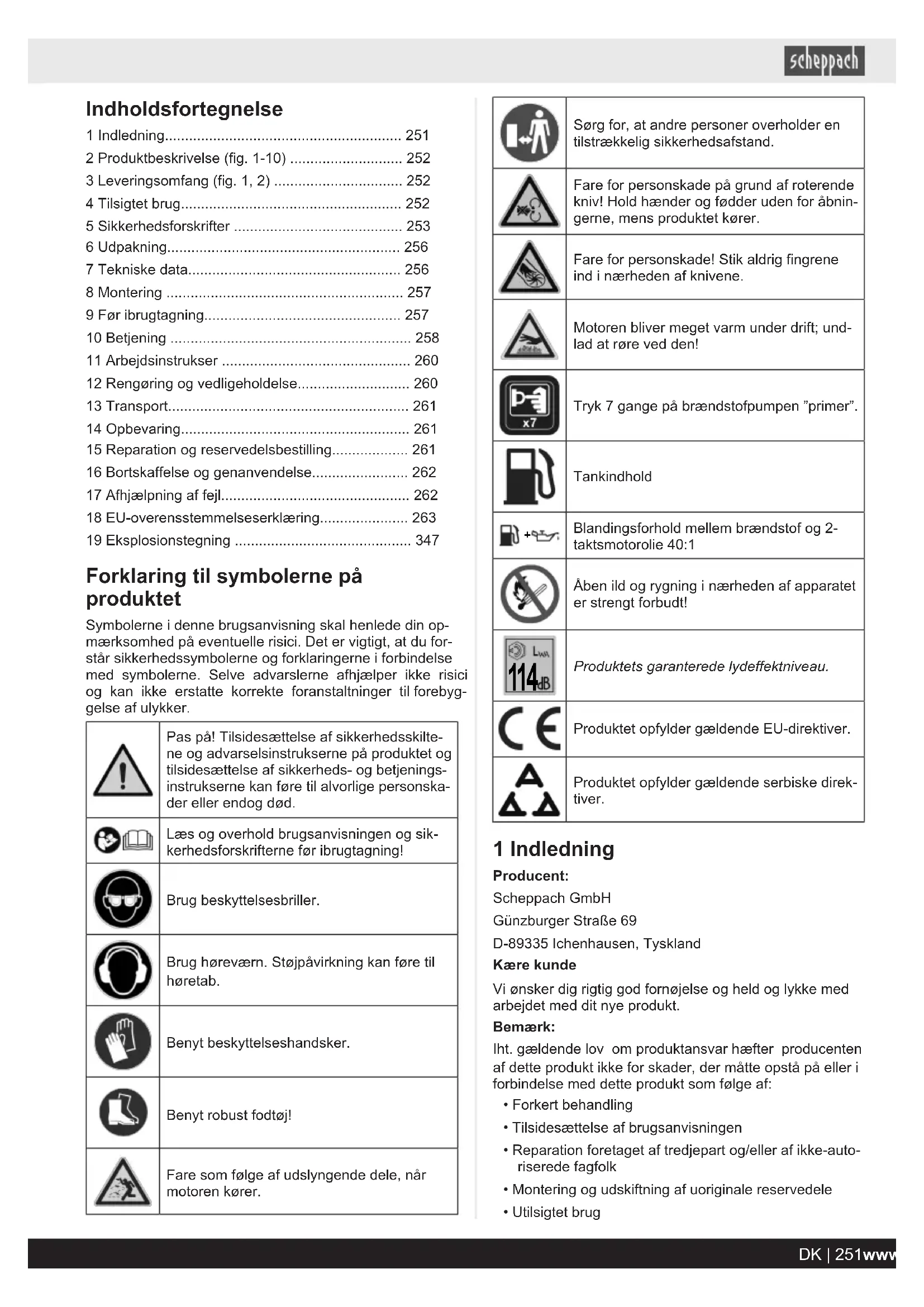 Produktets garanterede lydeffektniveau. Produktet opfylder gældende EU-direktiver. Produktet opfylder gældende serbiske direk- tiver. 1 Indledning Producent: Scheppach GmbH Günzburger Straße 69 D-89335 Ichenhausen, Tyskland Kære kunde Vi ønsker dig rigtig god fornøjelse og held og lykke med arbejdet med dit nye produkt. Bemærk: Iht. gældende lov om produktansvar hæfter producenten af dette produkt ikke for skader, der måtte opstå på eller i forbindelse med dette produkt som følge af:
