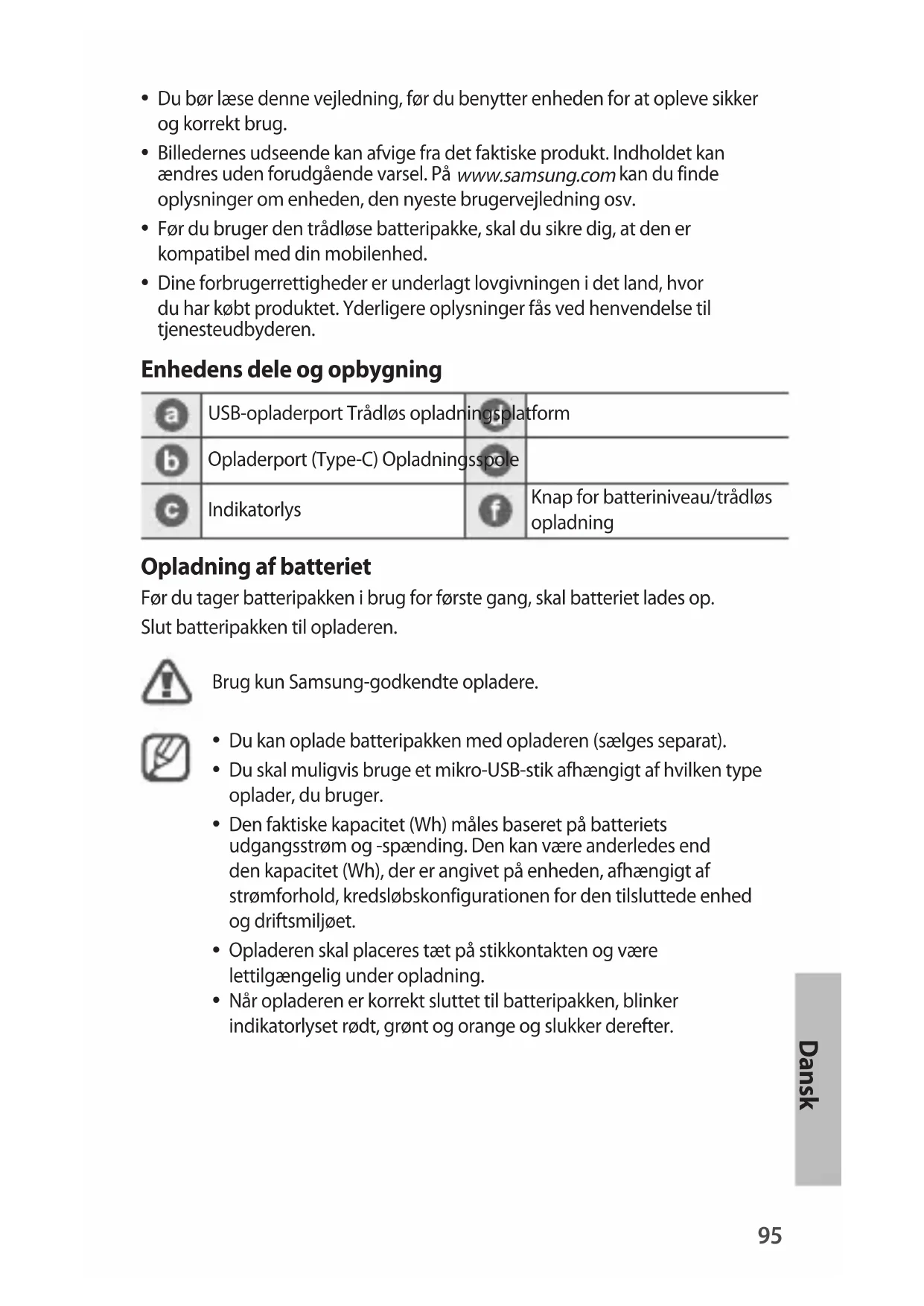 - Hvis du foretager et opkald, mens tradløs opladning er i gang., kan der opsta problemer med forbindelsen. Du skal forst fjerne den mobile enhed fra batteripakken.