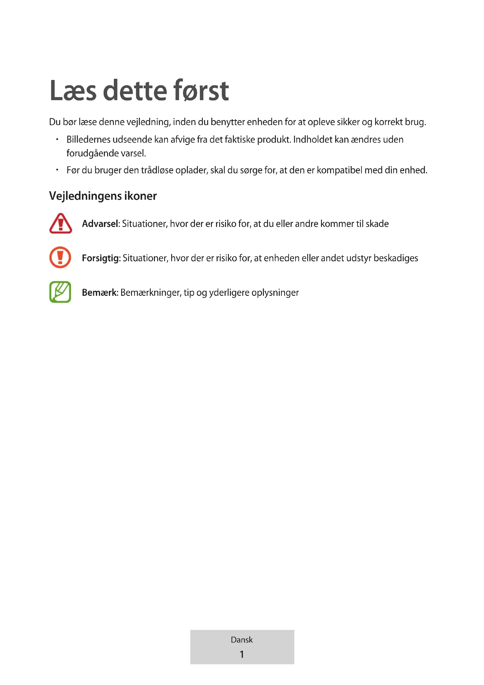 Før du bruger den trådløse oplader, skal du sørge for, at den er kompatibel med din enhed. Vejledningens ikoner Advarsel: Situationer, hvor der er risiko for, at du eller andre kommer til skade Forsigtig: Situationer, hvor der er risiko for, at enheden eller andet udstyr beskadiges Bemærk: Bemærkninger, tip og yderligere oplysninger2 Dansk Kom godt i gang Pakkens indhold Kontroller, at æsken indeholder følgende: