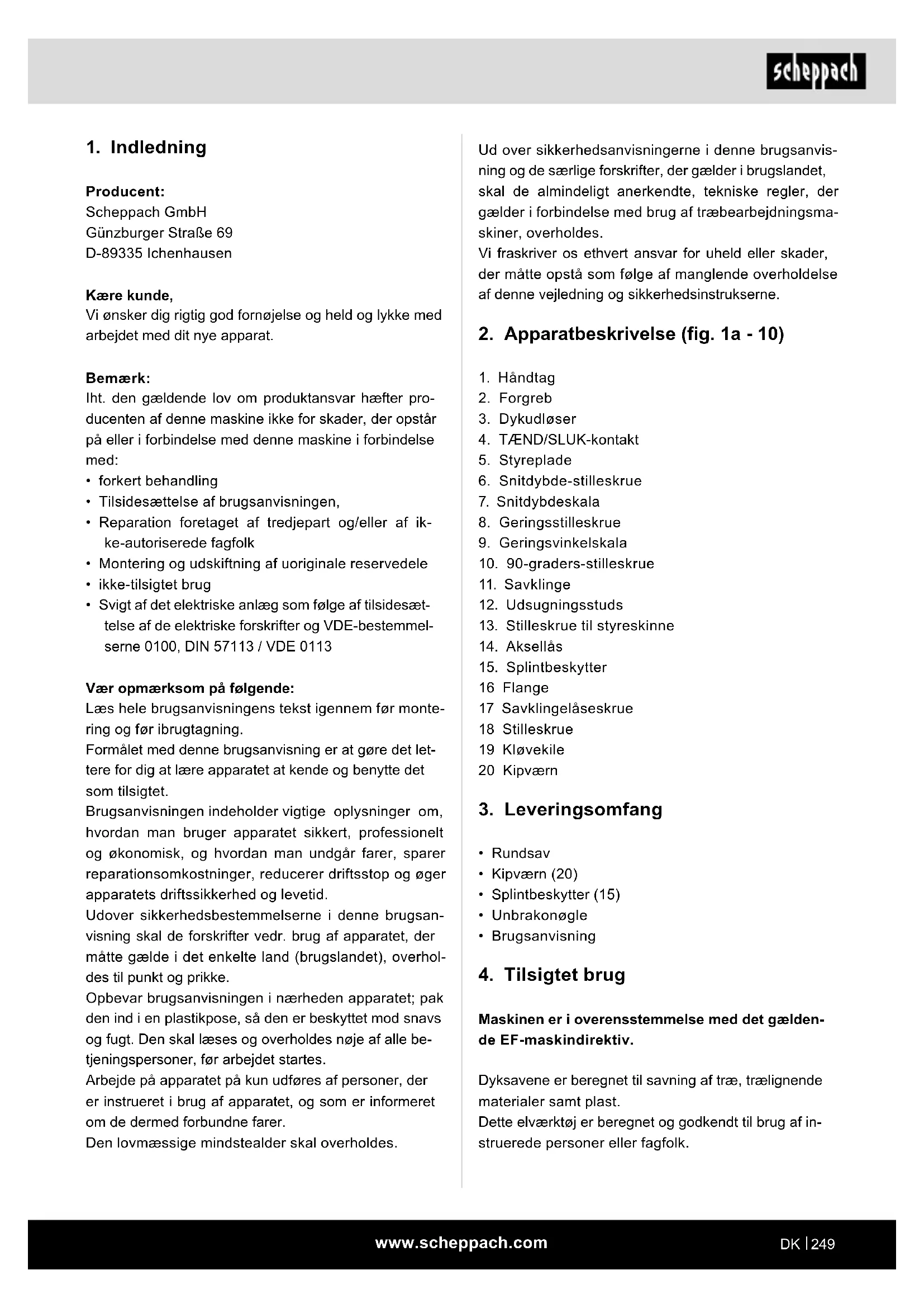 - Svigt af det elektriske anlæg som følge af tilsidesæt- telse af de elektriske forskrifter og VDE-bestemmel- serne 0100, DIN 57113 / VDE 0113 Vær opmærksom på følgende: Læs hele brugsanvisningens tekst igennem før monte- ring og før ibrugtagning. Formålet med denne brugsanvisning er at gøre det let- tere for dig at lære apparatet at kende og benytte det som tilsigtet. Brugsanvisningen indeholder vigtige oplysninger om, hvordan man bruger apparatet sikkert, professionelt og økonomisk, og hvordan man undgår farer, sparer reparationsomkostninger, reducerer driftsstop og øger apparatets driftssikkerhed og levetid. Udover sikkerhedsbestemmelserne i denne brugsan- visning skal de forskrifter vedr. brug af apparatet, der måtte gælde i det enkelte land (brugslandet), overhol- des til punkt og prikke. Opbevar brugsanvisningen i nærheden apparatet; pak den ind i en plastikpose, så den er beskyttet mod snavs og fugt. Den skal læses og overholdes nøje af alle be- tjeningspersoner, før arbejdet startes. Arbejde på apparatet på kun udføres af personer, der er instrueret i brug af apparatet, og som er informeret om de dermed forbundne farer. Den lovmæssige mindstealder skal overholdes.www.scheppach.com