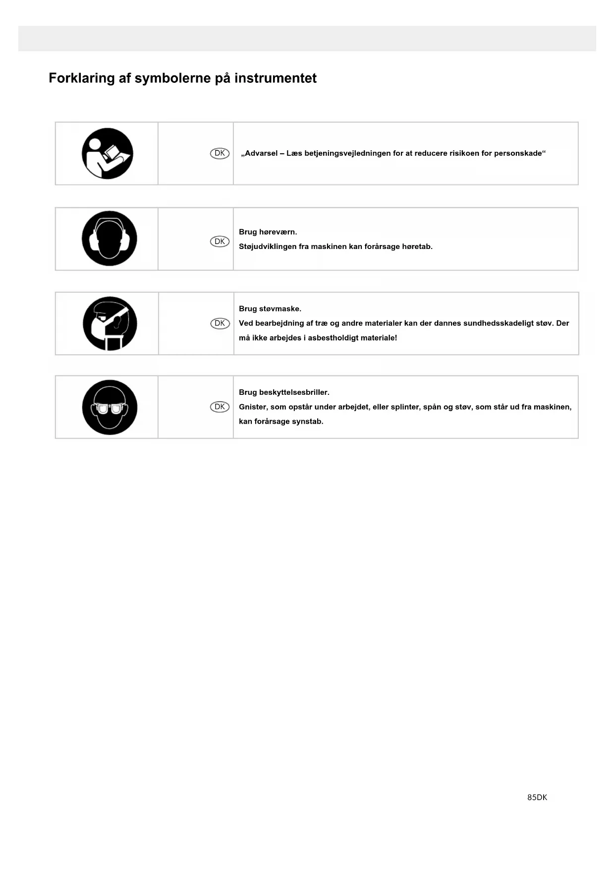 Brug støvmaske. Ved bearbejdning af træ og andre materialer kan der dannes sundhedsskadeligt støv. Der må ikke arbejdes i asbestholdigt materiale!86 DK