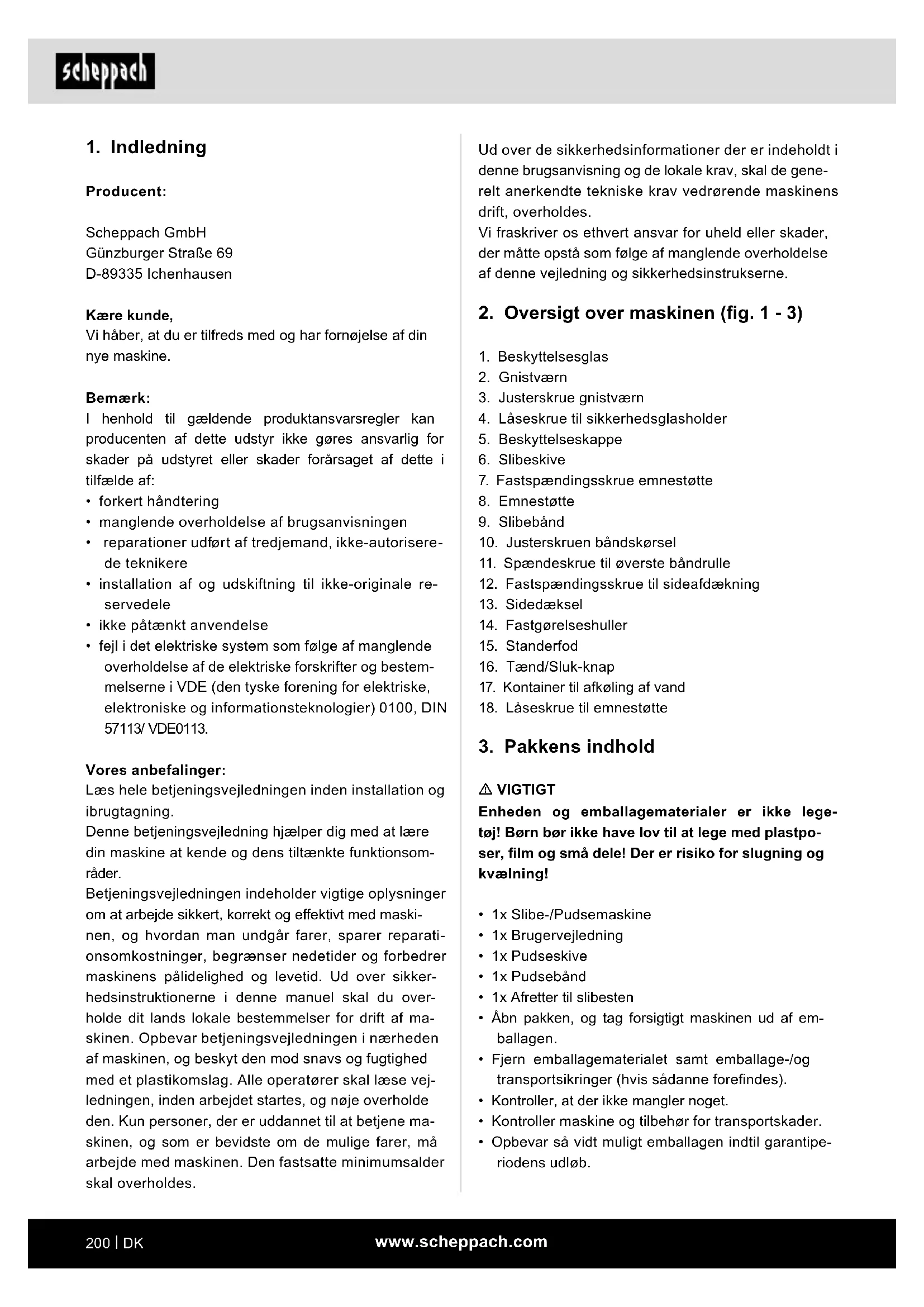 Producent: Scheppach GmbH Günzburger Straße 69 D-89335 Ichenhausen Kære kunde, Vi håber, at du er tilfreds med og har fornøjelse af din nye maskine. Bemærk: I henhold til gældende produktansvarsregler kan producenten af dette udstyr ikke gøres ansvarlig for skader på udstyret eller skader forårsaget af dette i tilfælde af: