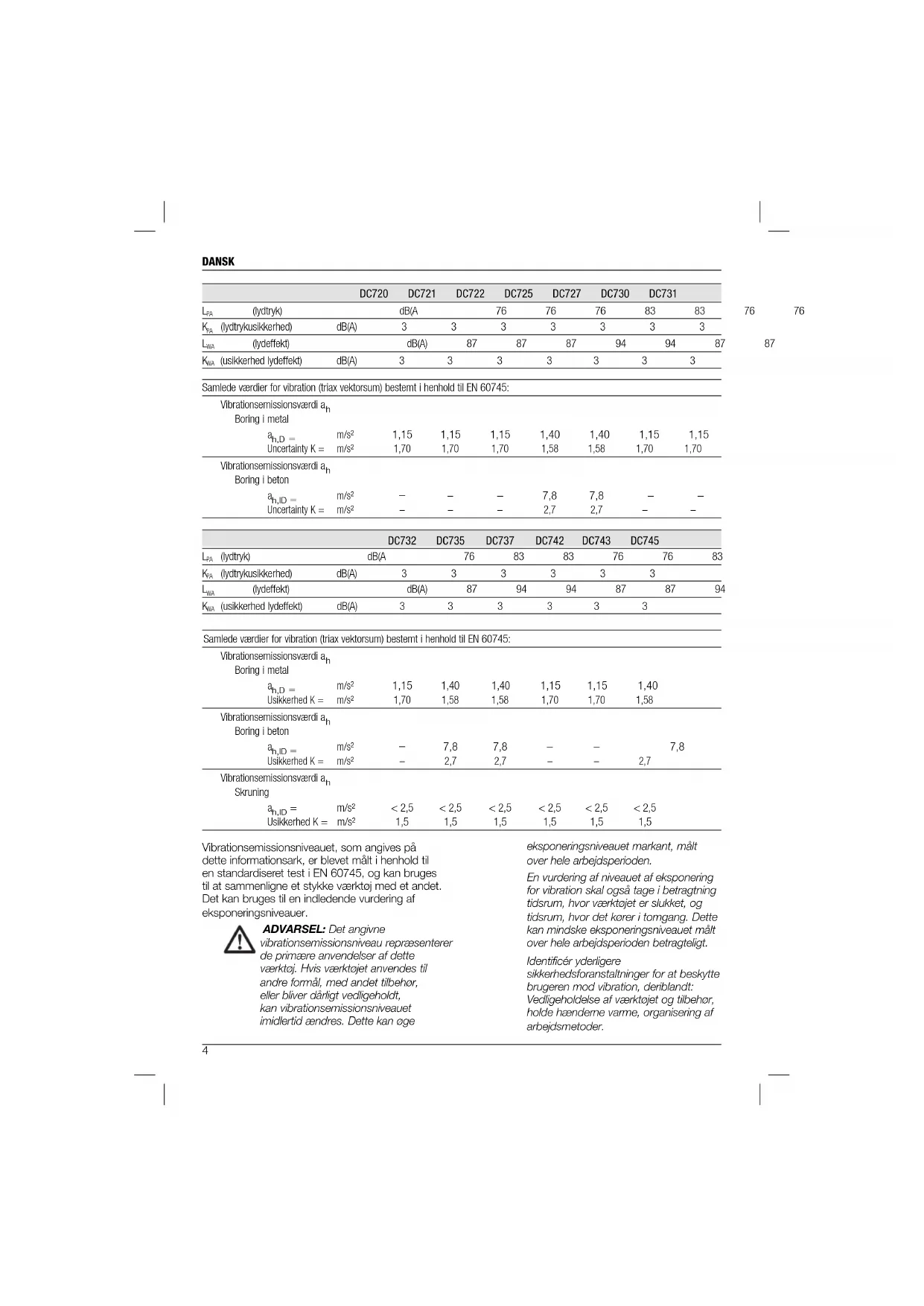 h,ID = m/s² < 2,5 < 2,5 < 2,5 < 2,5 < 2,5 < 2,5 Usikkerhed K = m/s² 1,5 1,5 1,5 1,5 1,5 1,5 Vibrationsemissionsniveauet, som angives på dette informationsark, er blevet målt i henhold til en standardiseret test i EN 60745, og kan bruges til at sammenligne et stykke værktøj med et andet. Det kan bruges til en indledende vurdering af eksponeringsniveauer. ADVARSEL: Det angivne vibrationsemissionsniveau repræsenterer de primære anvendelser af dette værktøj. Hvis værktøjet anvendes til andre formål, med andet tilbehør, eller bliver dårligt vedligeholdt, kan vibrationsemissionsniveauet imidlertid ændres. Dette kan øge eksponeringsniveauet markant, målt over hele arbejdsperioden. En vurdering af niveauet af eksponering for vibration skal også tage i betragtning tidsrum, hvor værktøjet er slukket, og tidsrum, hvor det kører i tomgang. Dette kan mindske eksponeringsniveauet målt over hele arbejdsperioden betragteligt. Identificér yderligere sikkerhedsforanstaltninger for at beskytte brugeren mod vibration, deriblandt: Vedligeholdelse af værktøjet og tilbehør, holde hænderne varme, organisering af arbejdsmetoder.DANSK