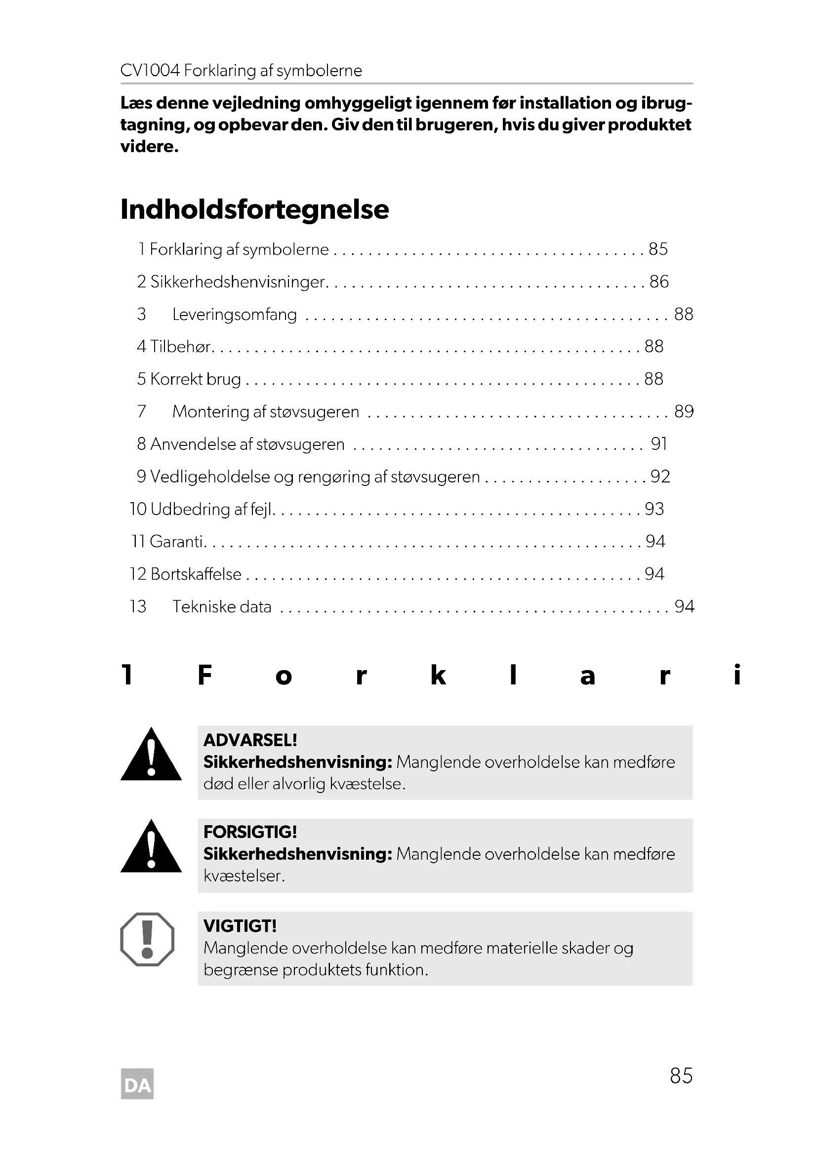 Læn ikke genstande op ad støvsugeren. BEMÆRK Supplerende informationer om betjening af produktet. CV1004-IO-16s.book Seite 86 Dienstag, 13. Februar 2018 5:32 17DA CV1004 Sikkerhedshenvisninger
