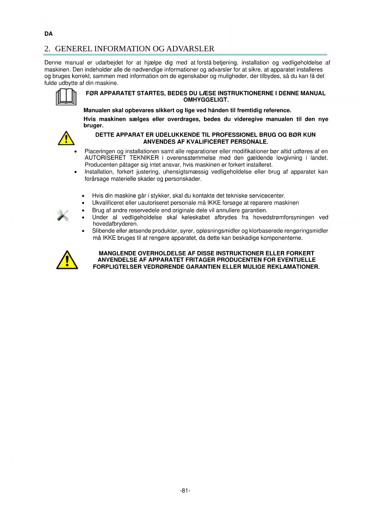 Denne manual er udarbejdet for at hjælpe dig med at forstå betjening, installation og vedligeholdelse af maskinen. Den indeholder alle de nødvendige informationer og advarsler for at sikre, at apparatet installeres og bruges korrekt, sammen med information om de egenskaber og muligheder, der tilbydes, så du kan få det fulde udbytte af din maskine.