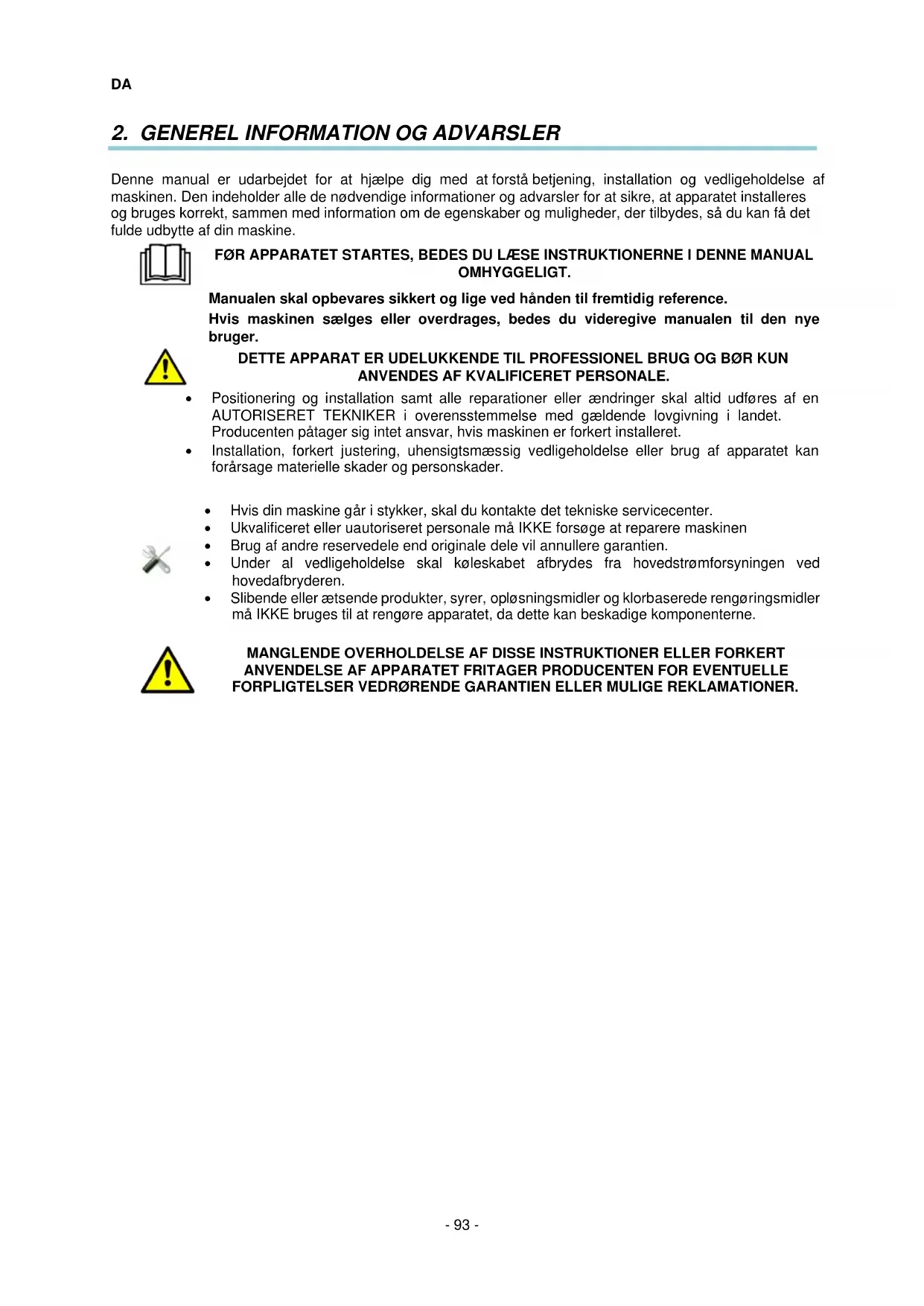 Denne manual er udarbejdet for at hjælpe dig med at forstå betjening, installation og vedligeholdelse af maskinen. Den indeholder alle de nødvendige informationer og advarsler for at sikre, at apparatet installeres og bruges korrekt, sammen med information om de egenskaber og muligheder, der tilbydes, så du kan få det fulde udbytte af din maskine.