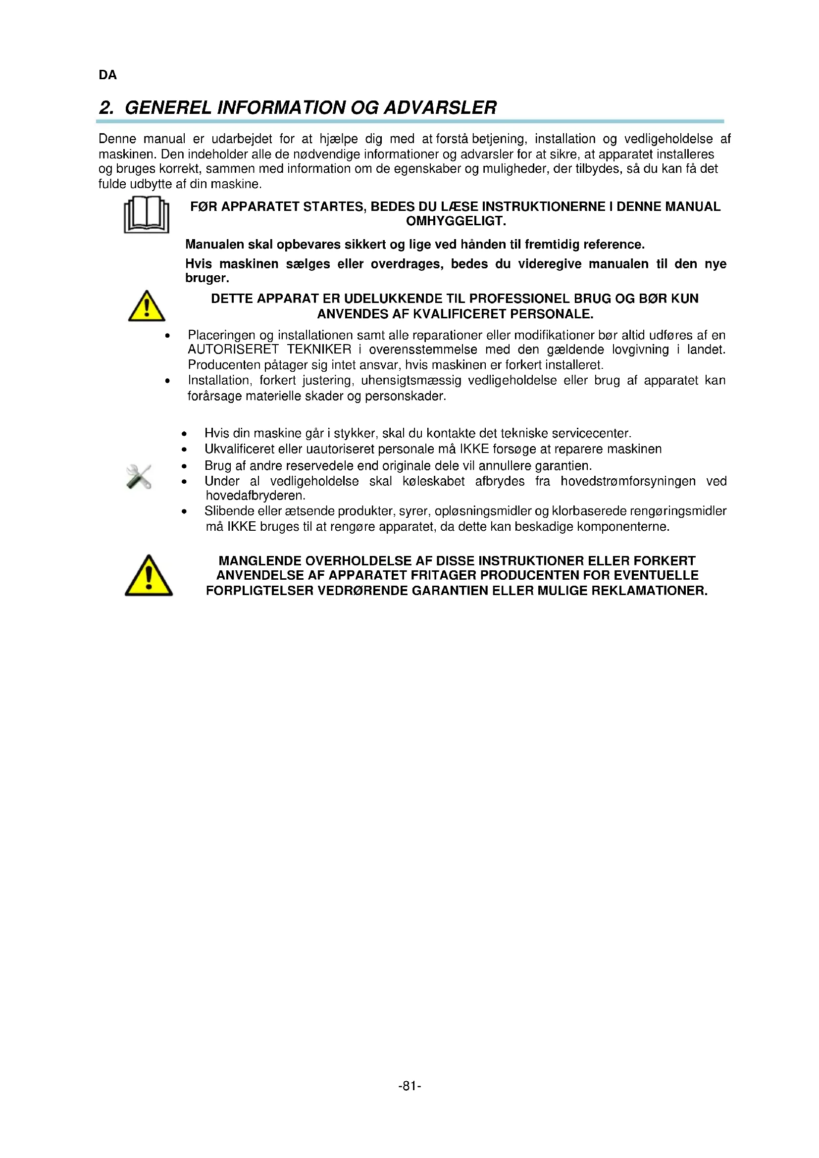 - Placeringen og installationen samt alle reparationer eller modifikationer bør altid udføres af en AUTORISERET TEKNIKER i overensstemmelse med den gældende lovgivning i landet. Producenten påtager sig intet ansvar, hvis maskinen er forkert installeret.