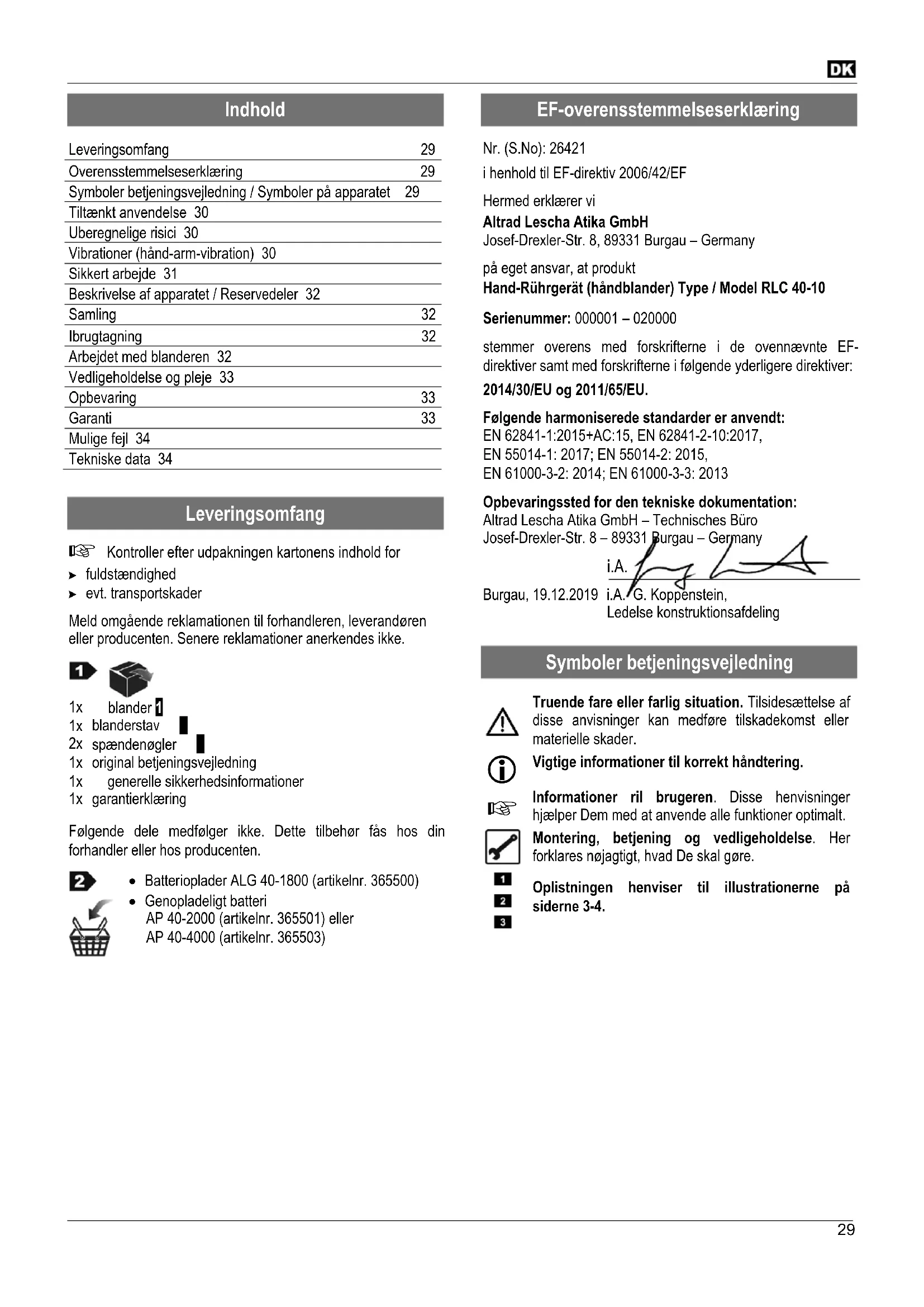 Technické změny vyhrazeny!29 Indhold Leveringsomfang 29 Overensstemmelseserklæring 29 Symboler betjeningsvejledning / Symboler på apparatet 29 Tiltænkt anvendelse 30 Uberegnelige risici 30 Vibrationer (hånd-arm-vibration) 30 Sikkert arbejde 31 Beskrivelse af apparatet / Reservedeler 32 Samling 32 Ibrugtagning 32 Arbejdet med blanderen 32 Vedligeholdelse og pleje 33 Opbevaring 33 Garanti 33 Mulige fejl 34 Tekniske data 34
