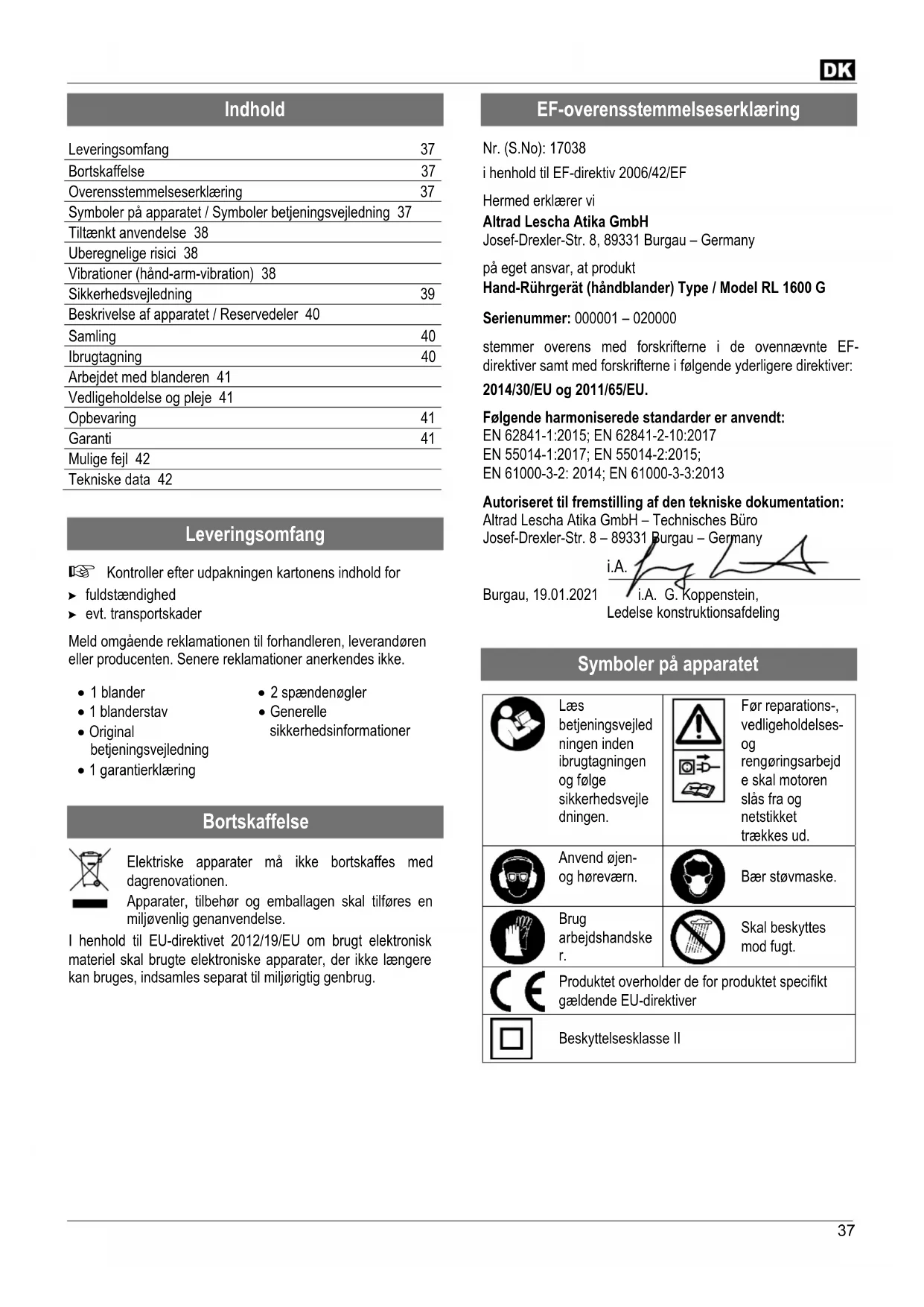 Technické změny vyhrazeny!37 Indhold Leveringsomfang 37 Bortskaffelse 37 Overensstemmelseserklæring 37 Symboler på apparatet / Symboler betjeningsvejledning 37 Tiltænkt anvendelse 38 Uberegnelige risici 38 Vibrationer (hånd-arm-vibration) 38 Sikkerhedsvejledning 39 Beskrivelse af apparatet / Reservedeler 40 Samling 40 Ibrugtagning 40 Arbejdet med blanderen 41 Vedligeholdelse og pleje 41 Opbevaring 41 Garanti 41 Mulige fejl 42 Tekniske data 42
